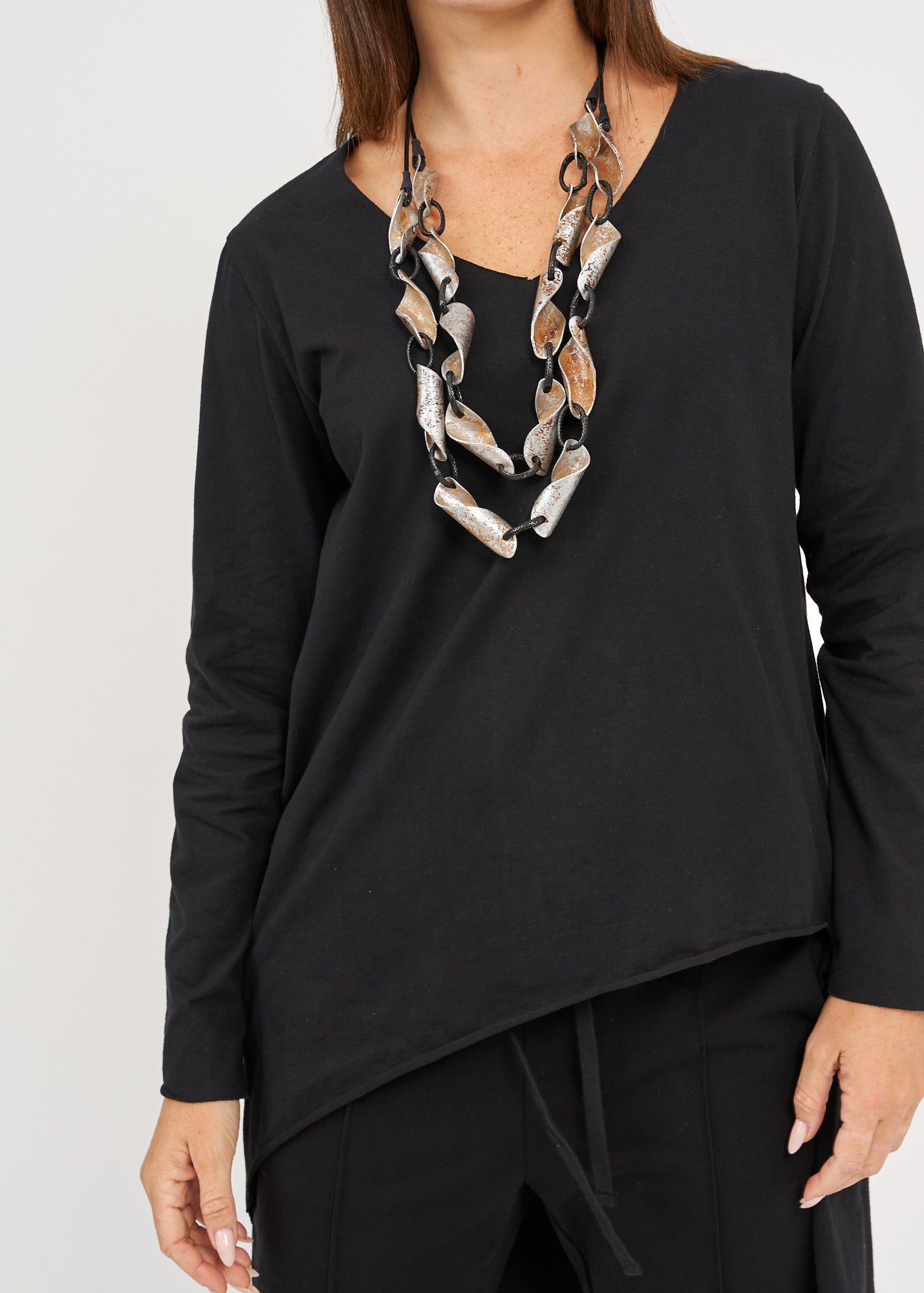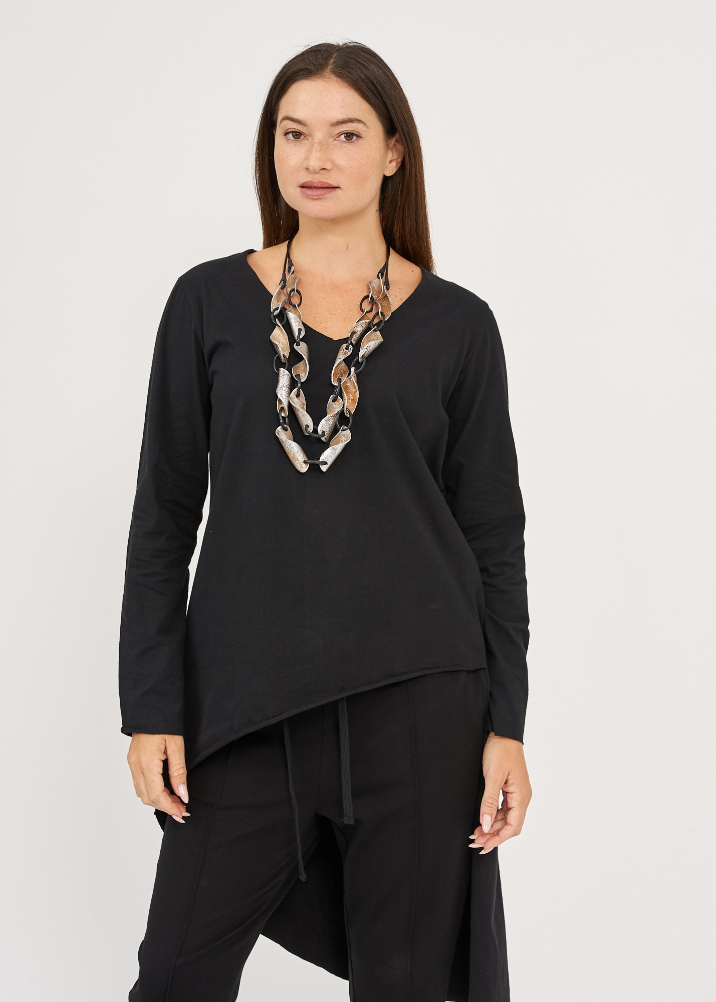 חולצה אלגנטית בגזרה משוחררת המחמיאה לכל מבני גוף ומאפשרת נוחות מקסימלית, בעיצוב ייחודי עם מפתח וי מחמיא בחזית שמאריך את הצוואר ויוצר מראה נשי ומעודן, בשילוב גב ארוך אסימטרי.