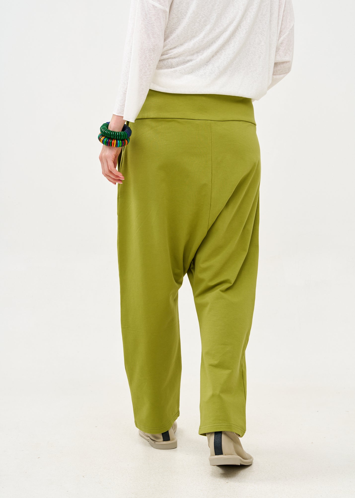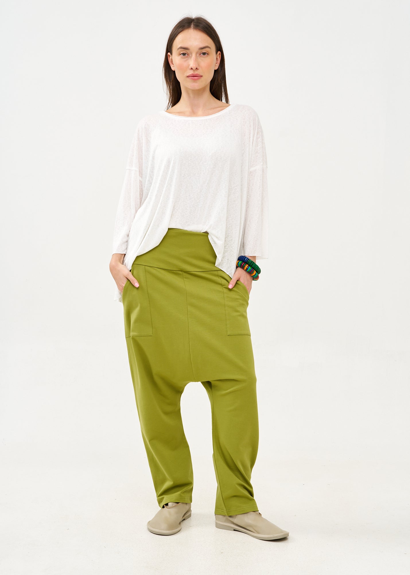 מכנסי שקי מעוצבים עם מותן גבוהה, רחבה ומחמיאה בגזרה מיוחדת עם מפשעה נמוכה וכיסים צדדיים ומרווחים.