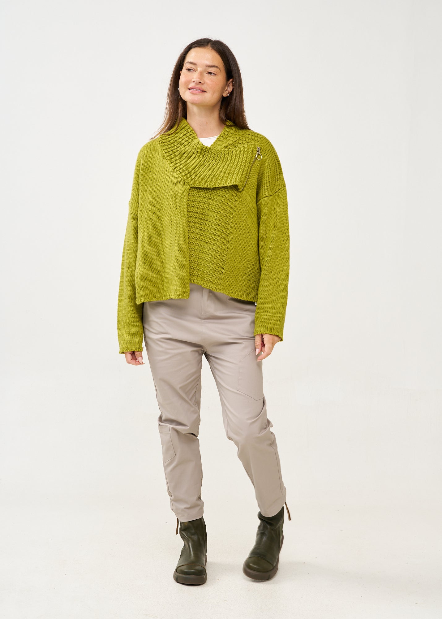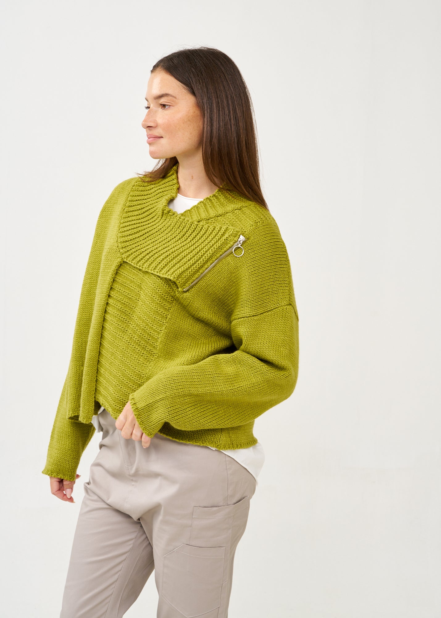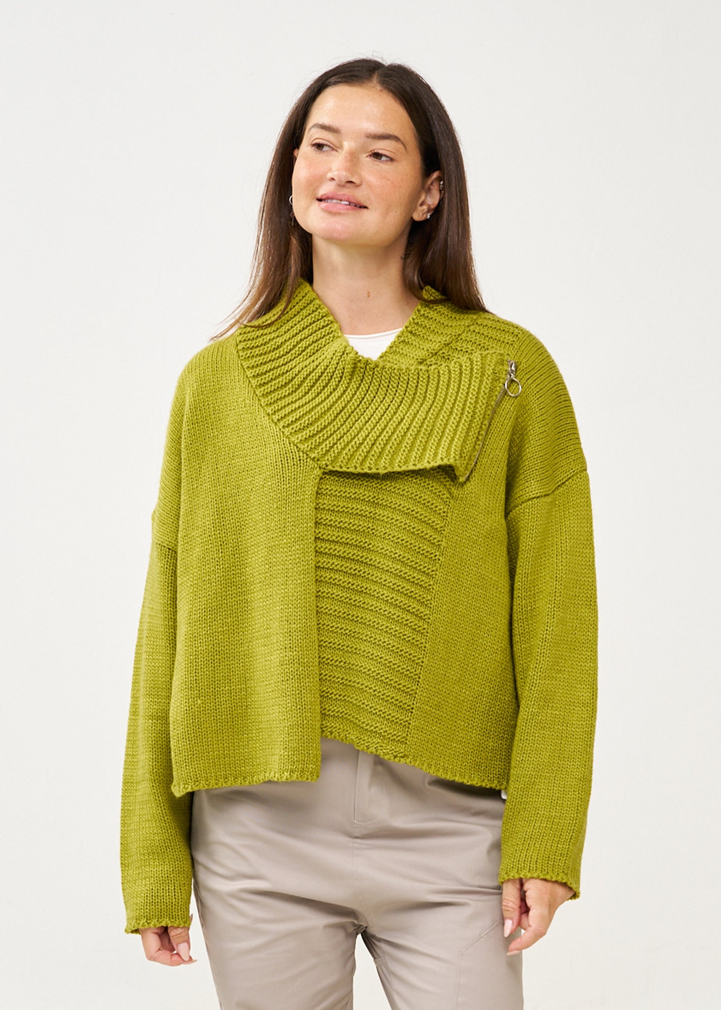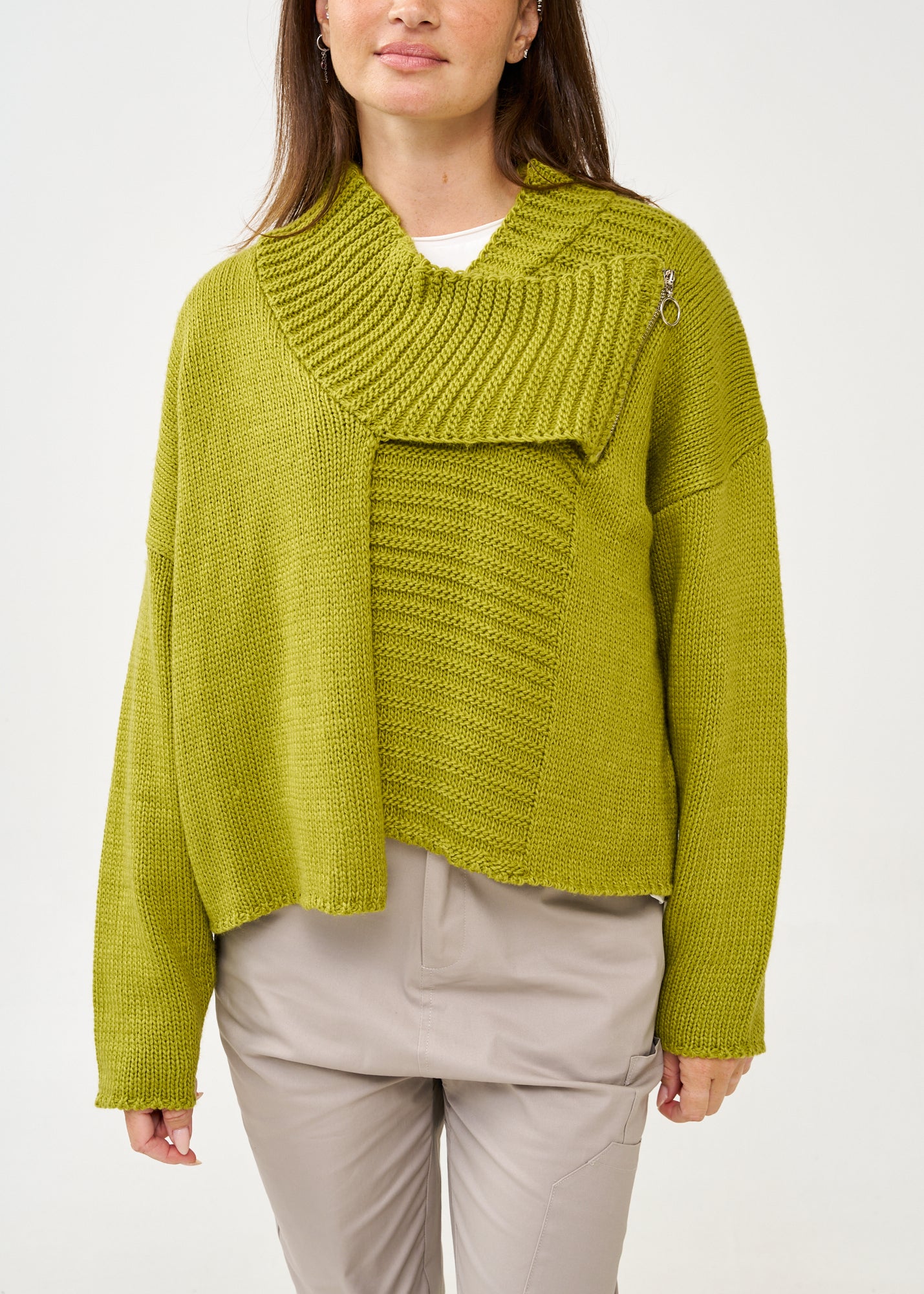 סריג קרופ אסימטרי בעיצוב חדשני עם צווארון גבוה מתקפל ושרוולים ארוכים בסריגת ריב, בעל סיומת מעוצבת אסימטרית ורוכסן דקורטיבי בחזית.