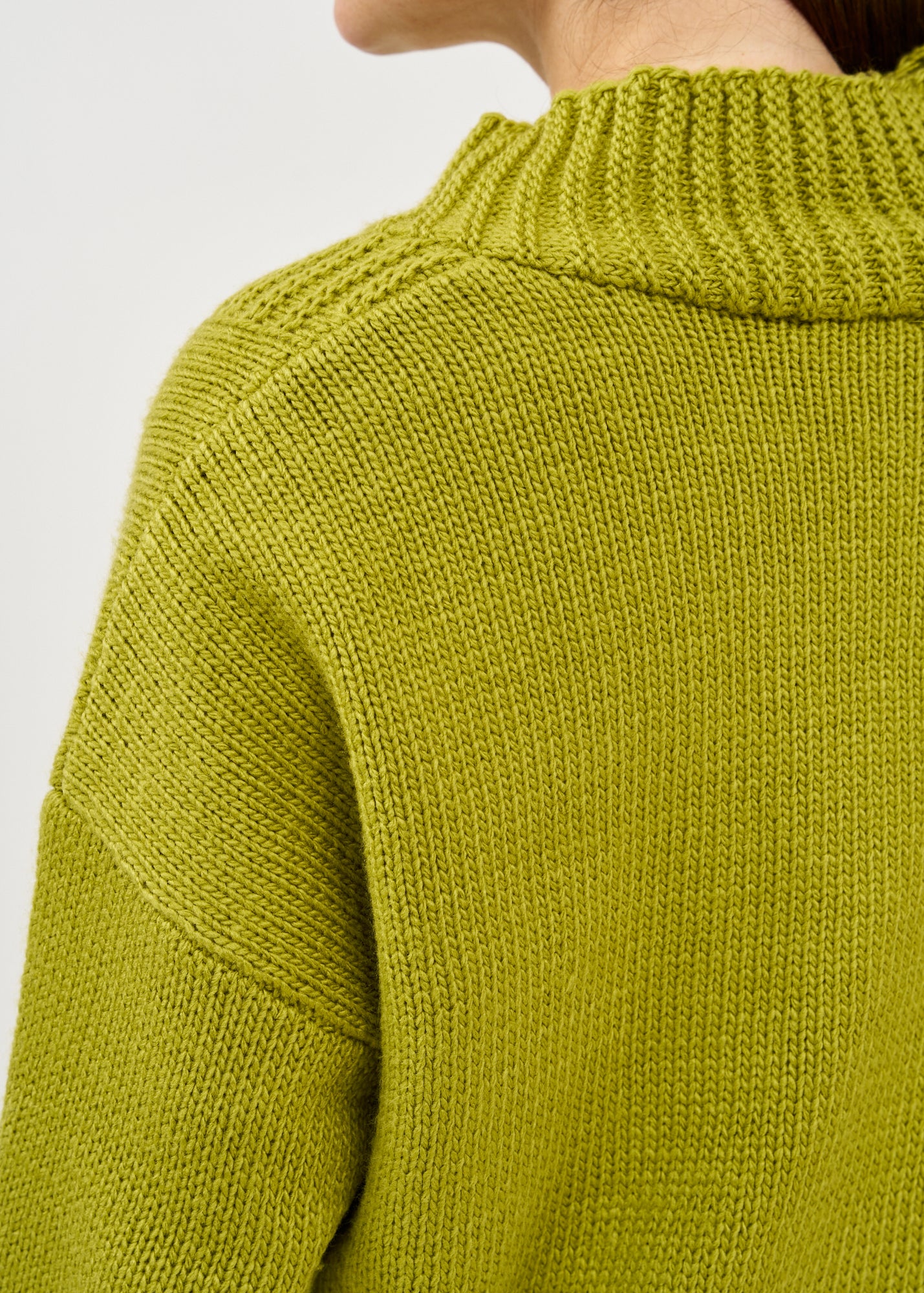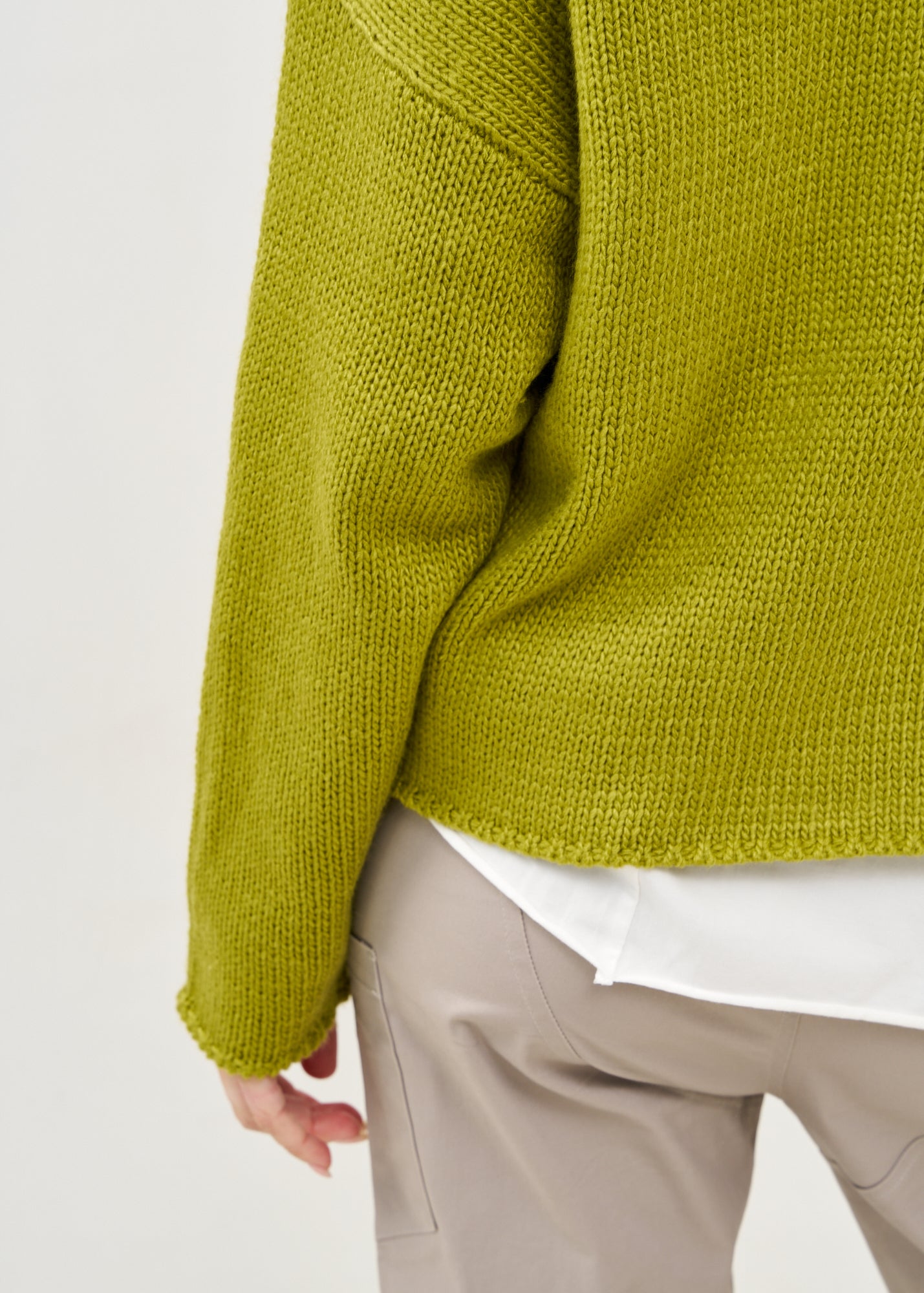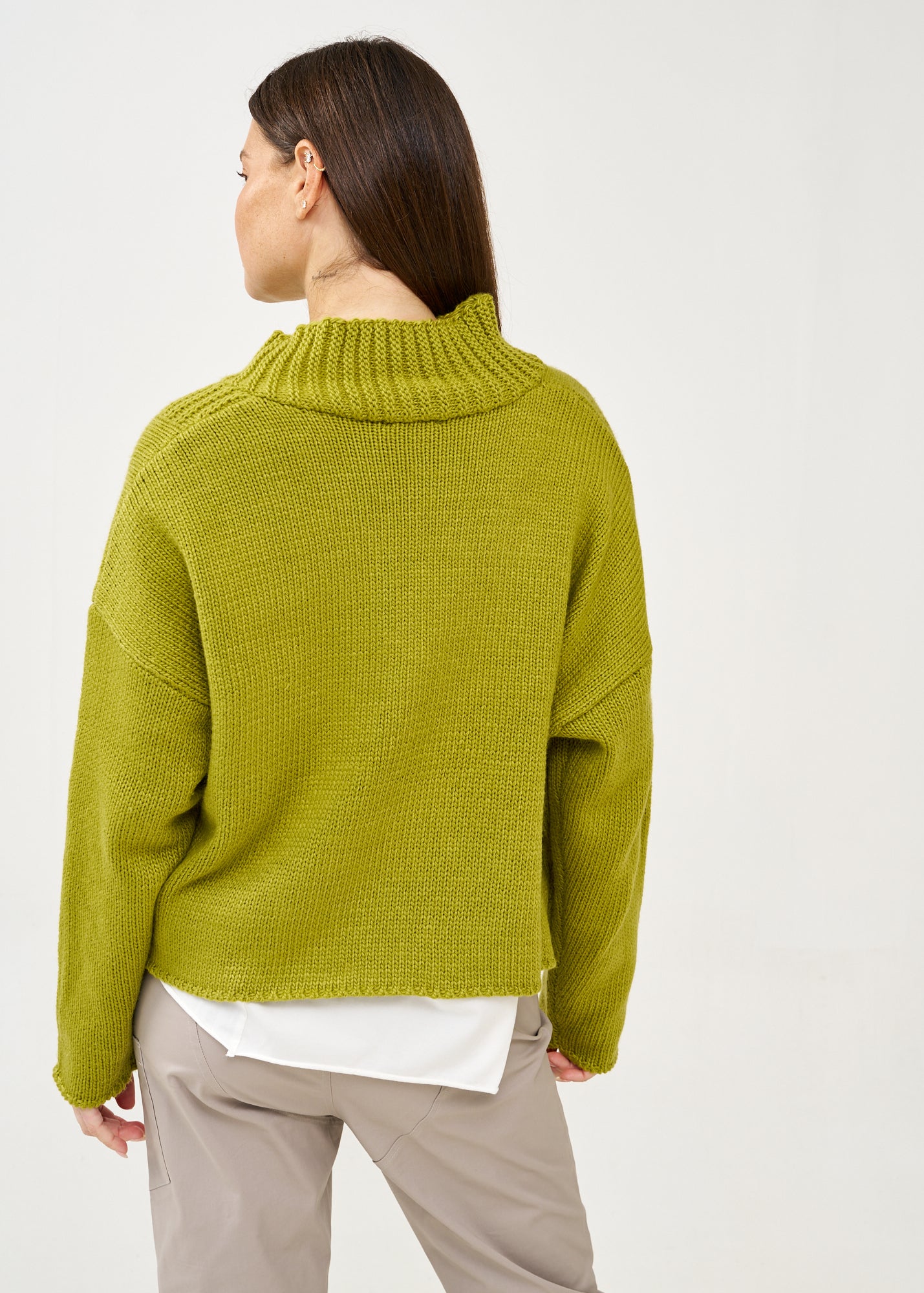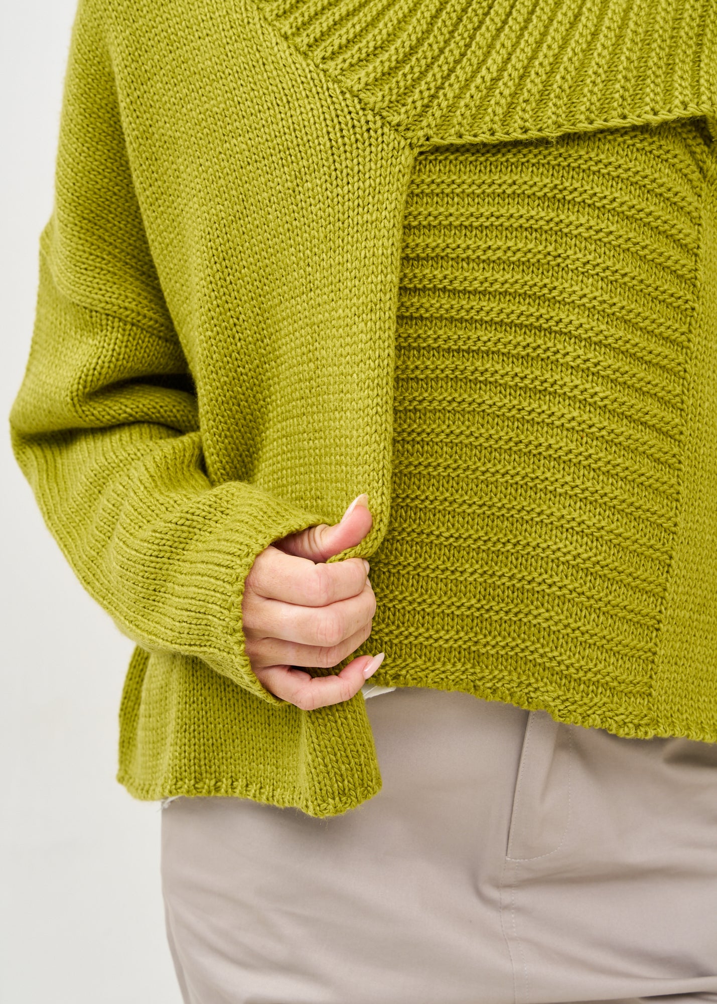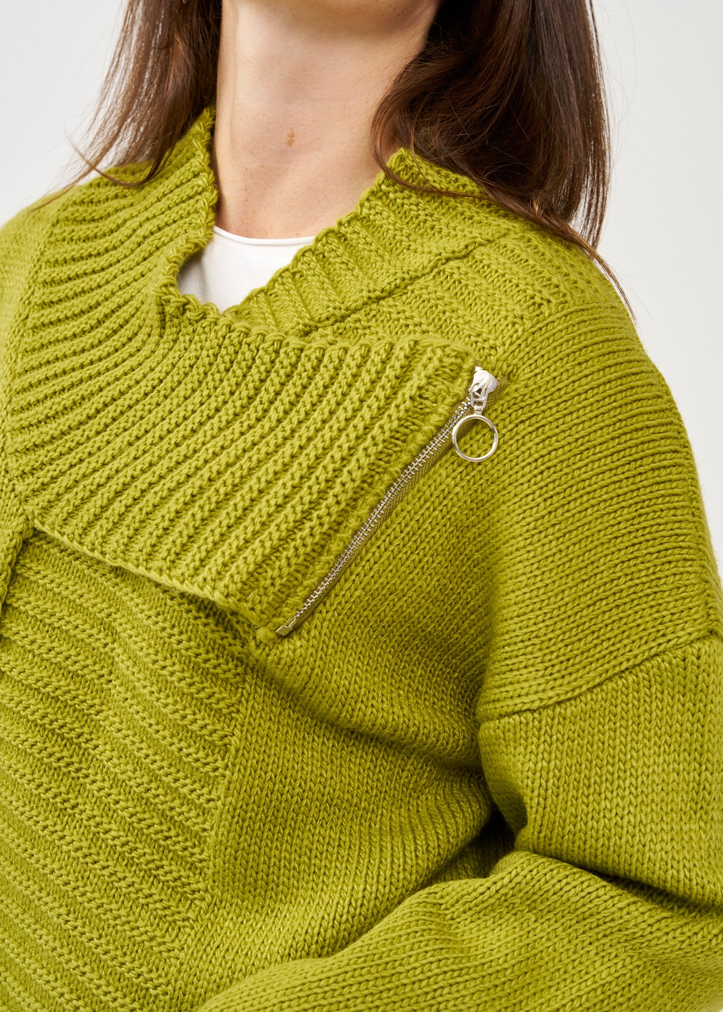 סריג קרופ אסימטרי בעיצוב חדשני עם צווארון גבוה מתקפל ושרוולים ארוכים בסריגת ריב, בעל סיומת מעוצבת אסימטרית ורוכסן דקורטיבי בחזית.