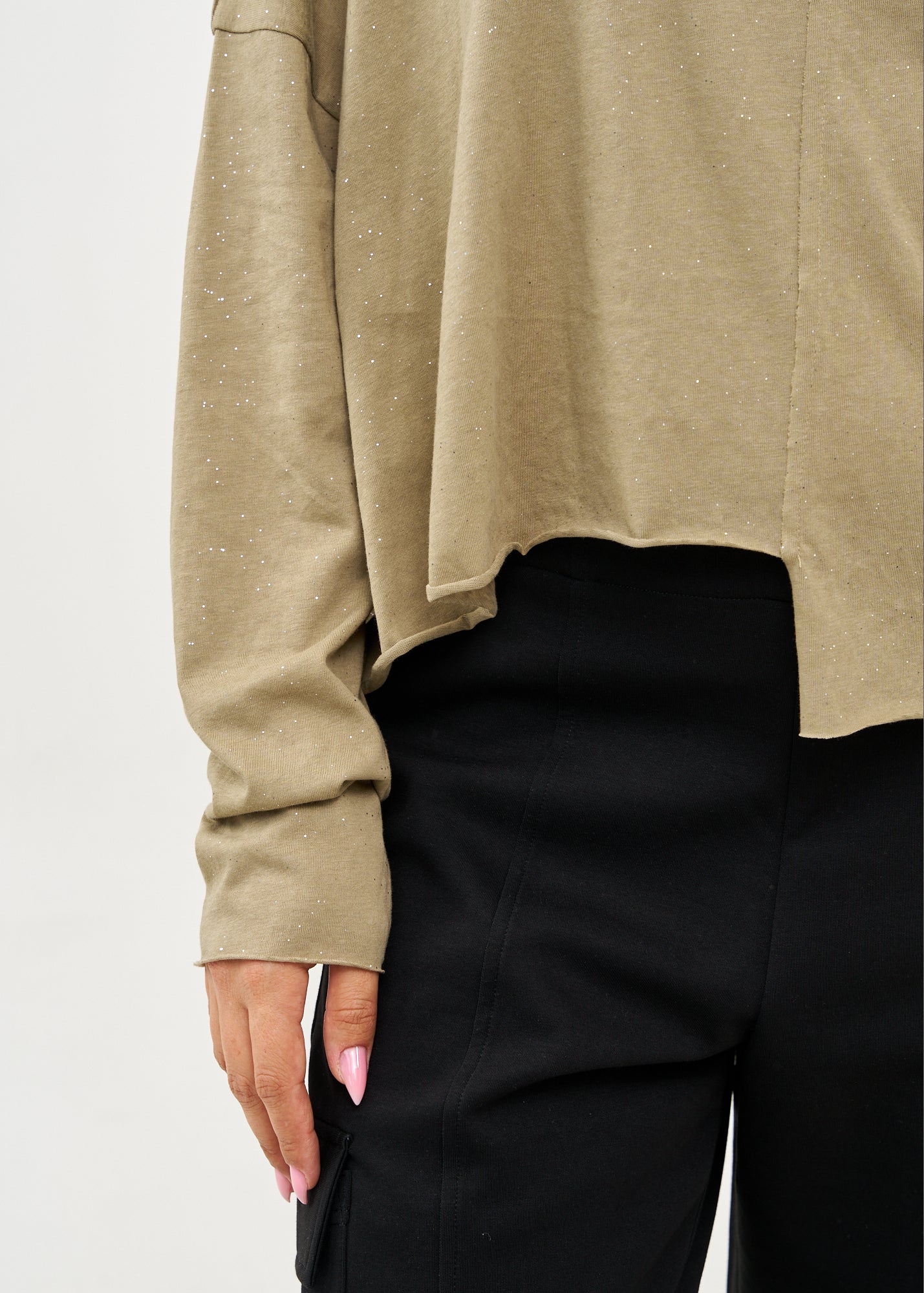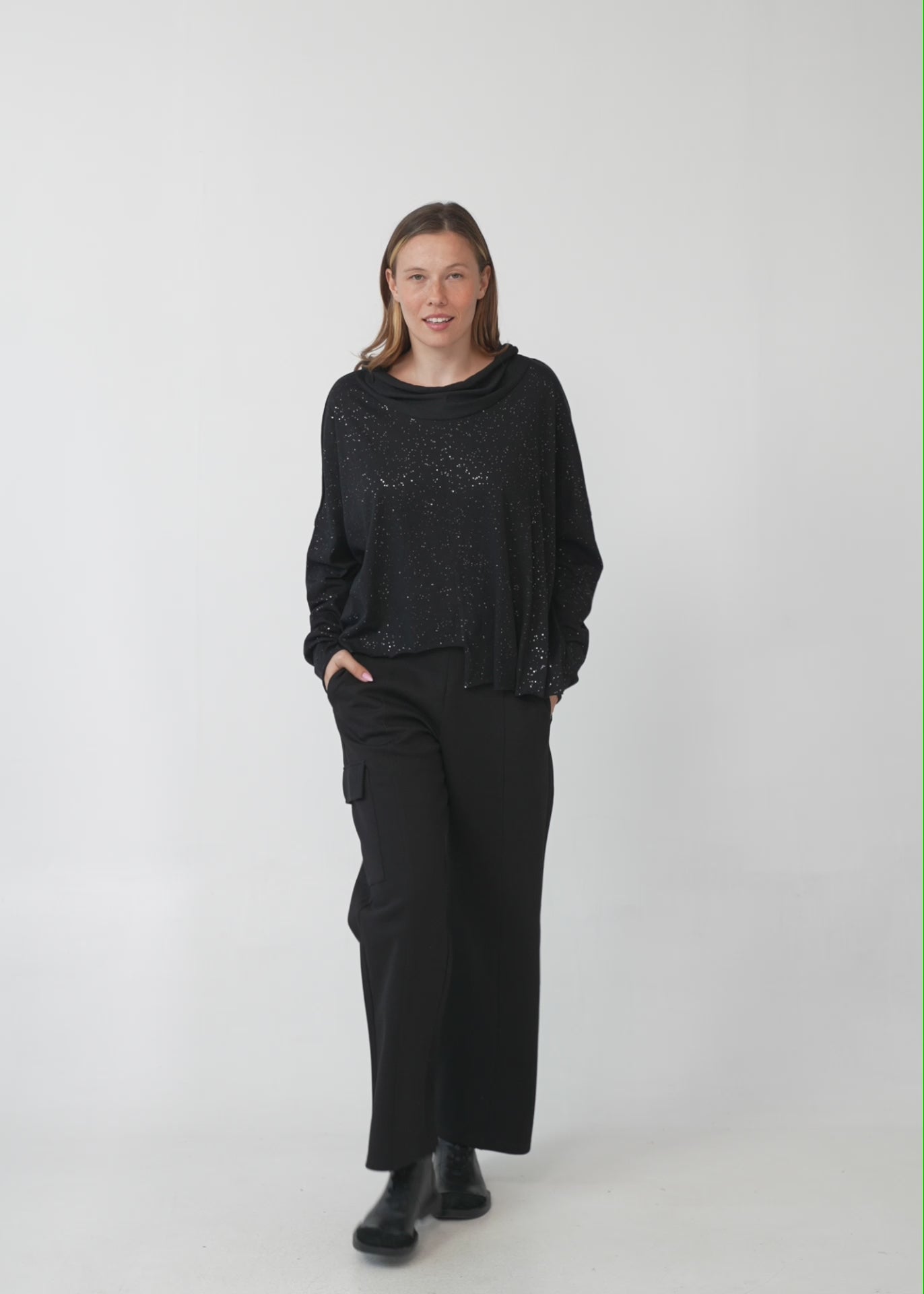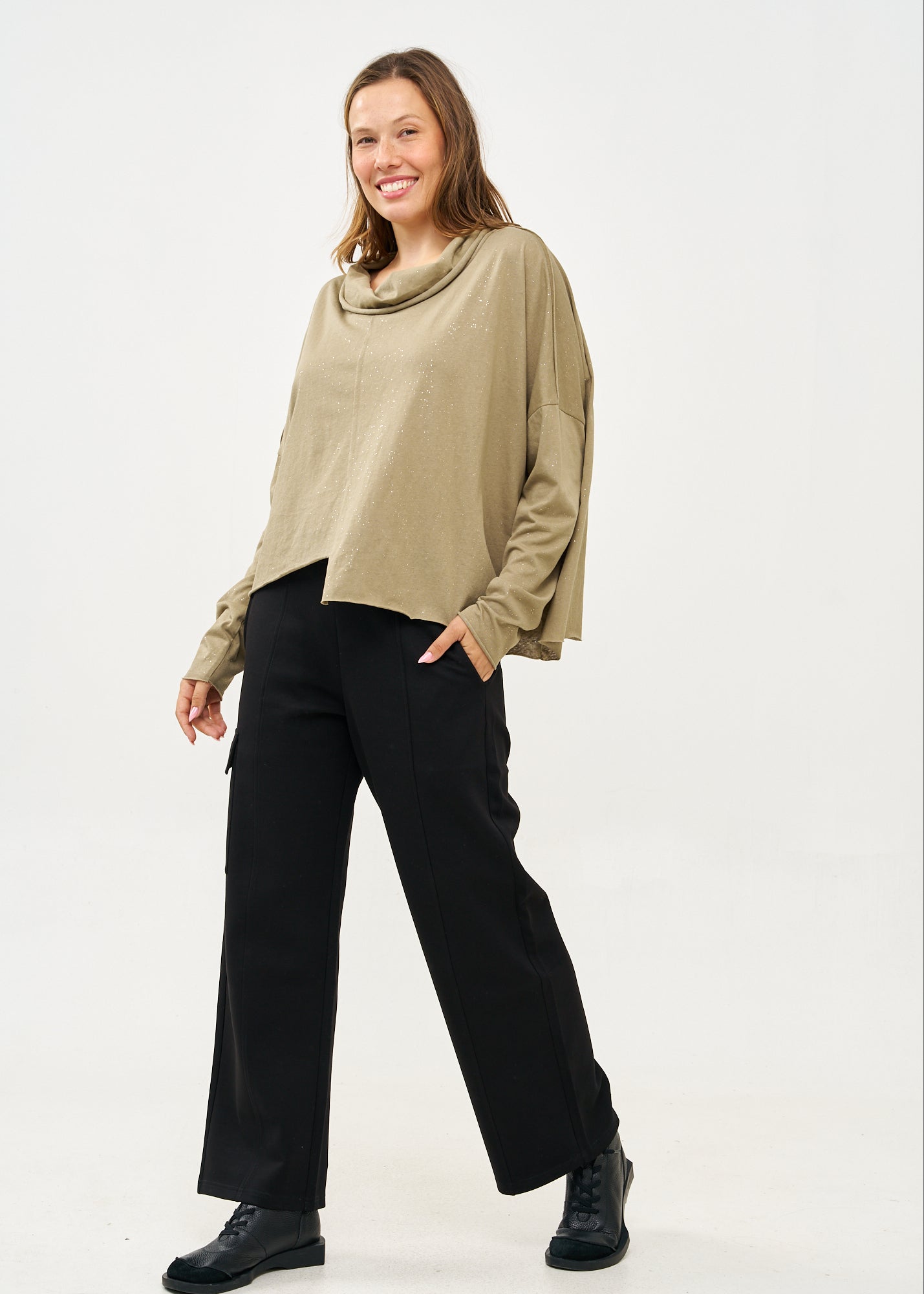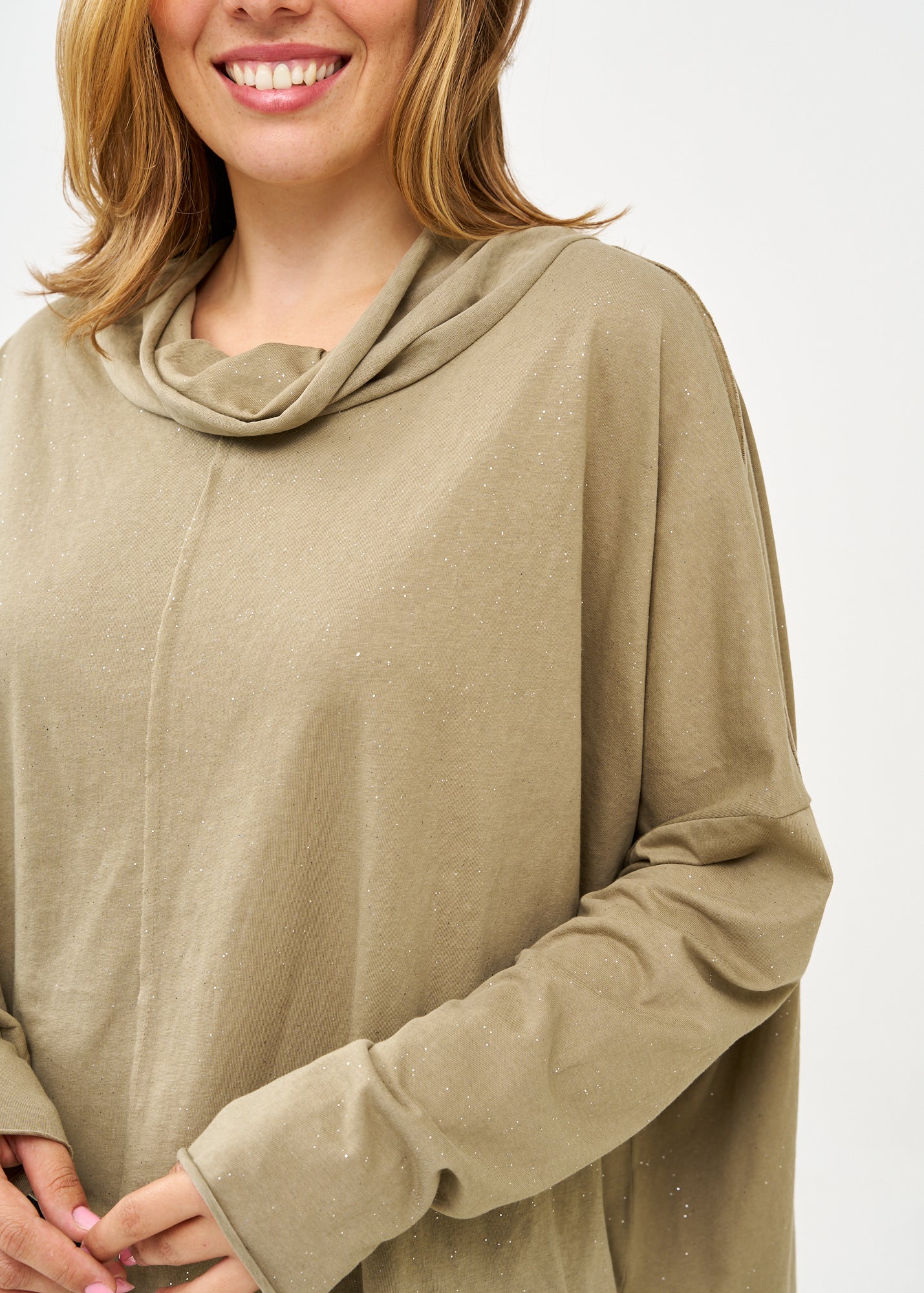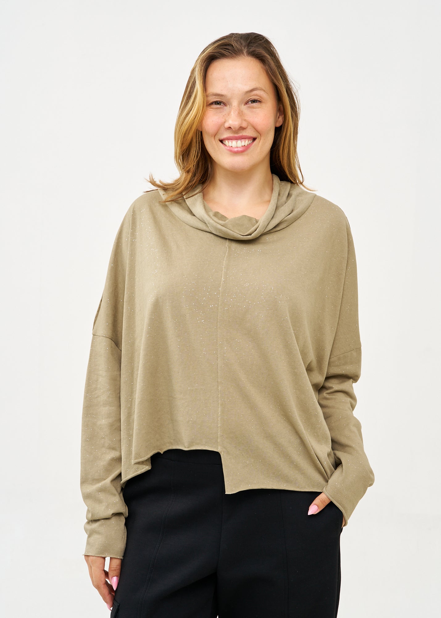 חולצה מרהיבה ומנצנצת בעלת שרוולים ארוכים עם גימור מוקפד וסיומת משוחררת ומעוצבת המתנוססת באופן אסימטרי, עם צווארון גולף רחב ומחמם בגזרת אוברסייז משוחררת המשלבת נוחות מקסימלית עם נוכחות אופנתית בלתי נשכחת.