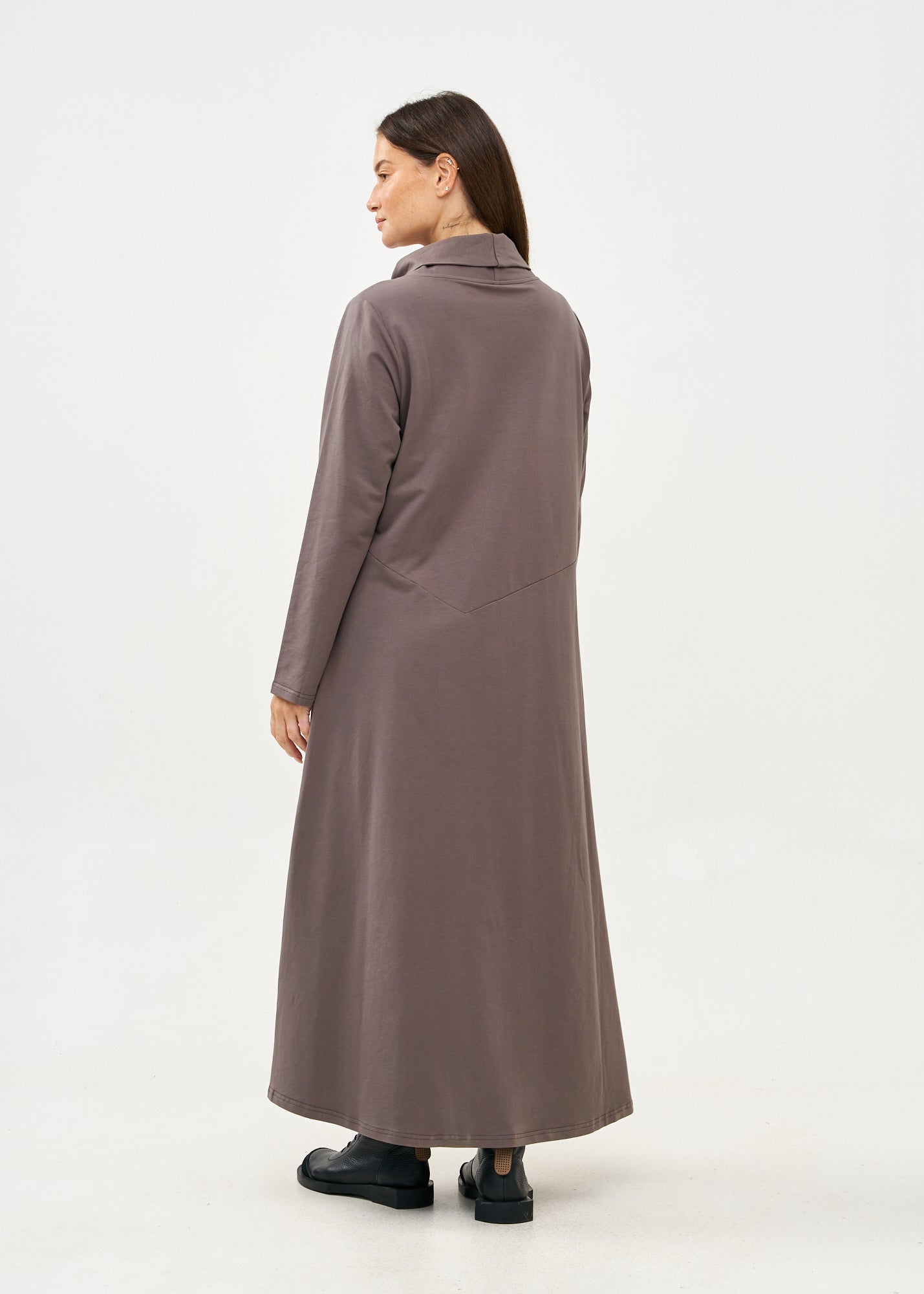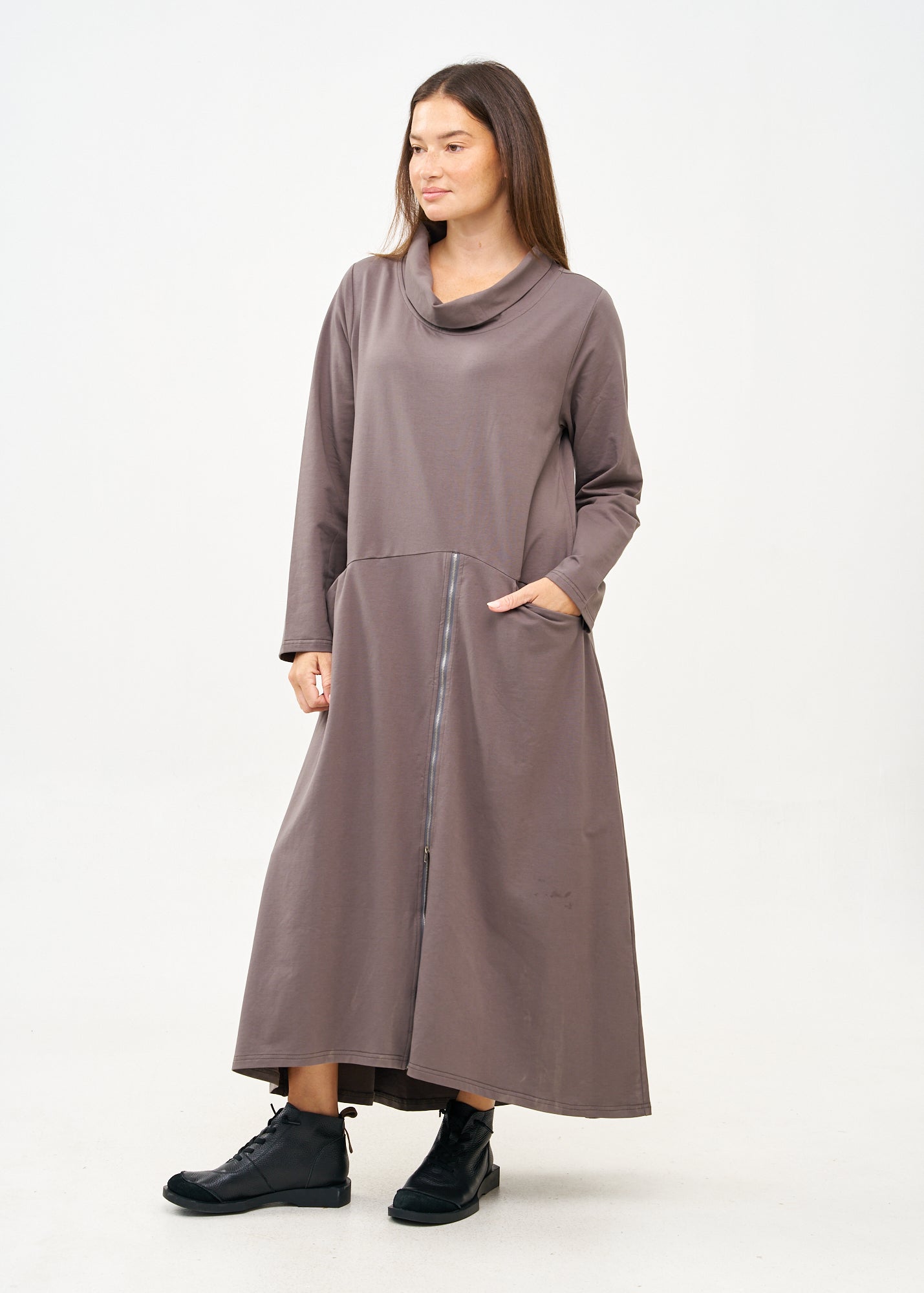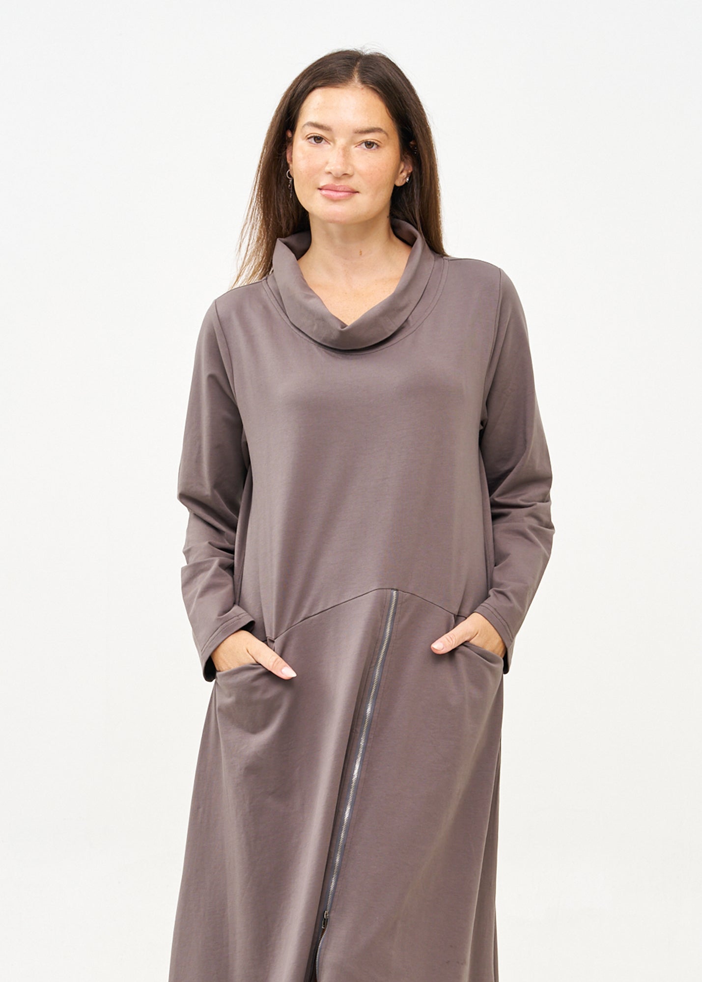 שמלת מקסי אלגנטית ונוחה בגזרה משוחררת עם צווארון גולף רחב ומחמיא, שרוולים ארוכים וכיסים צדדיים עמוקים. בעלת עיצוב ייחודי עם רוכסן מתכת מלא באלכסון המשתרע לאורך כל החזית ומאפשר גמישות בלבישה.