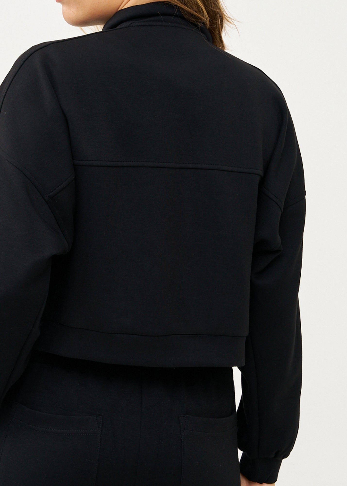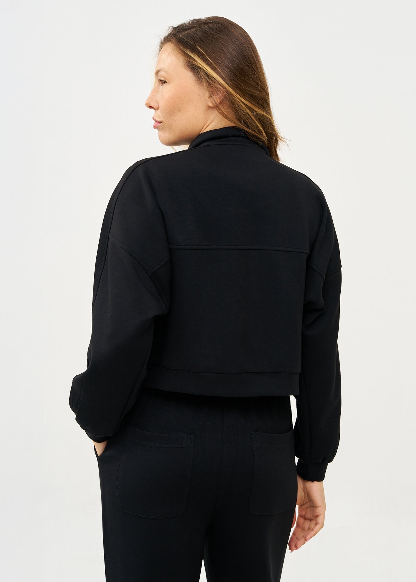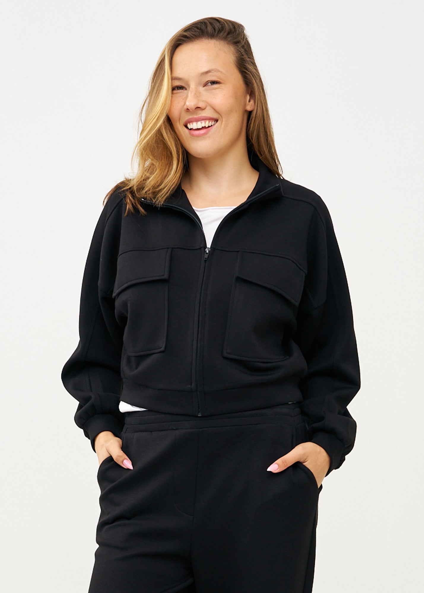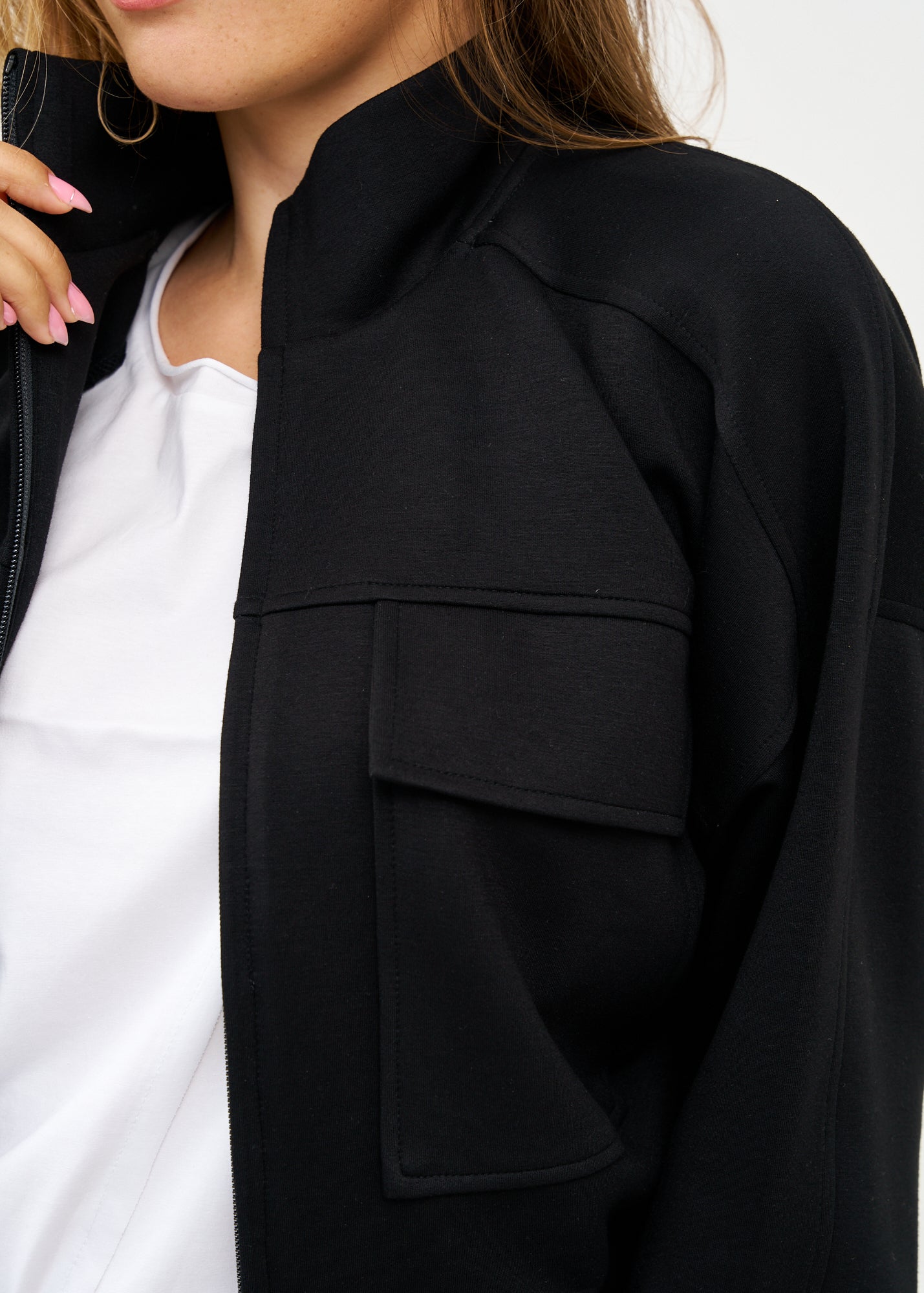 ג'קט מעוצב ונוח בגזרה קצרה ומשוחררת המחמיאה לכל מבנה גוף. הפריט בעל צווארון עומד אלגנטי עם סגירת רוכסן מרכזית ואיכותית, שני כיסים קדמיים בולטים ושרוולים ארוכים בגימור אלסטי עדין.