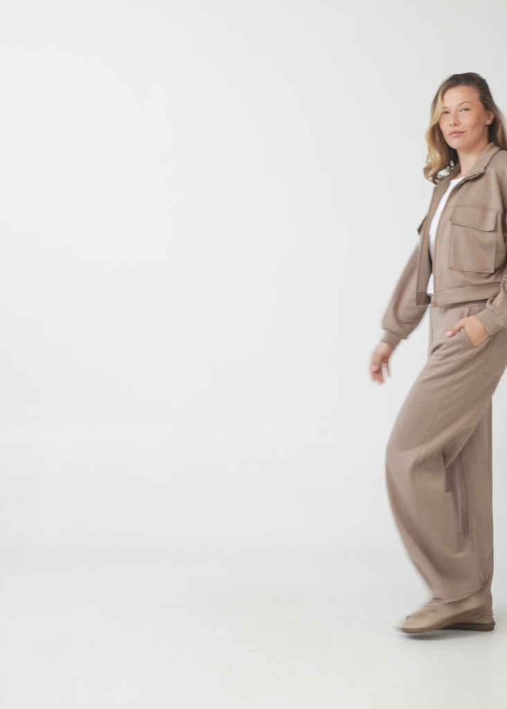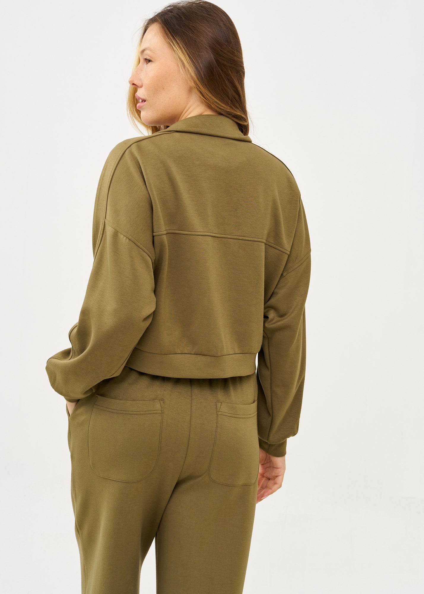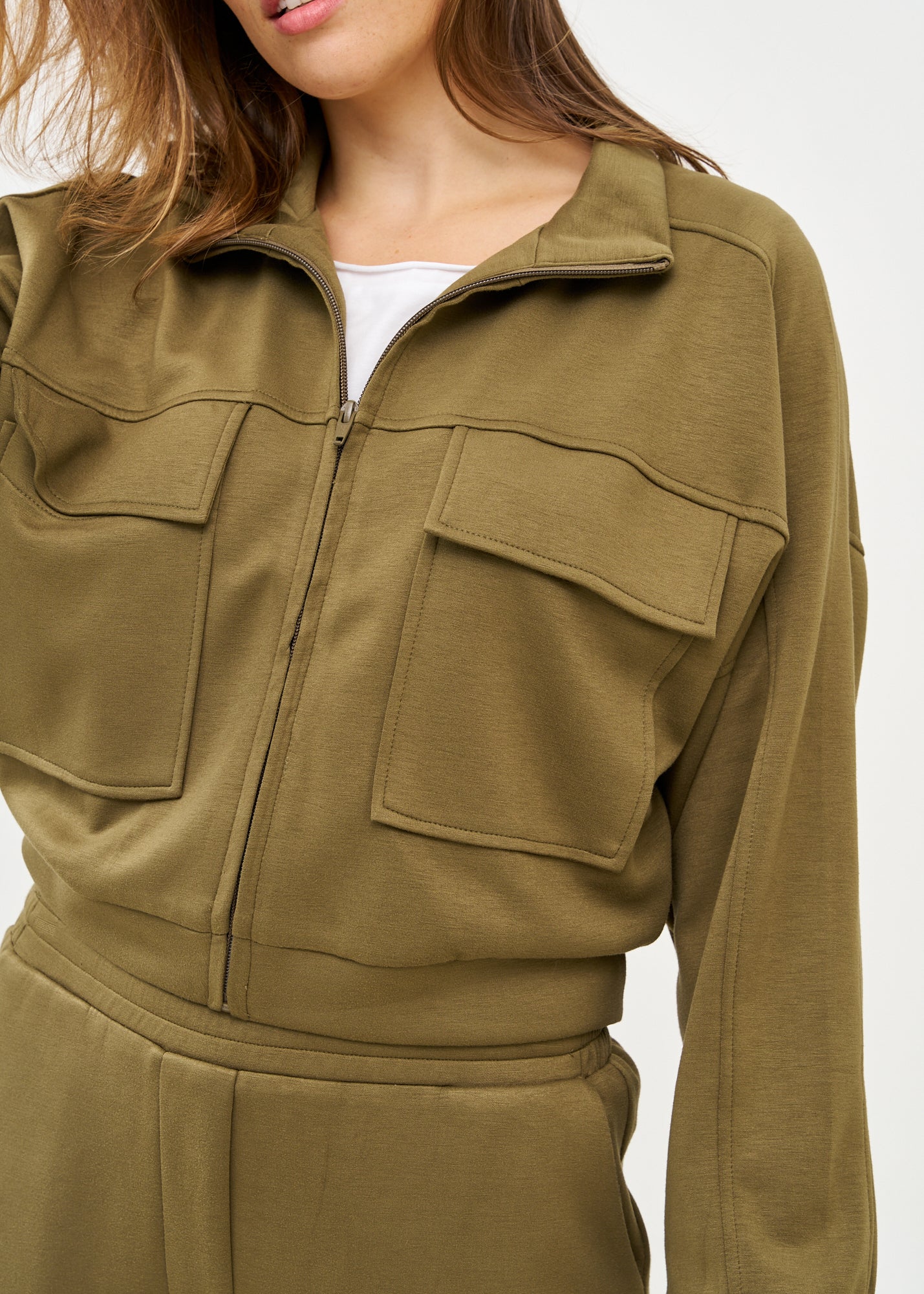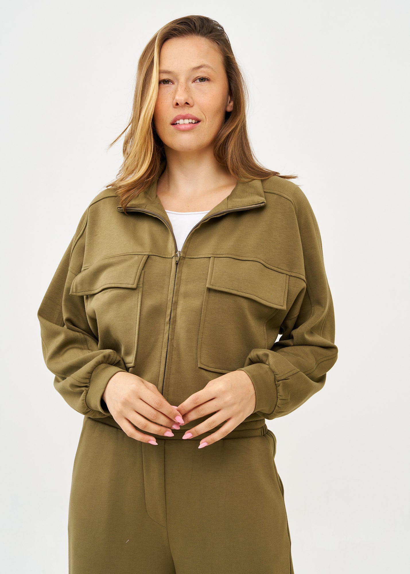 ג'קט מעוצב ונוח בגזרה קצרה ומשוחררת המחמיאה לכל מבנה גוף. הפריט בעל צווארון עומד אלגנטי עם סגירת רוכסן מרכזית ואיכותית, שני כיסים קדמיים בולטים ושרוולים ארוכים בגימור אלסטי עדין.