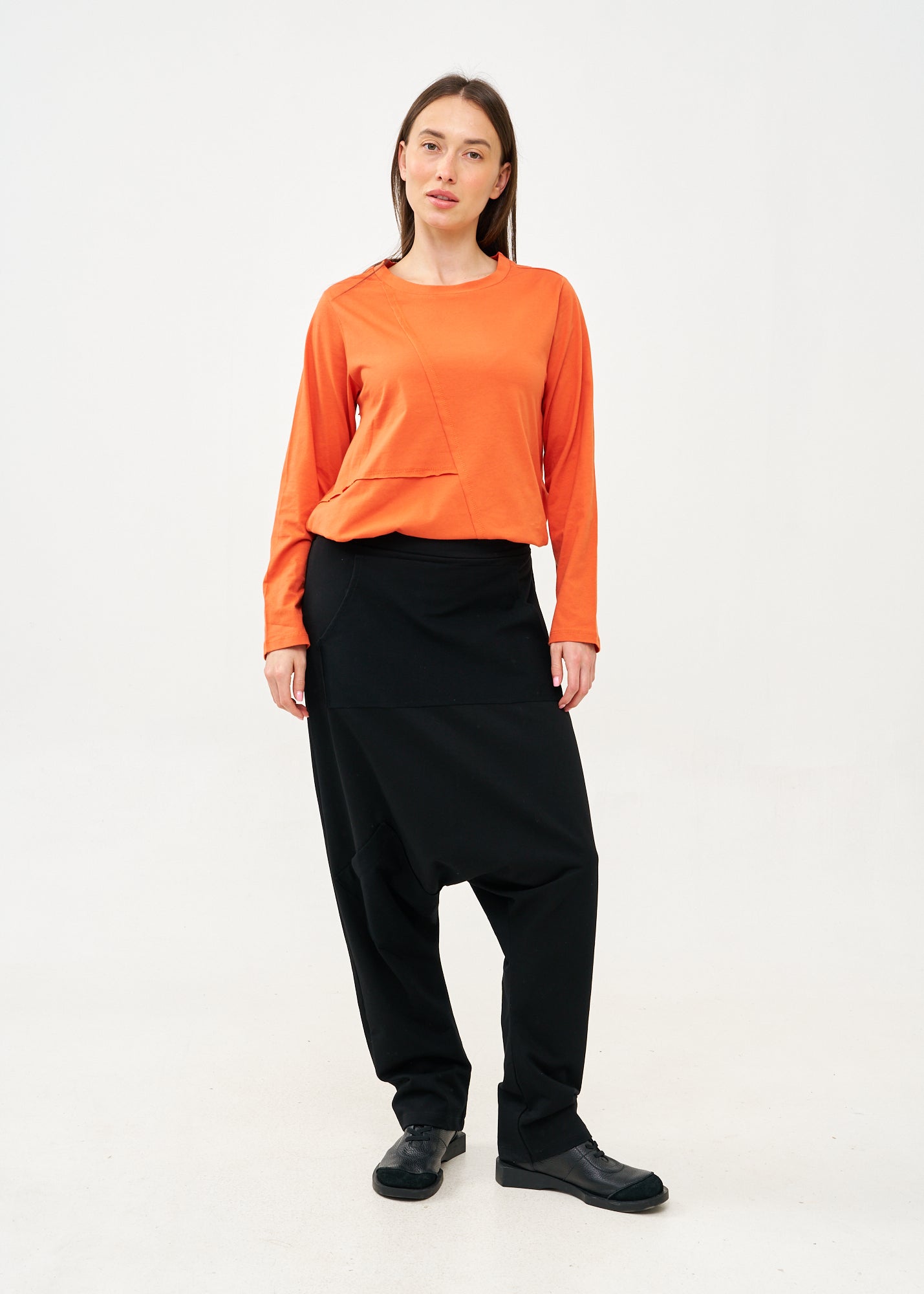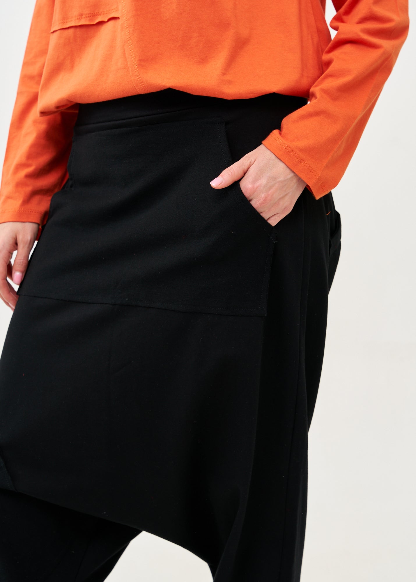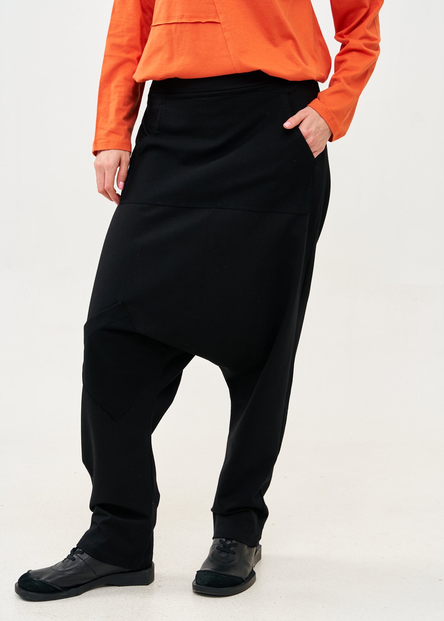 מכנסיים ייחודיים ומעוצבים בגזרת שקי אוברסייז עם מפשעה נמוכה המעניקה נוחות מרבית וחופש תנועה מלא, גומי רחב במותן, כיס גדול בסגנון קנגרו בחזית וכיס קדמי קטן ובחלקו האחורי כיס נוסף.
