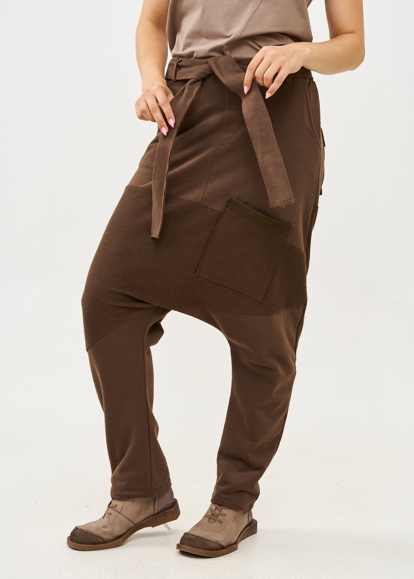 מכנסיים ייחודיים ומעוצבים בגזרת שקי אוברסייז עם מפשעה נמוכה ומשוחררת המעניקה נוחות מרבית וחופש תנועה מלא, גומי רחב במותן וחגורת קשירה רחבה הניתנת לקשירה בדרכים שונות ומאפשרת התאמה אישית של המראה. בעל כיסים קדמיים עמוקים וכיסי קלאפה אחוריים עם כפתורים.