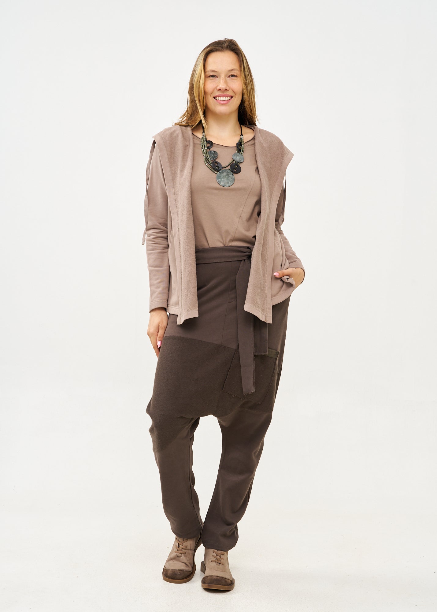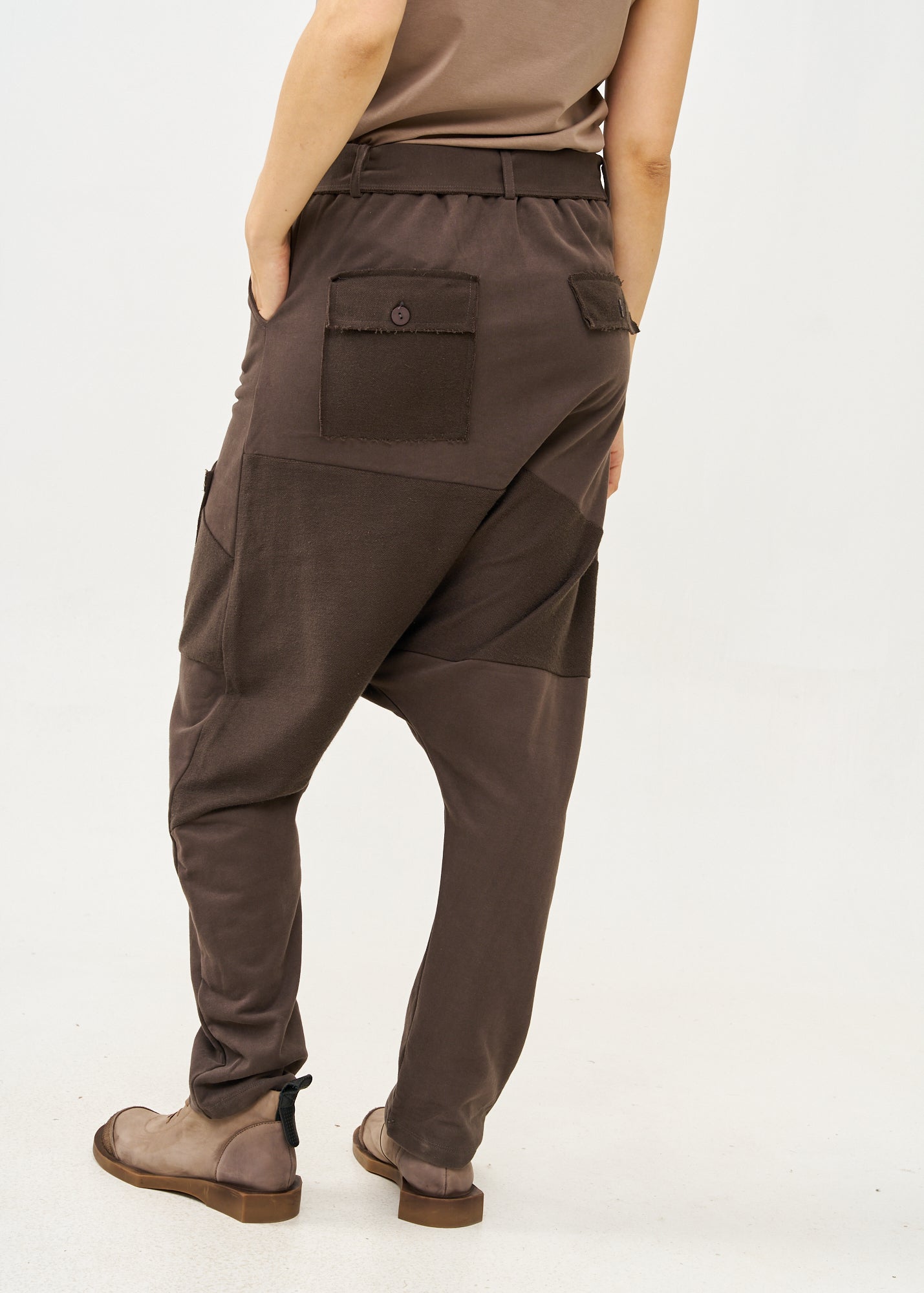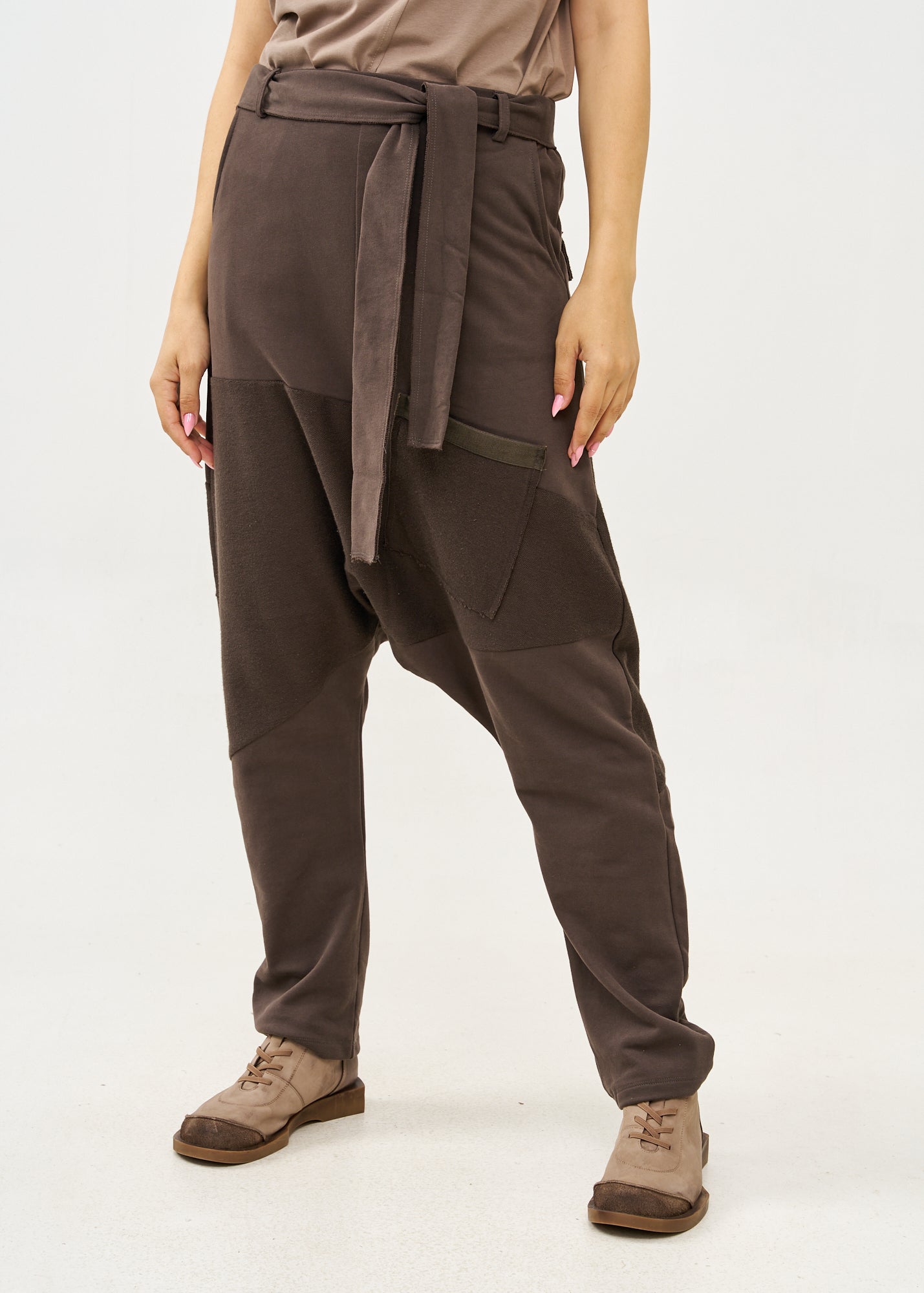 מכנסיים ייחודיים ומעוצבים בגזרת שקי אוברסייז עם מפשעה נמוכה ומשוחררת המעניקה נוחות מרבית וחופש תנועה מלא, גומי רחב במותן וחגורת קשירה רחבה הניתנת לקשירה בדרכים שונות ומאפשרת התאמה אישית של המראה. בעל כיסים קדמיים עמוקים וכיסי קלאפה אחוריים עם כפתורים.