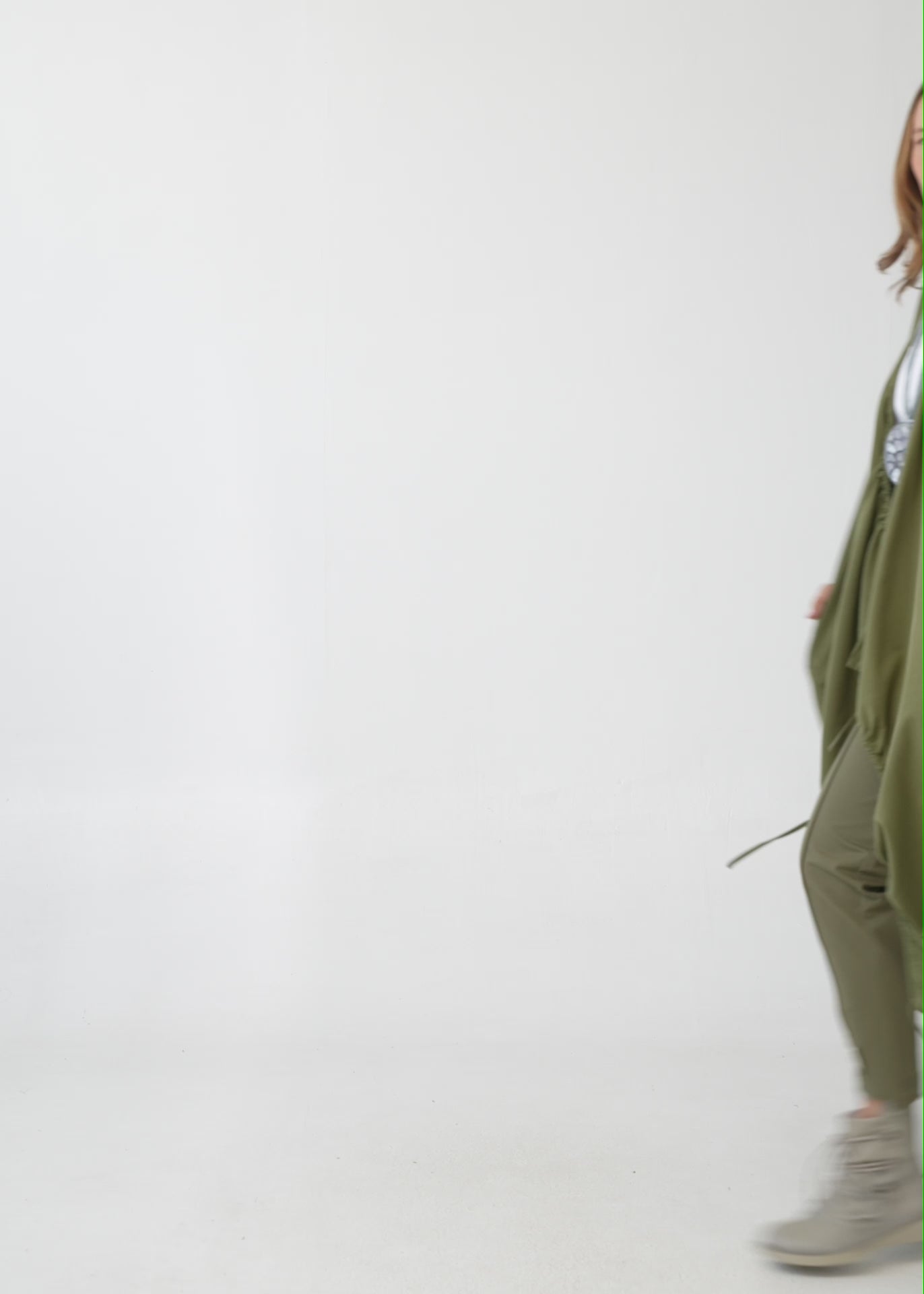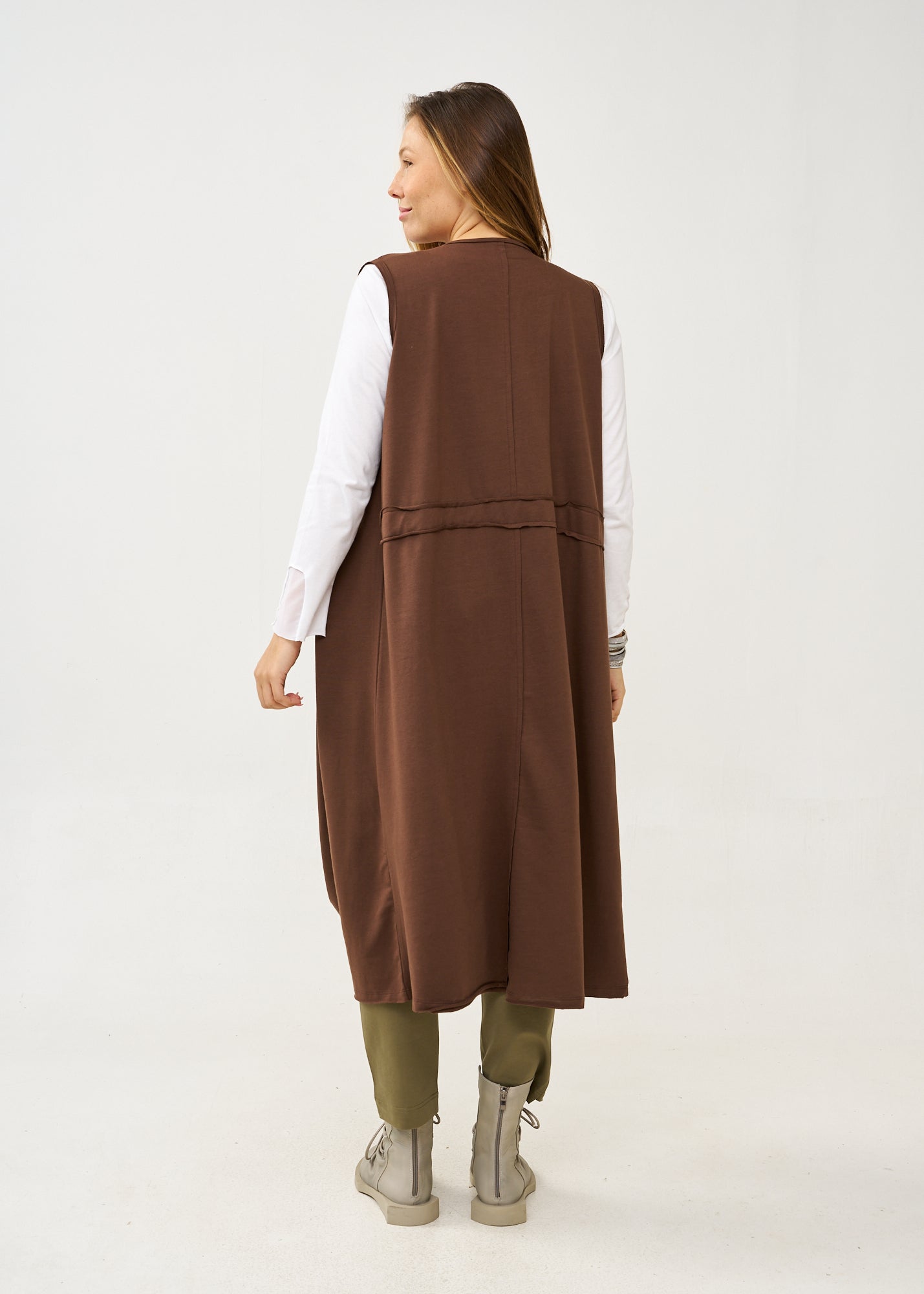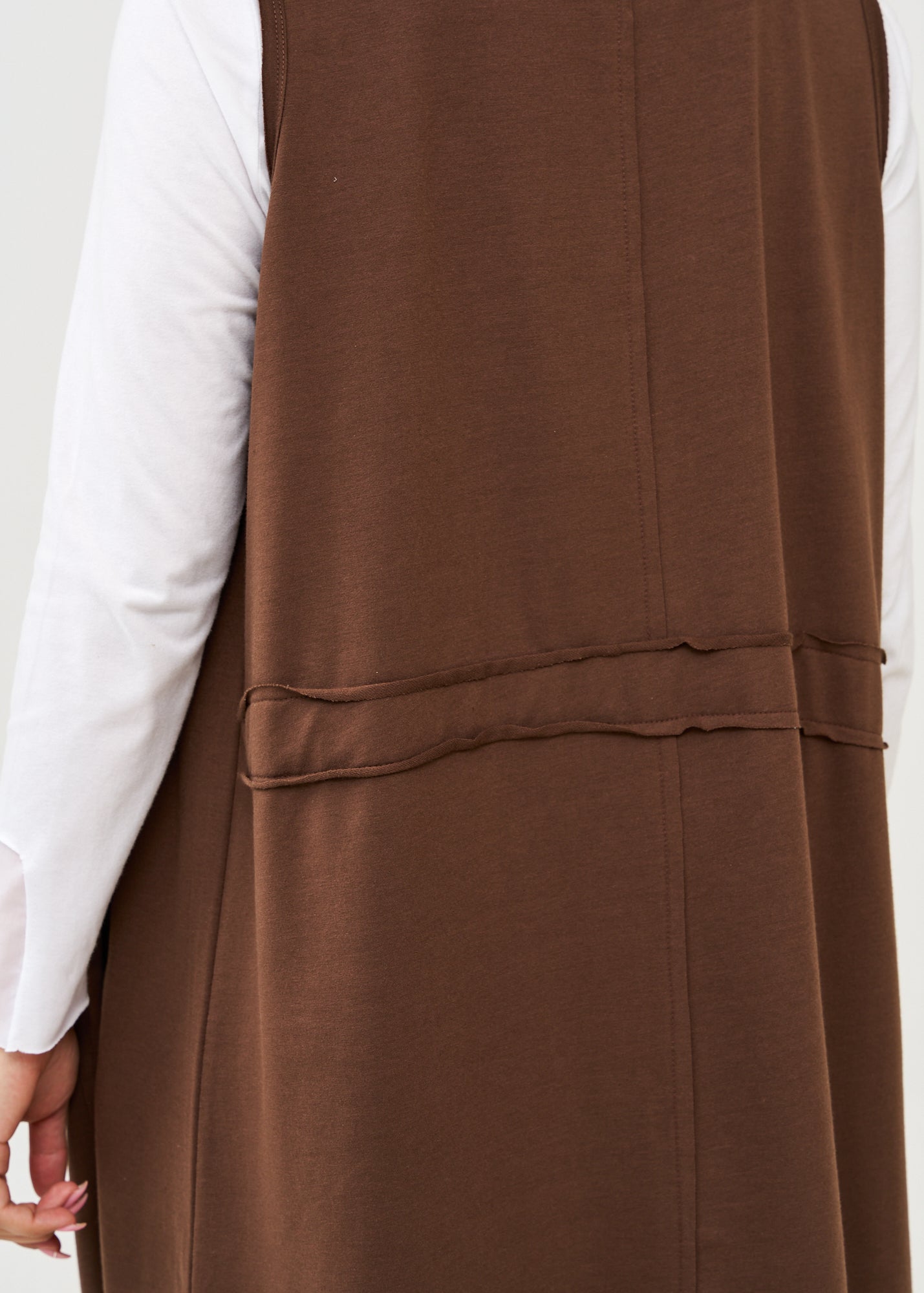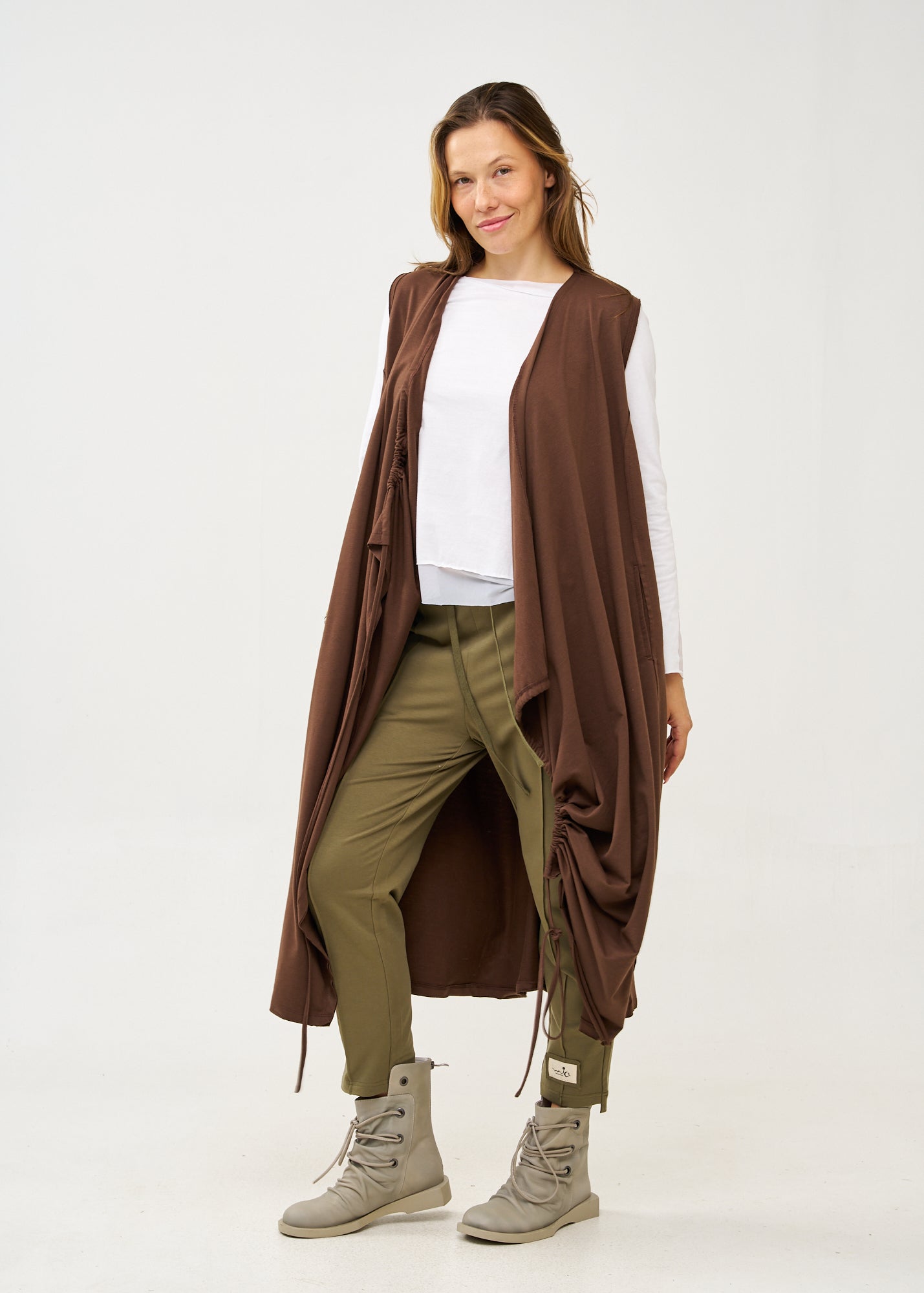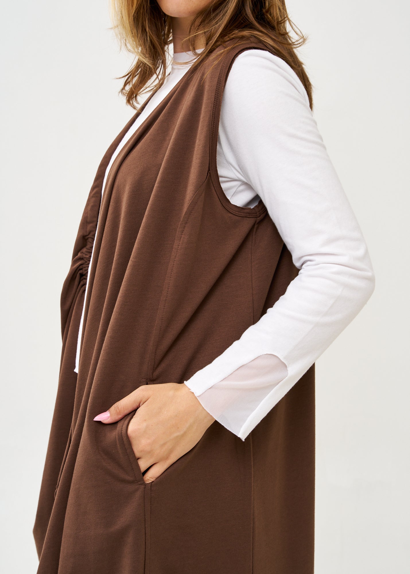 עליונית ארוכה ומעוצבת בגזרה משוחררת וזורמת, ללא שרוולים ועם כיסים צדדיים עמוקים. בעלת עיצוב ייחודי עם שרוכי כיווץ דקורטיביים בצדדים ותפר אופקי מודגש באמצע היוצר חלוקה ויזואלית מעניינת בחלקה האחורי