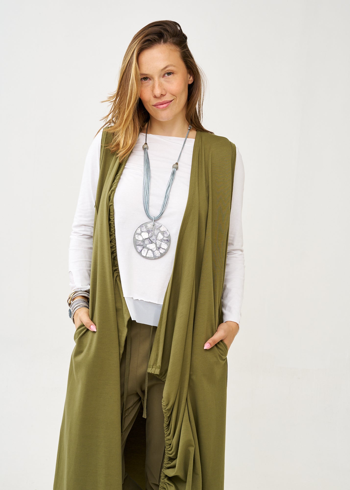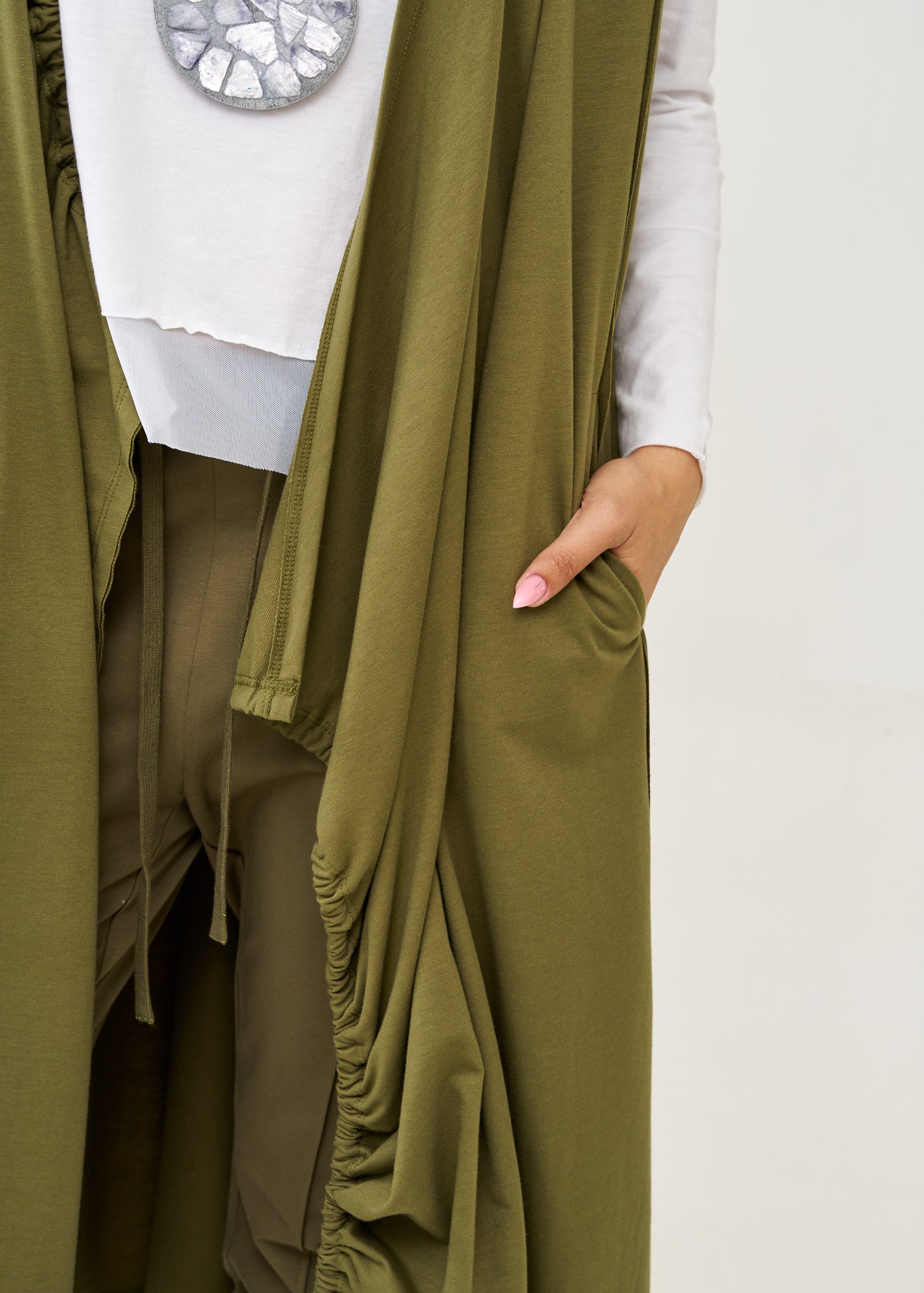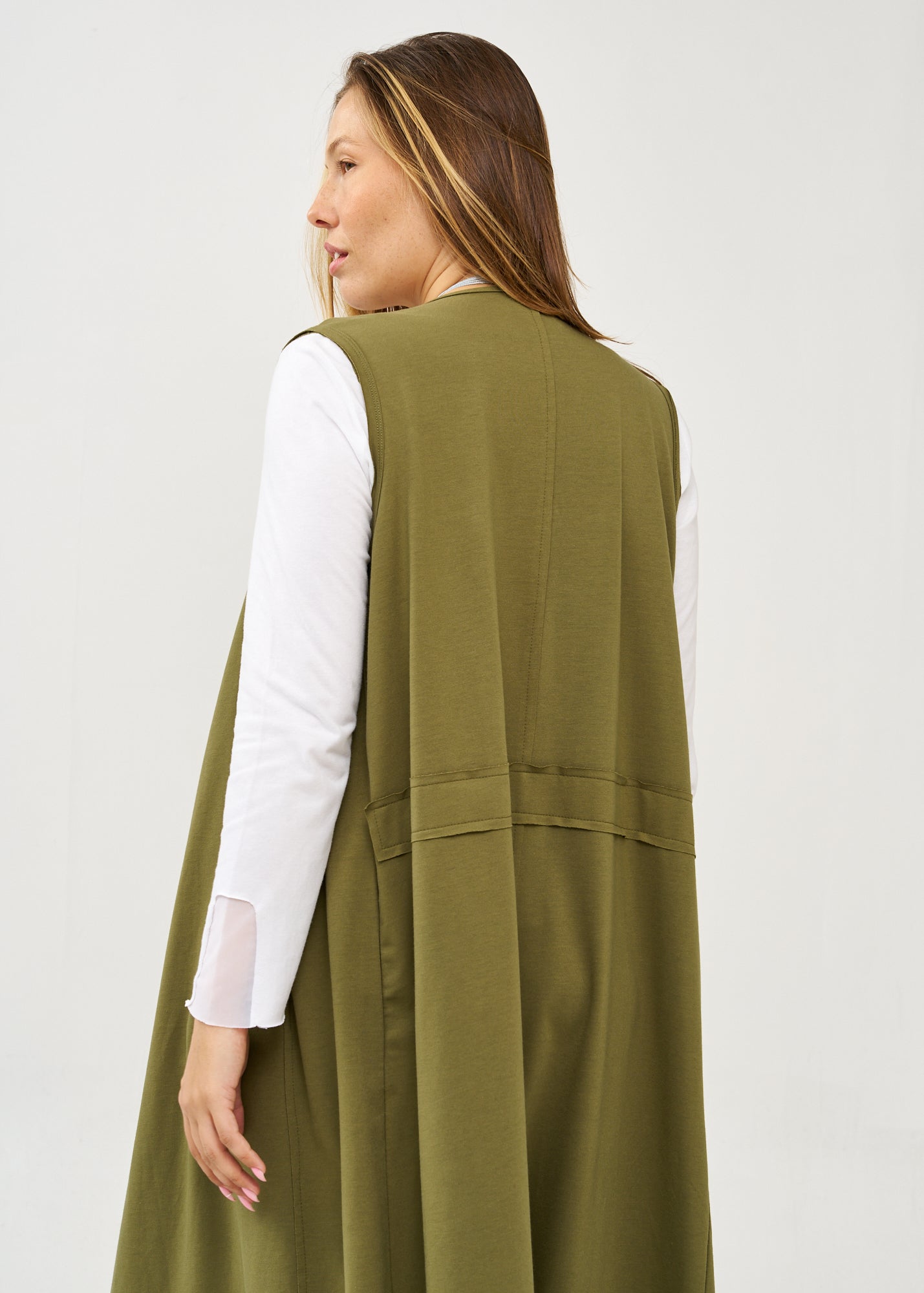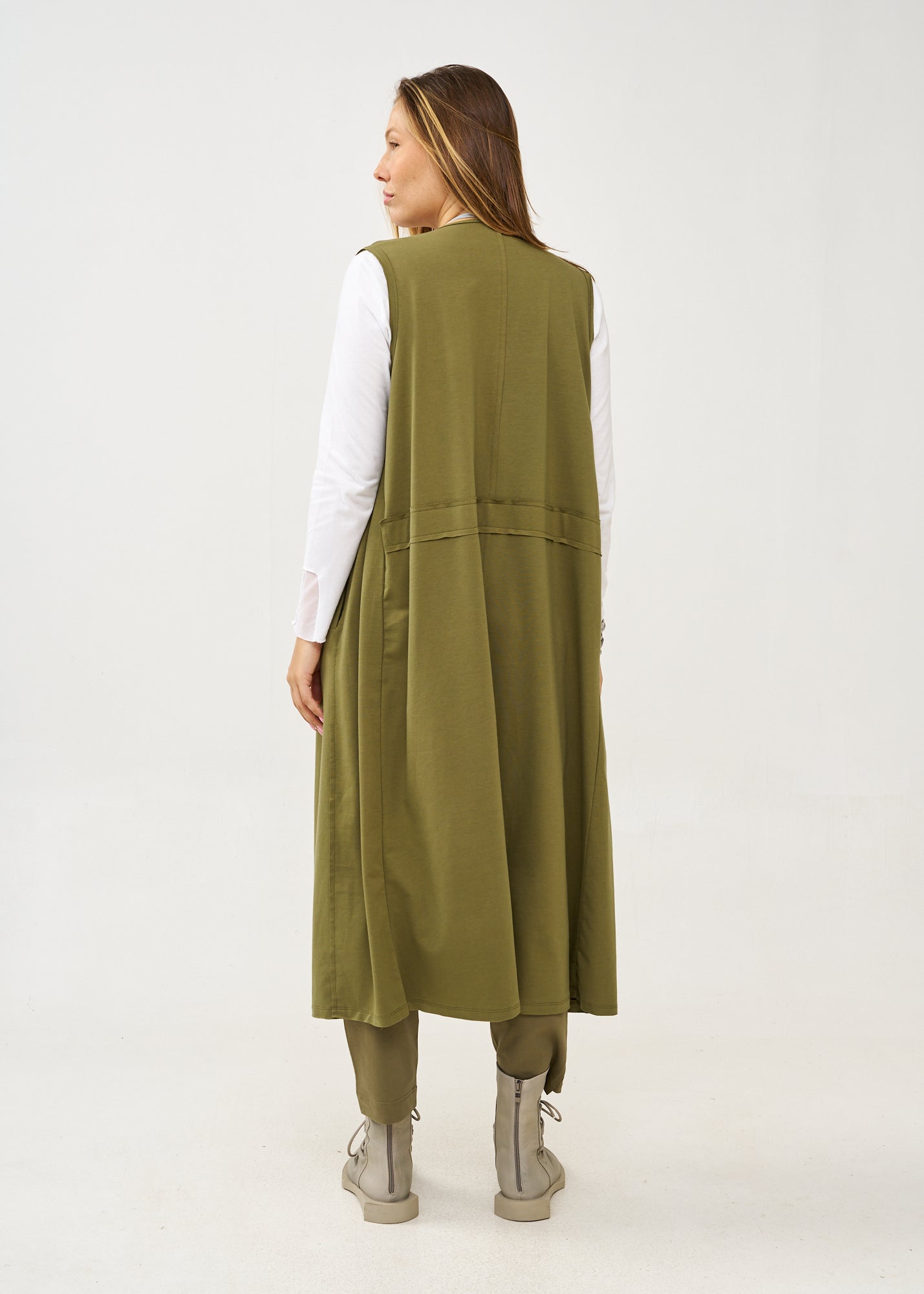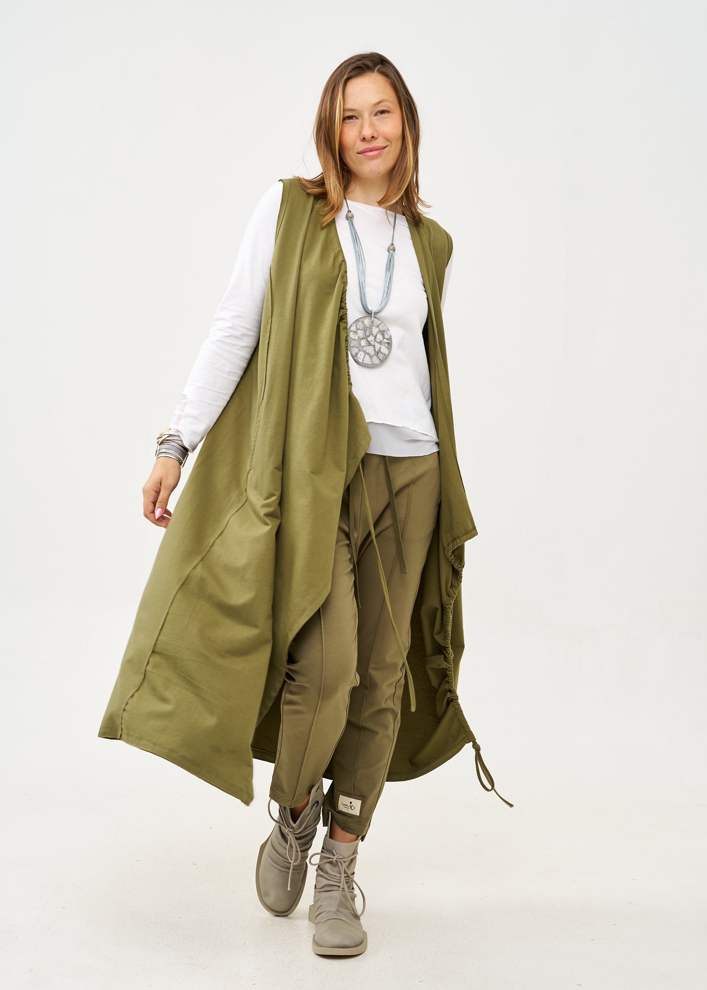 עליונית ארוכה ומעוצבת בגזרה משוחררת וזורמת, ללא שרוולים ועם כיסים צדדיים עמוקים. בעלת עיצוב ייחודי עם שרוכי כיווץ דקורטיביים בצדדים ותפר אופקי מודגש באמצע היוצר חלוקה ויזואלית מעניינת בחלקה האחורי