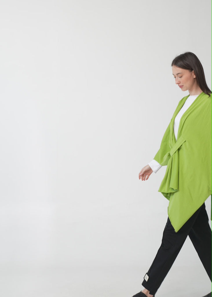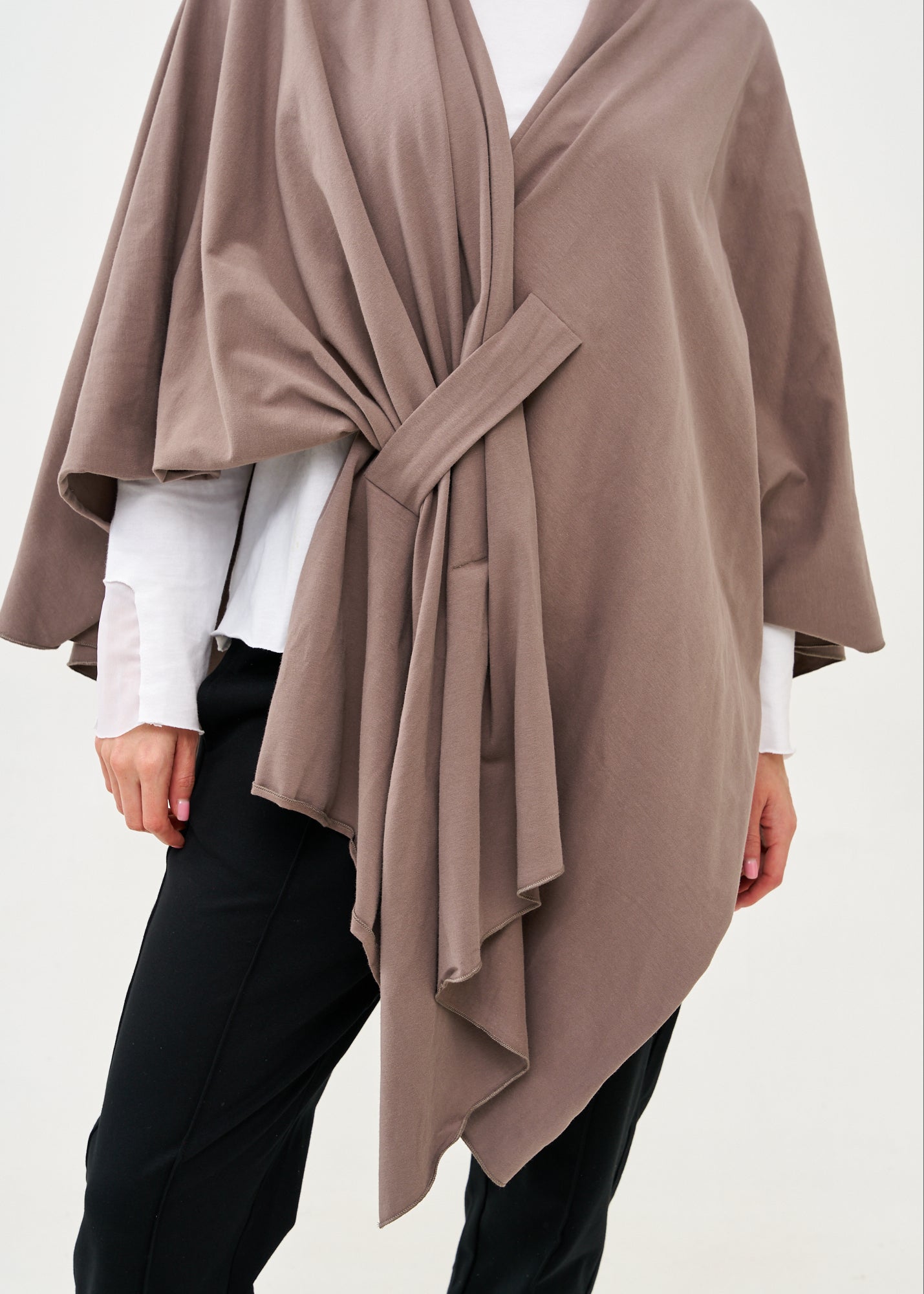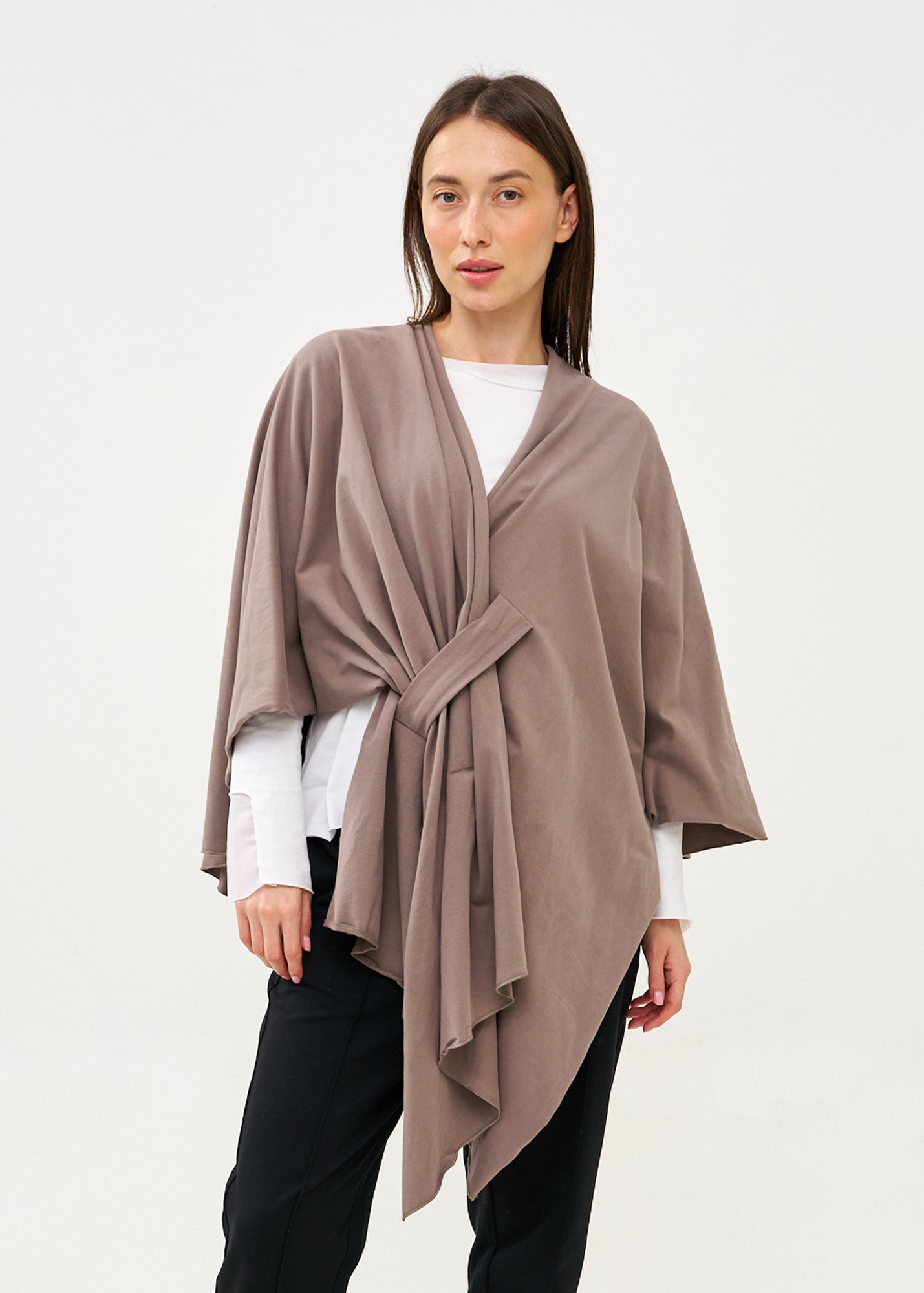 שכמייה אלגנטית ורב שימושית בעיצוב עכשווי ומתוחכם, בגזרה רחבה ומשוחררת, בעלת סיומת אסימטרית מיוחדת וסגירה באמצעות רצועת בד רחבה.