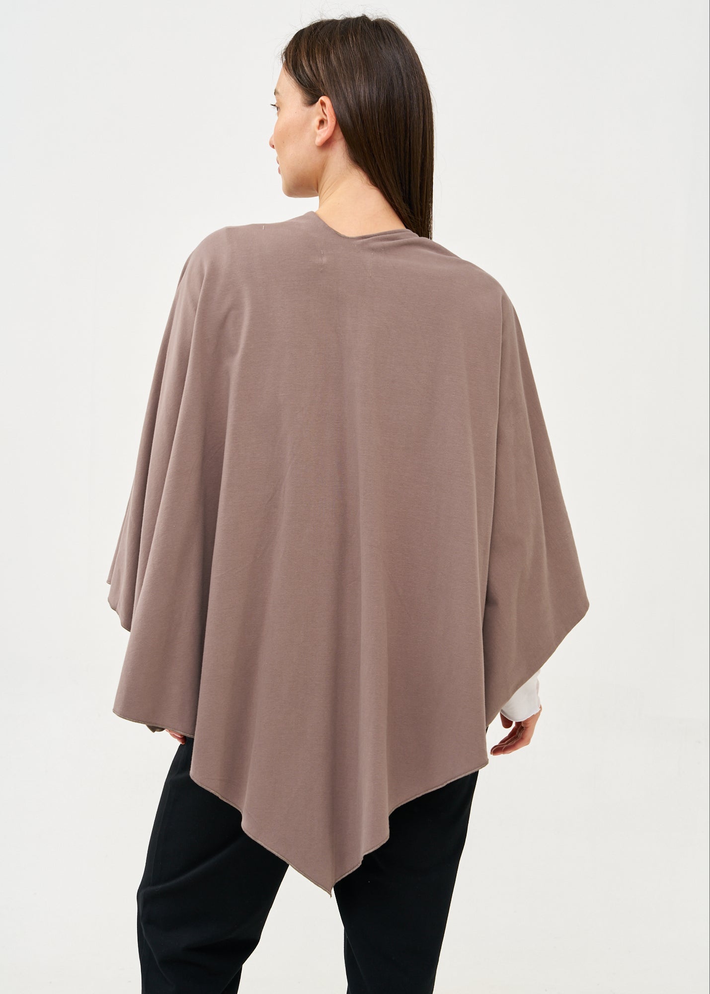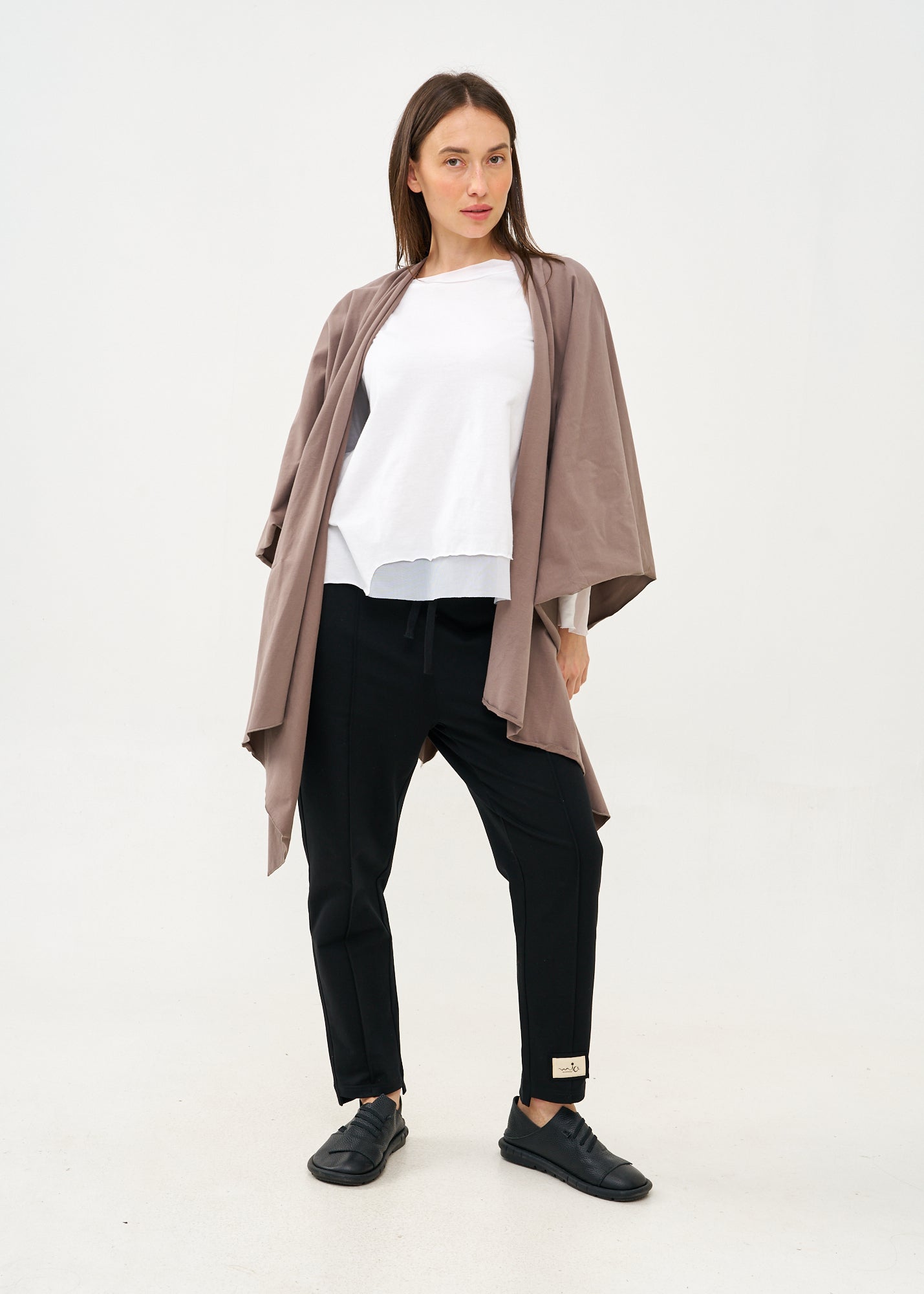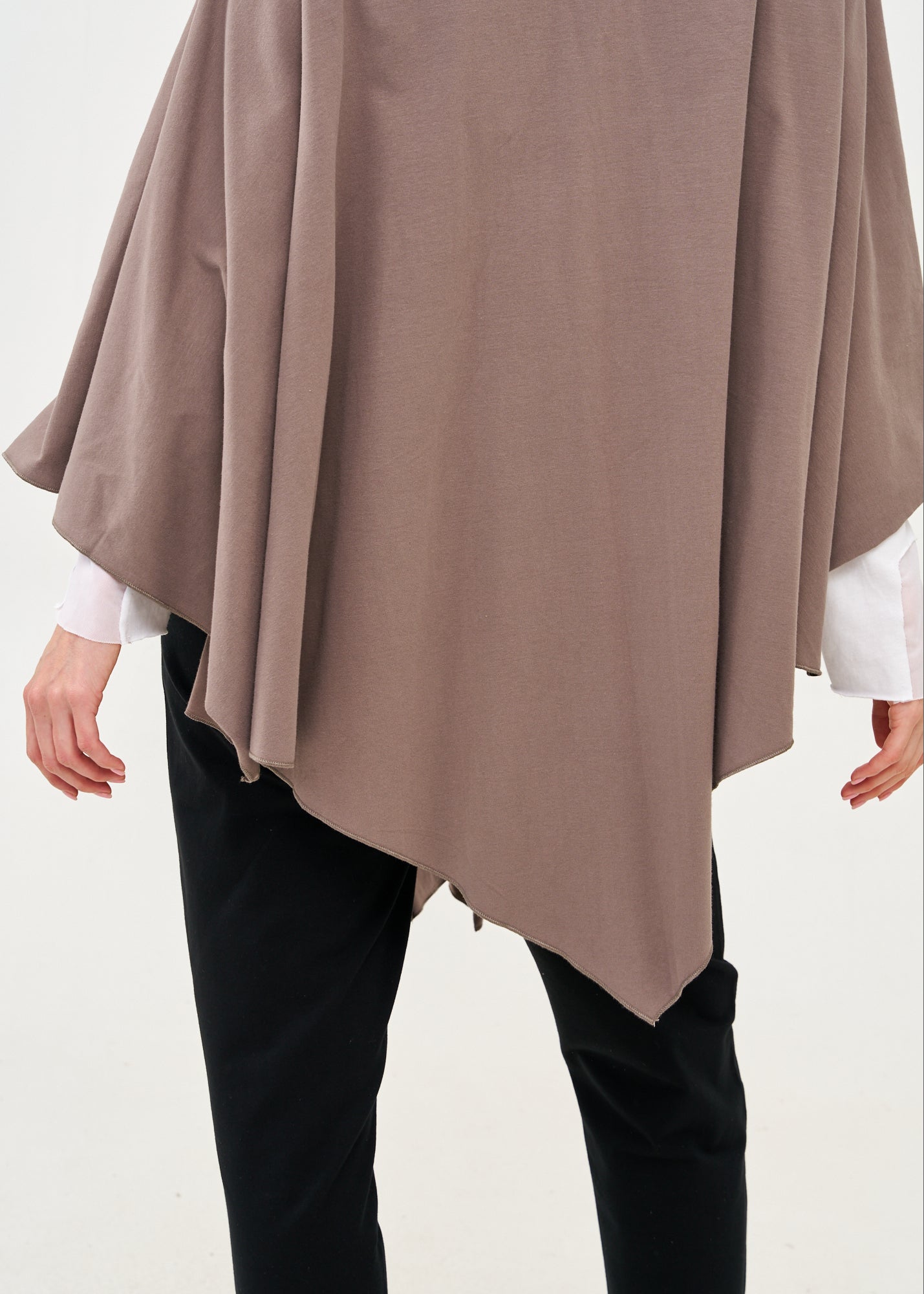 שכמייה אלגנטית ורב שימושית בעיצוב עכשווי ומתוחכם, בגזרה רחבה ומשוחררת, בעלת סיומת אסימטרית מיוחדת וסגירה באמצעות רצועת בד רחבה.