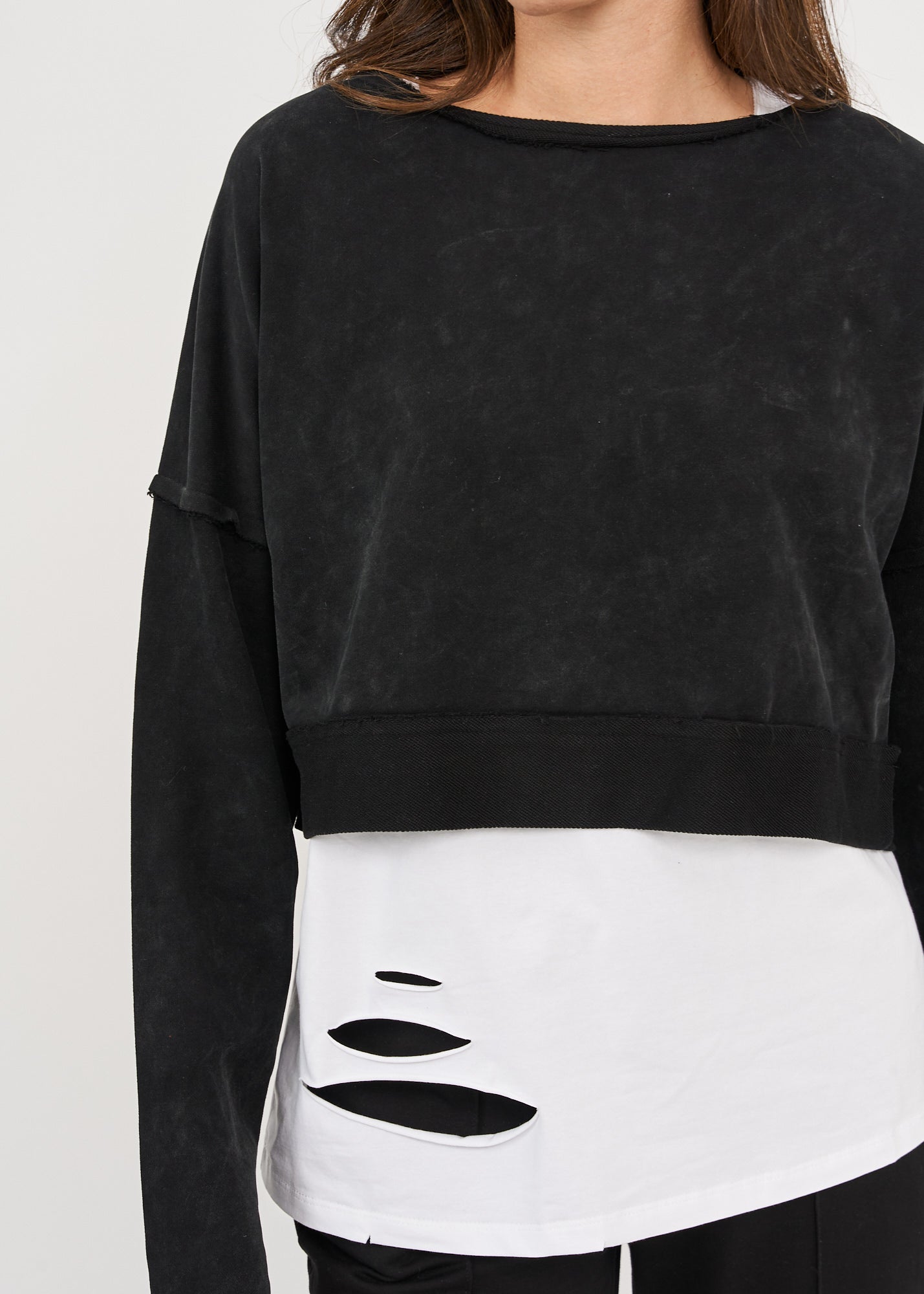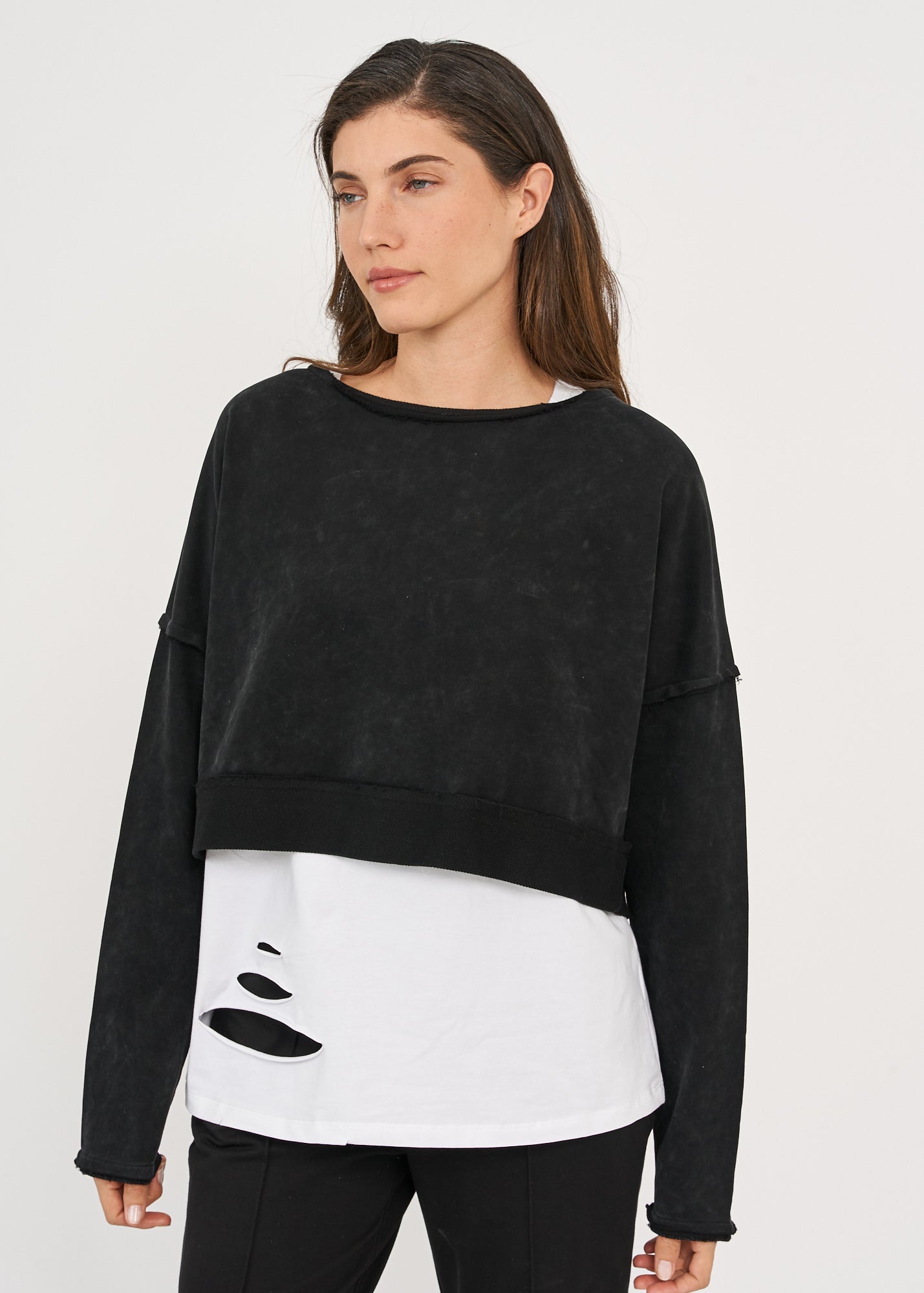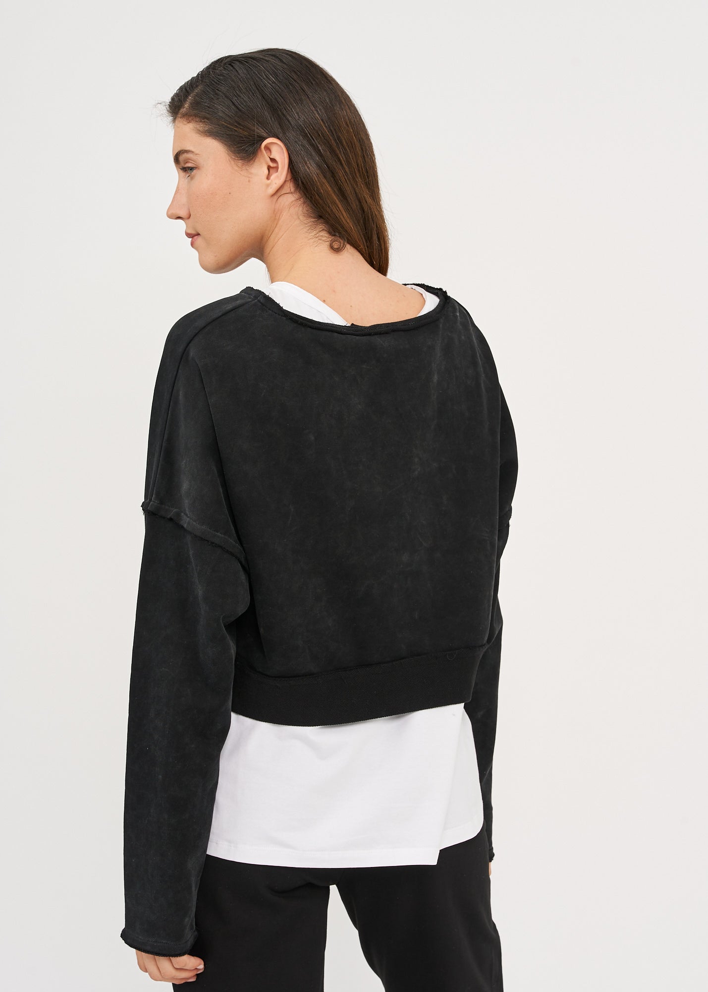 חולצה שרוול ארוך קצרצרה סיומת מקופלת שחור ווש