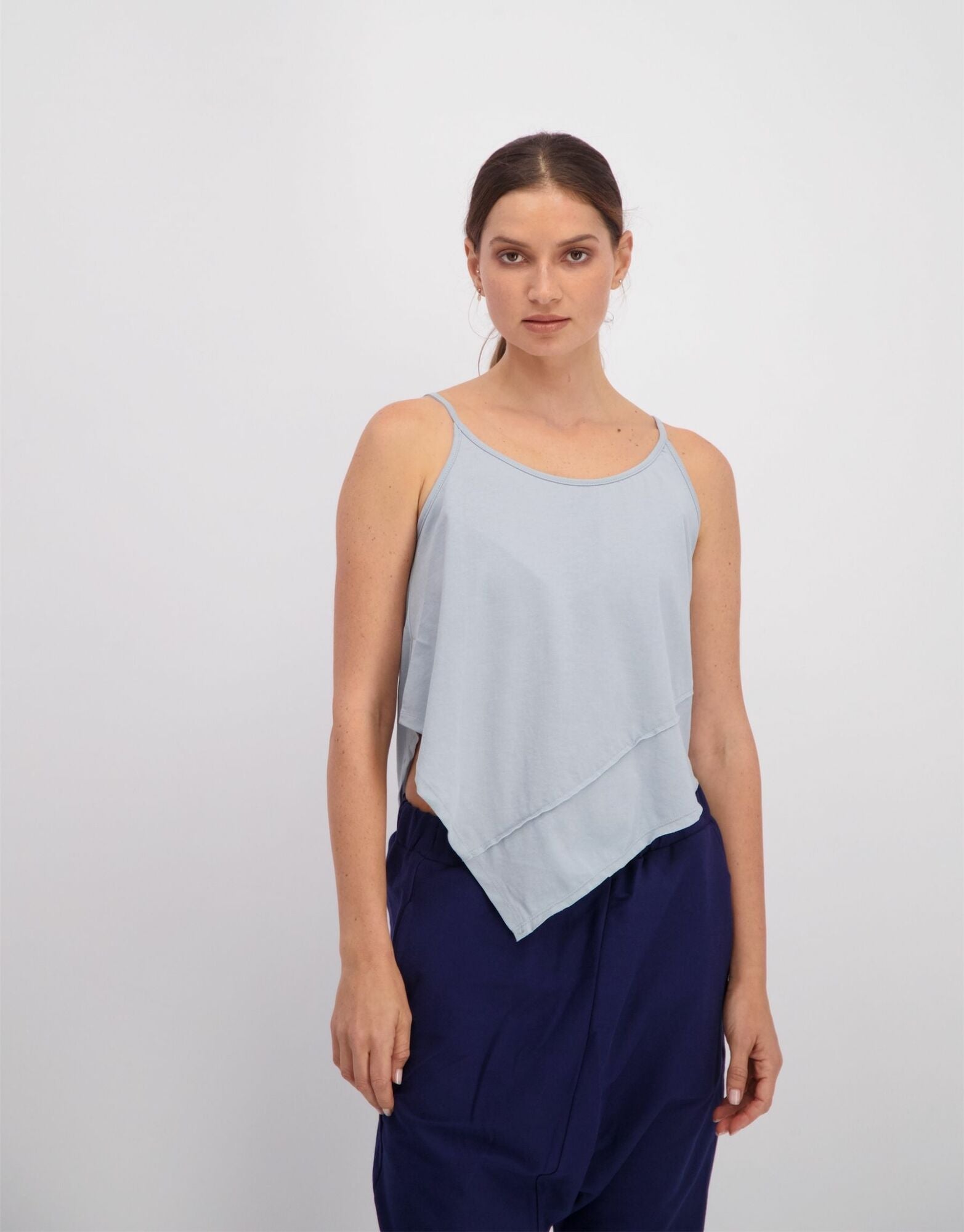 גופיית בייסיק בגזירת אסימטרית קצרצרה להשלמת לוק השכבות שלבי עם גופיית ספגטי 100% כתונה שפיץ קדימה.