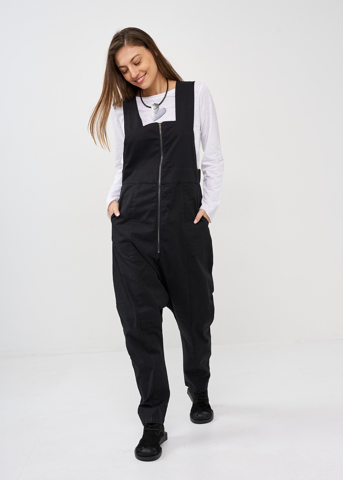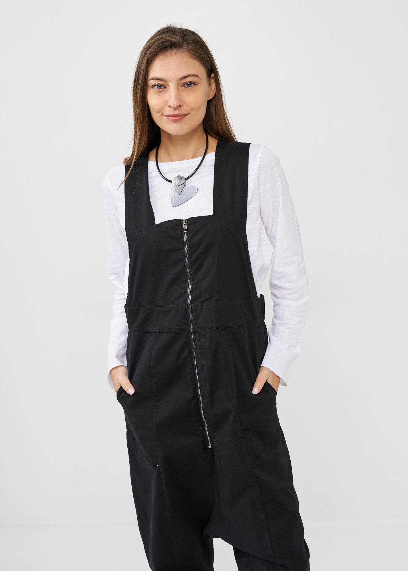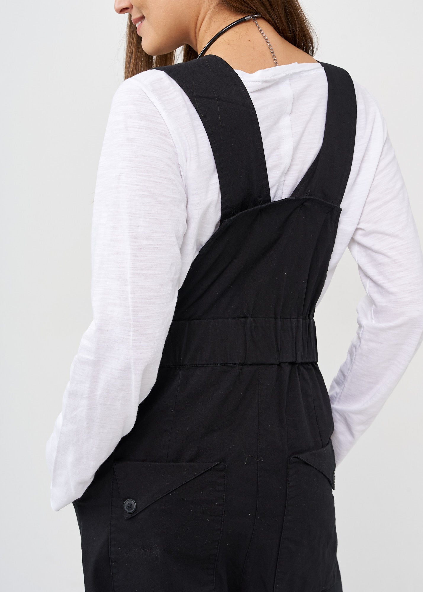 אוברול בעיצוב מיוחד בגזרת שקי אופנתית עם מפשעה נמוכה ורוכסן מתכת איכותי לאורך כל החזית, המאפשר לבישה קלה ונוחה ומוסיף קו עיצובי מודגש ומרשים. בעל שני כיסים קדמיים ושני כיסים אחוריים גדולים עם כפתורים דקורטיביים וקפלים אלכסוניים מעוצבים שמוסיפים עניין חזותי, יחד עם רצועת כיווץ אלסטית ייחודית באזור המותניים התחתון היוצרת גימור מעוצב ומיוחדצווארון מרובע ורחב בחזית היוצר קו נקי ומעניין, בעוד שהכתפיות הרחבות והמעוצבות מספקות תמיכה נוחה ויושבות בצורה מושלמת על הכתפיים.