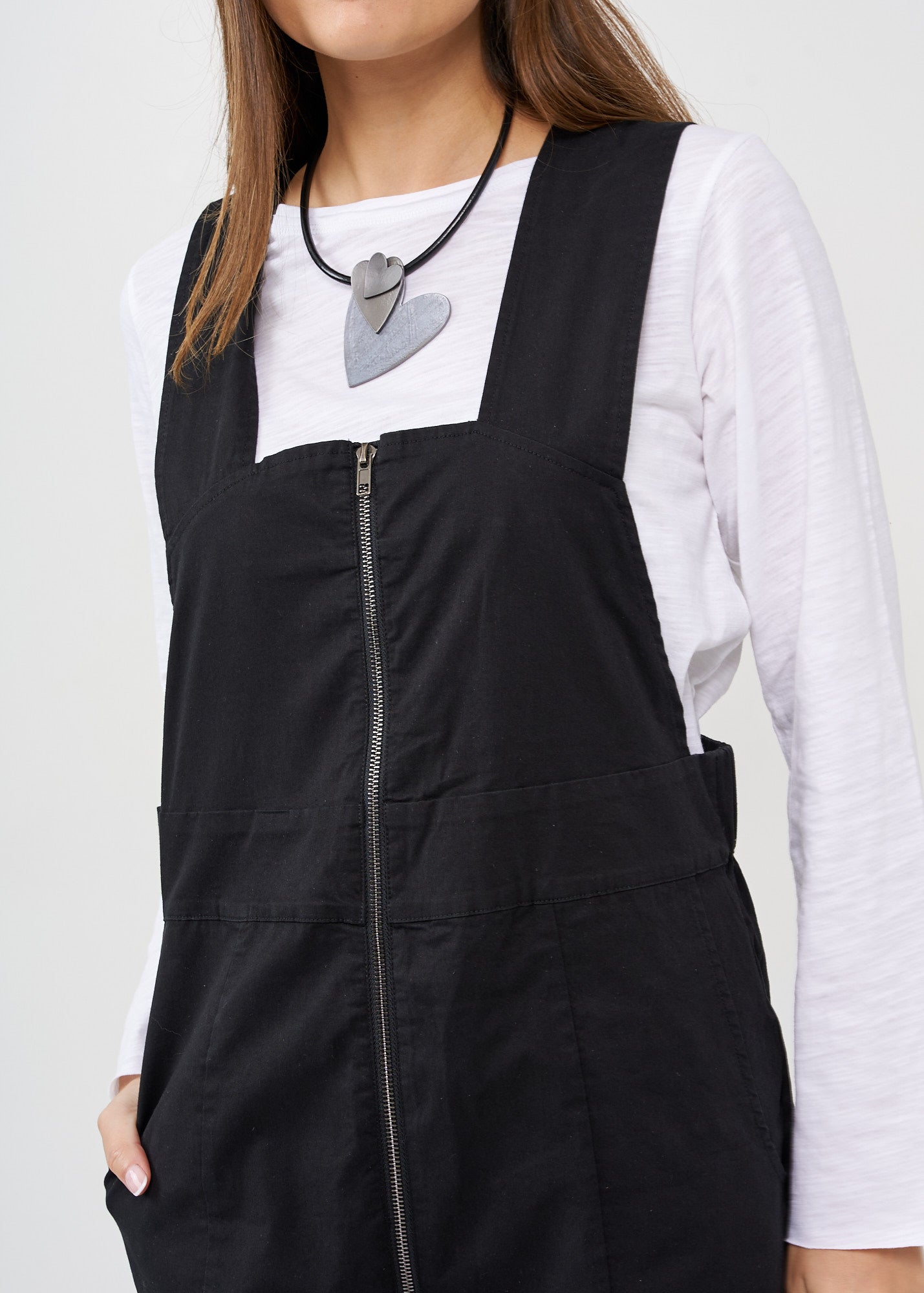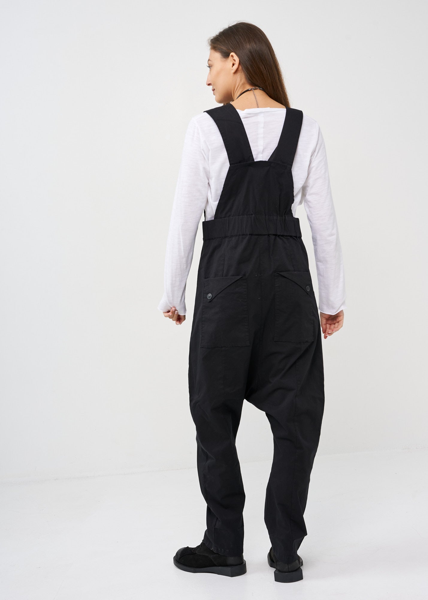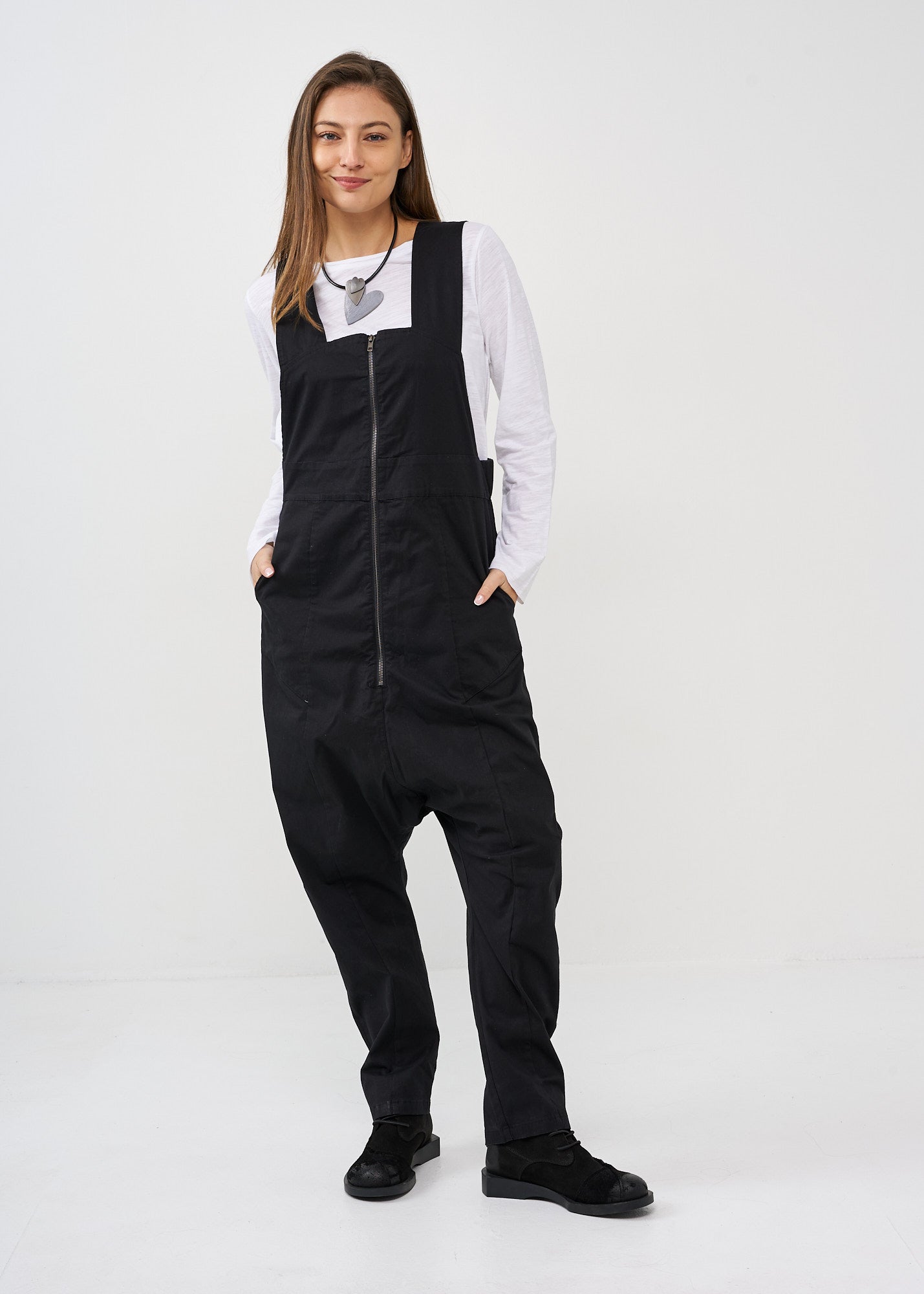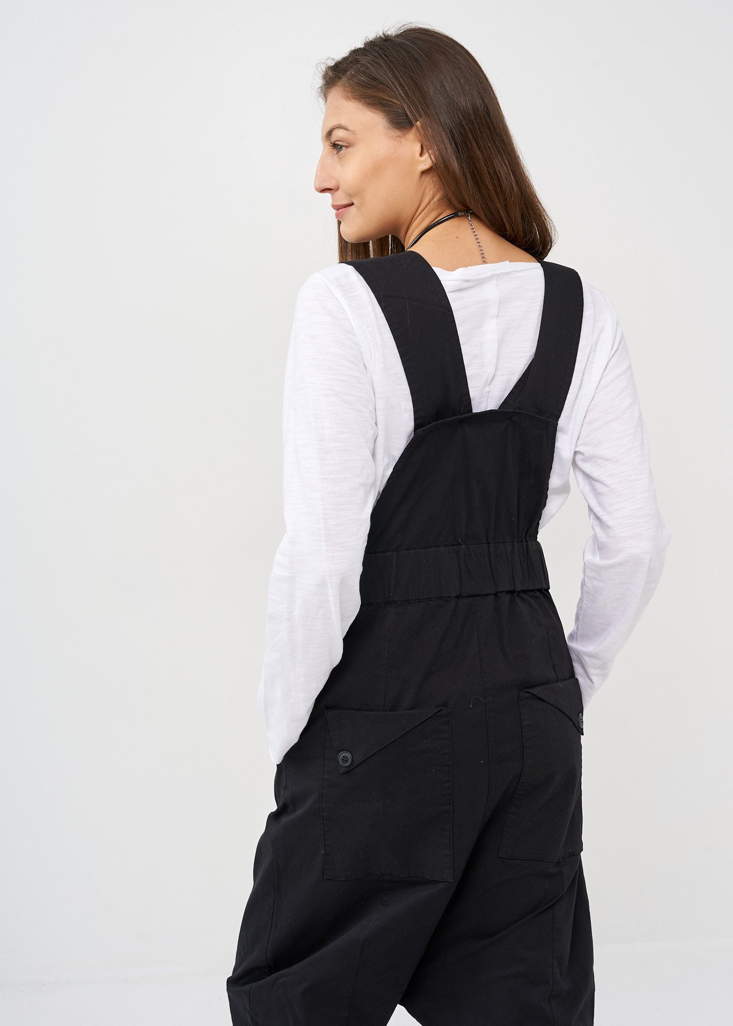 אוברול בעיצוב מיוחד בגזרת שקי אופנתית עם מפשעה נמוכה ורוכסן מתכת איכותי לאורך כל החזית, המאפשר לבישה קלה ונוחה ומוסיף קו עיצובי מודגש ומרשים. בעל שני כיסים קדמיים ושני כיסים אחוריים גדולים עם כפתורים דקורטיביים וקפלים אלכסוניים מעוצבים שמוסיפים עניין חזותי, יחד עם רצועת כיווץ אלסטית ייחודית באזור המותניים התחתון היוצרת גימור מעוצב ומיוחדצווארון מרובע ורחב בחזית היוצר קו נקי ומעניין, בעוד שהכתפיות הרחבות והמעוצבות מספקות תמיכה נוחה ויושבות בצורה מושלמת על הכתפיים.
