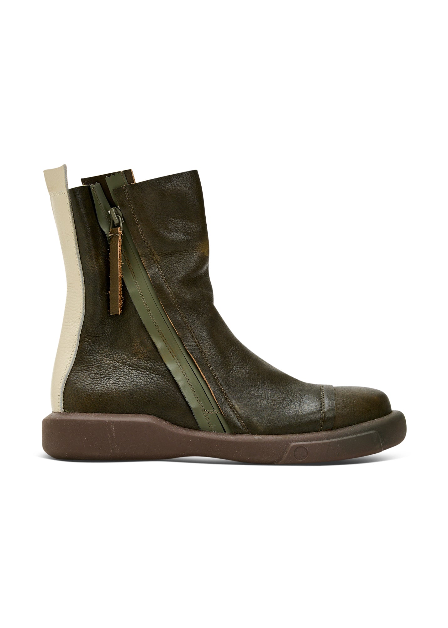 מגפוני עור מיוחדים בעיצוב מודרני ומיוחד בעל רוכסן חיצוני אלכסוני המאפשר נעילה וחליצה קלה במיוחד ורצועה צבעונית בחלקו האחורי היוצרת ניגוד ויזואלי מרשים ומעניק עומק לעיצוב.