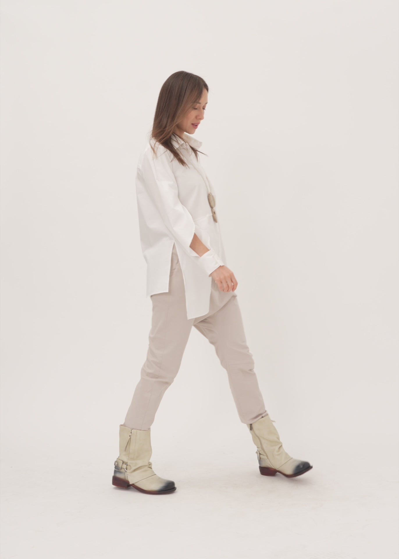 חולצה מכופתרת בעיצוב אסימטרי מרהיב היוצר משחק מעניין של שכבות וקווים, בעל צווארון קלאסי, כיס קדמי ושרוולים פתוחים בחלקם אשר מעניקים טוויסט אופנתי, תוך שמירה על מראה מתוחכם ונקי.