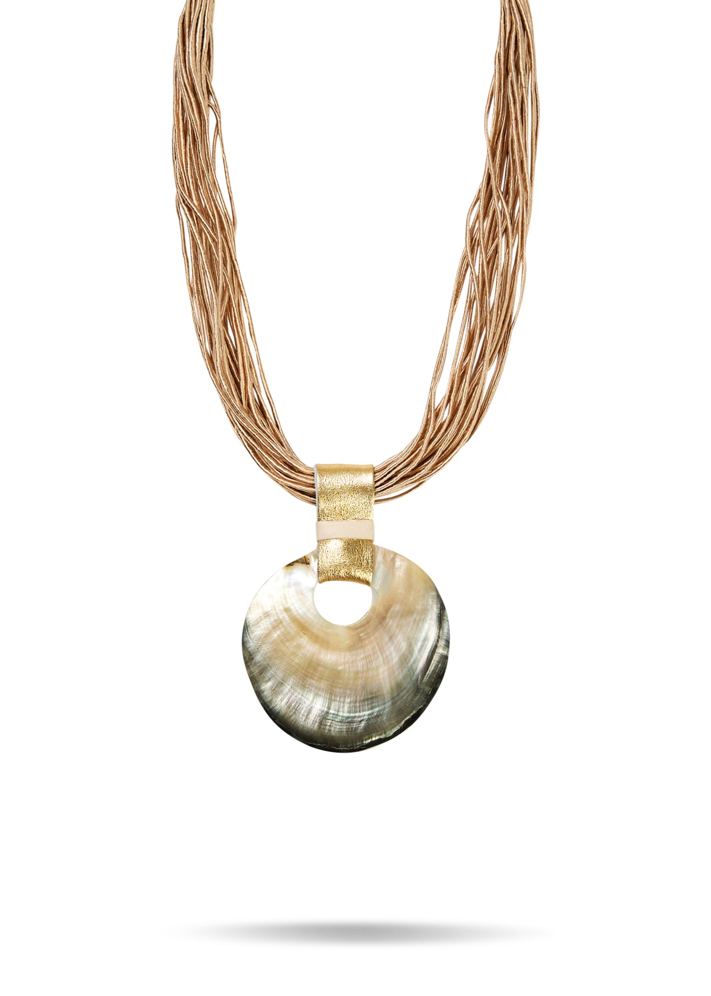 שרשרת בעיצוב ייחודי של תליון עשוי מצדף טבעי עגול גדול עם חור מרכזי דרכו עוברת רצועה המחברת אותו לחוטים דקים.