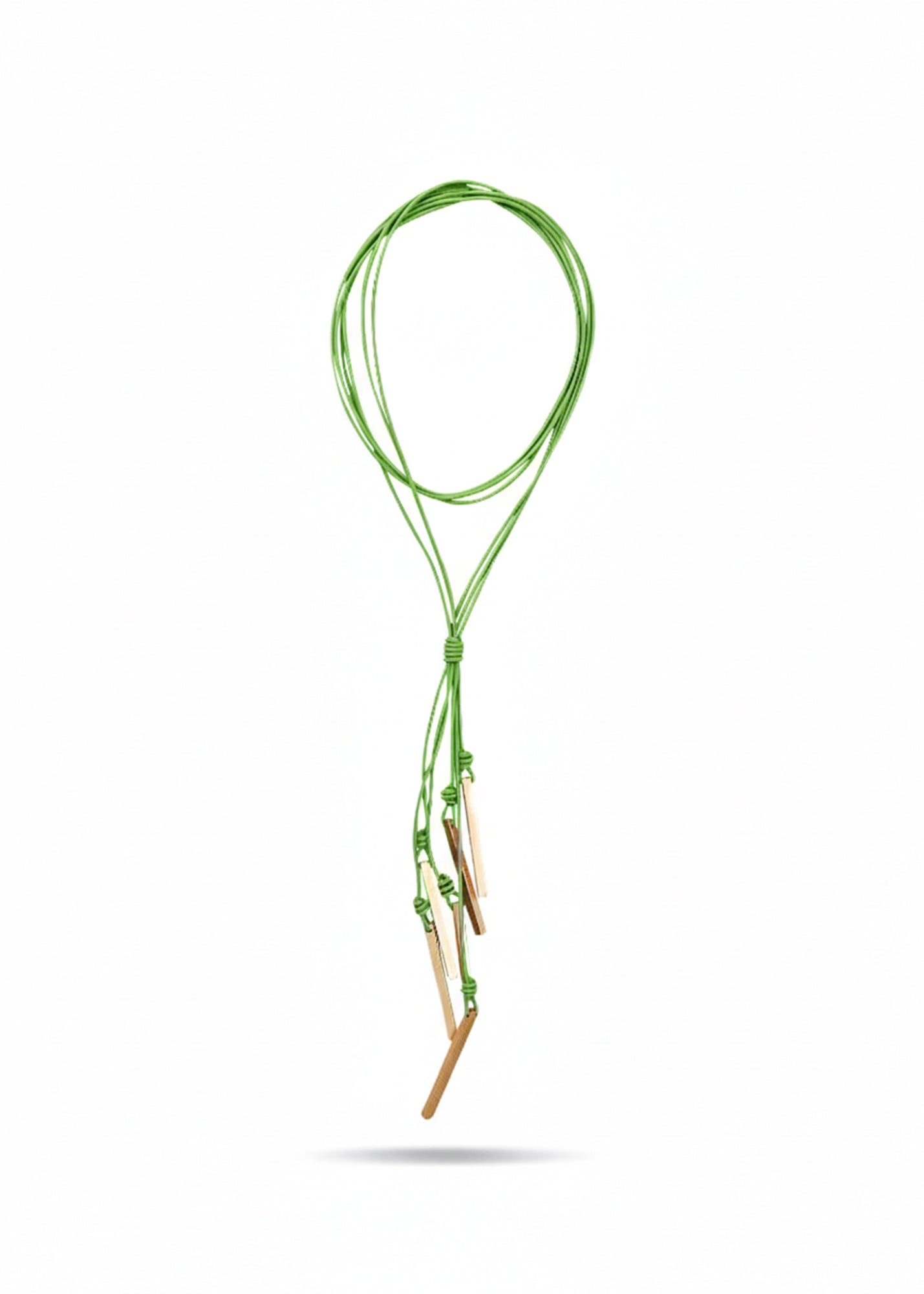 שרשרת עור ארוכה עם פרנזים מלבני מתכת ירוק