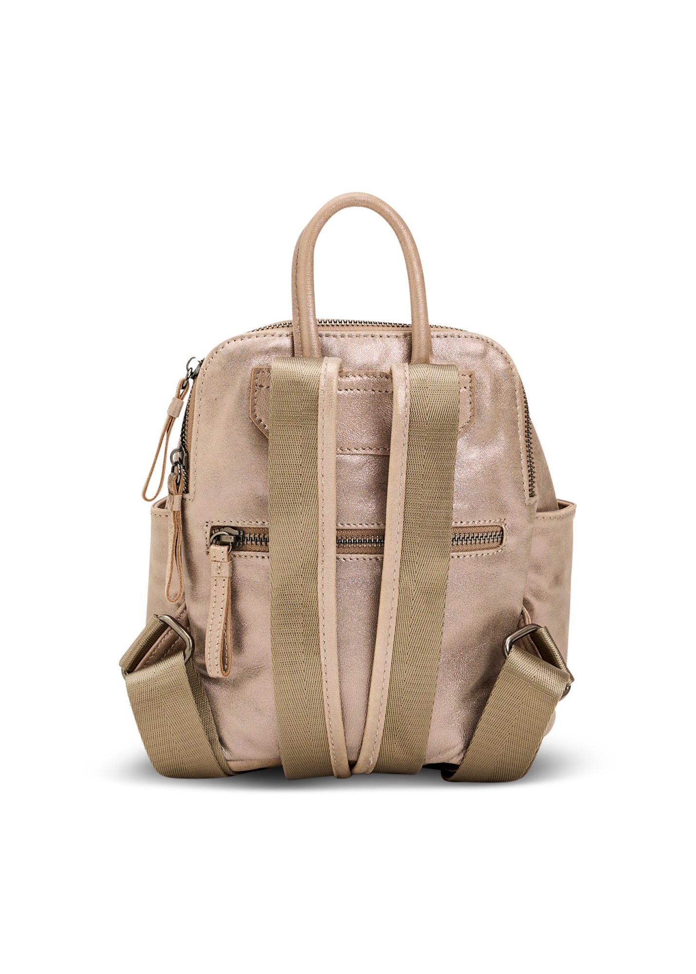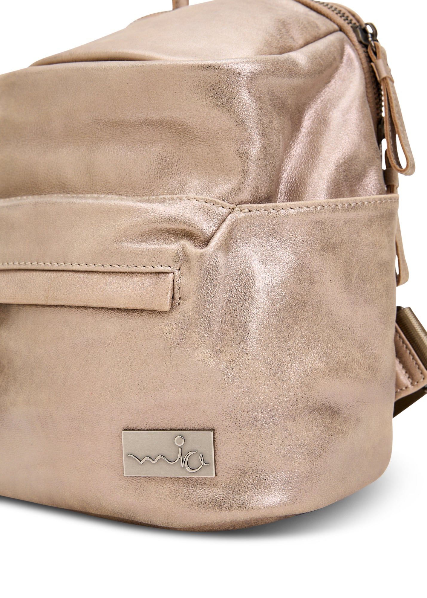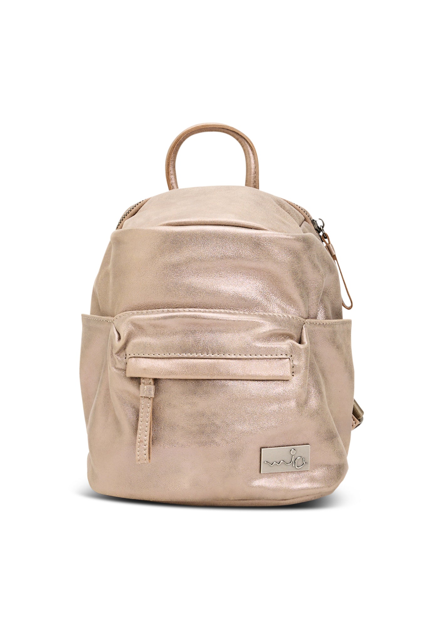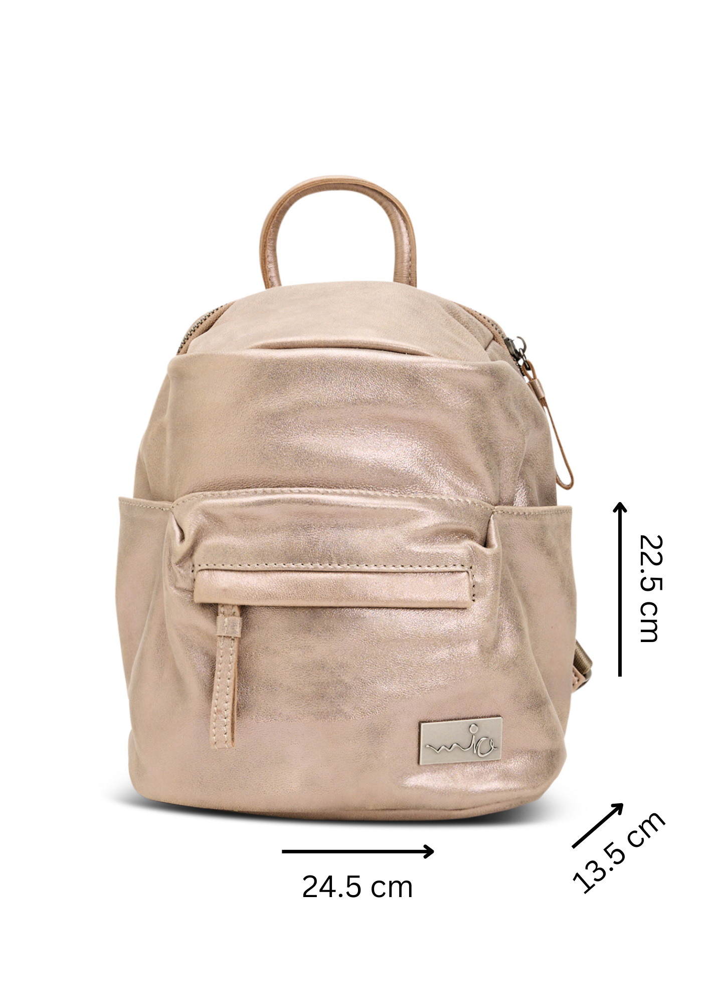 תיק גב מעוצב, העשוי מעור איכותי ורך במיוחד בגימור מטאלי מבריק. מתאפיין בעיצוב חכם ופונקציונלי עם תא מרכזי גדול וסגירת רוכסן עליון מלא המבטיח אבטחה מקסימלית לחפצים האישיים שלך ובחזית הקדמית והאחורית תא נוסף. בעל ידיות נשיאה קצרות ומרופדות המאפשרות אחיזה נוחה ורצועות כתפיים רחבות ומרופדות הניתנות להתאמה לאורך רצוי ומעניקות נוחות מקסימלית גם בנשיאה ממושכת. המבנה הפנימי מאורגן בצורה מושלמת, מתאים לאחסון נוח של ארנק, טלפון, מפתחות וכל הפריטים החיוניים לשגרת היום בצורה קומפקטית ונגישה.