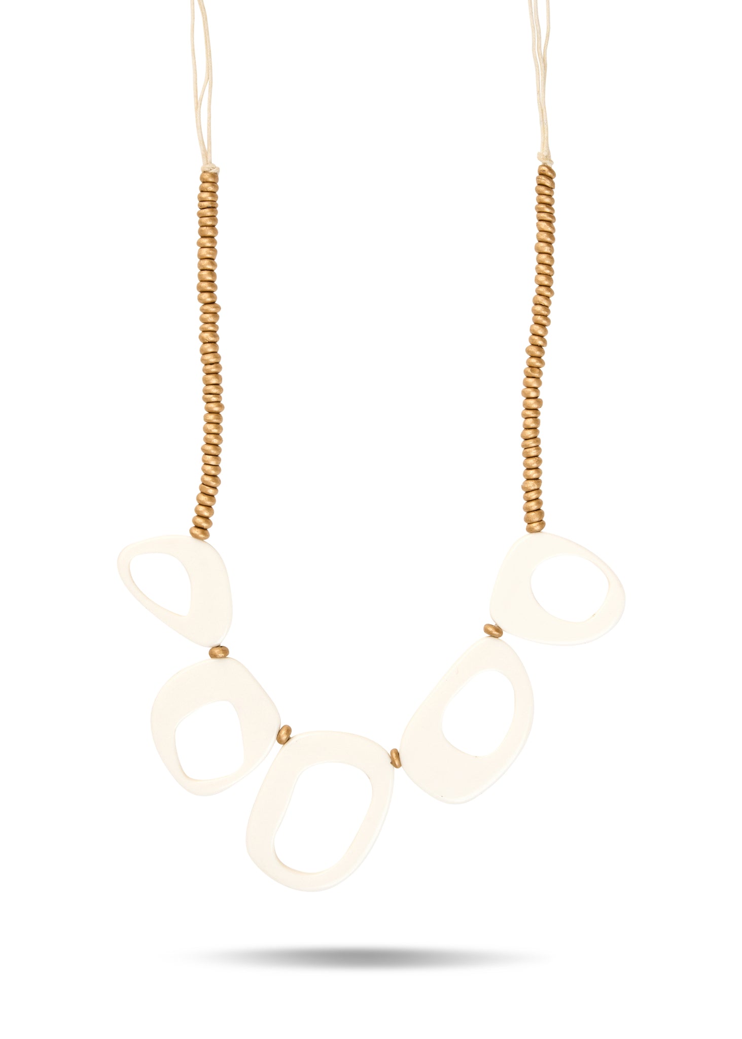 שרשרת מעוצבת בעבודת יד העשויה מחרוזים קטנים המפרידים בין טבעות חלולות של רזין בגדלים שונים. לנוחות מקסימלית ניתן לשנות את אורך השרשרת.