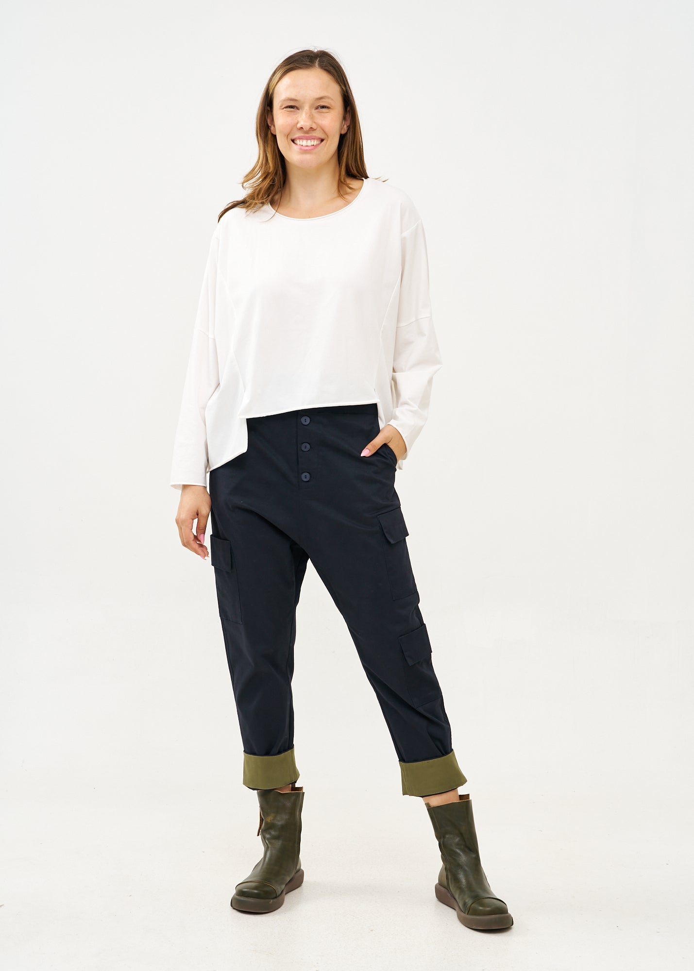 בחזית המגף יש תפר מודגש המוסיף מימד נוסף לעיצוב ומדגיש את המבנה האיכותי של הנעל. סוליית הגומי השטוחה והעבה במיוחד מספקת יציבות מושלמת, אחיזה מעולה ונוחות לאורך כל היום, מה שהופך את המגפונים למושלמים לשימוש ממושך.