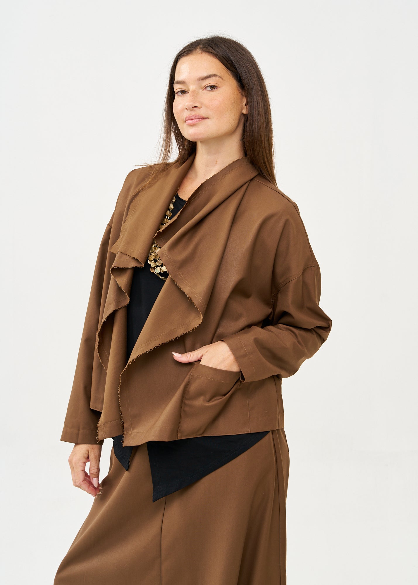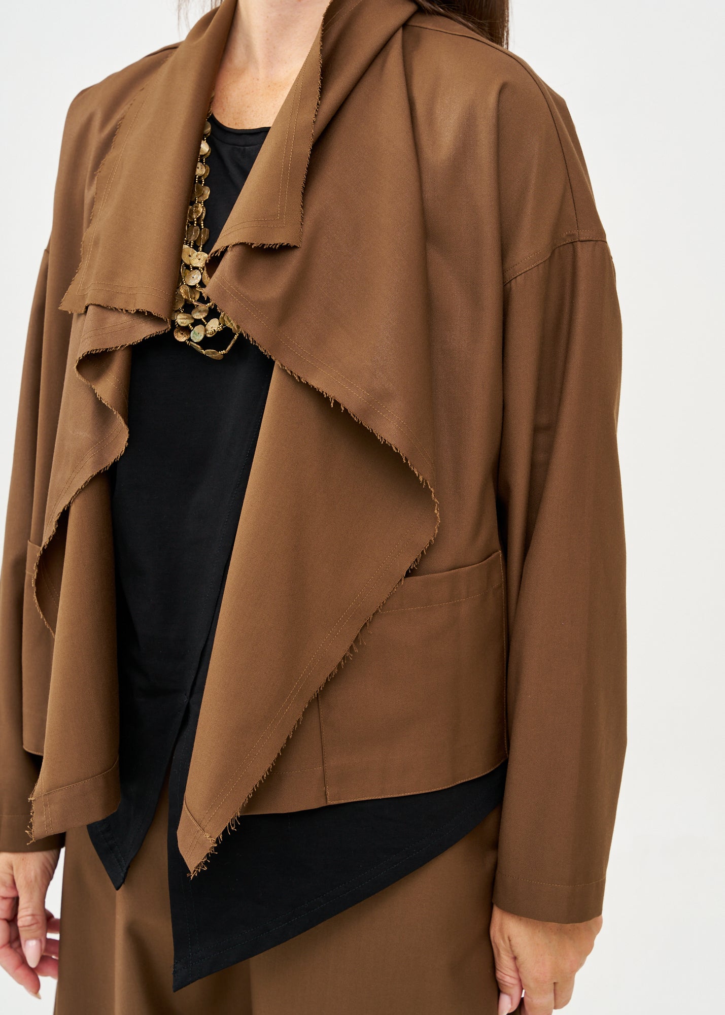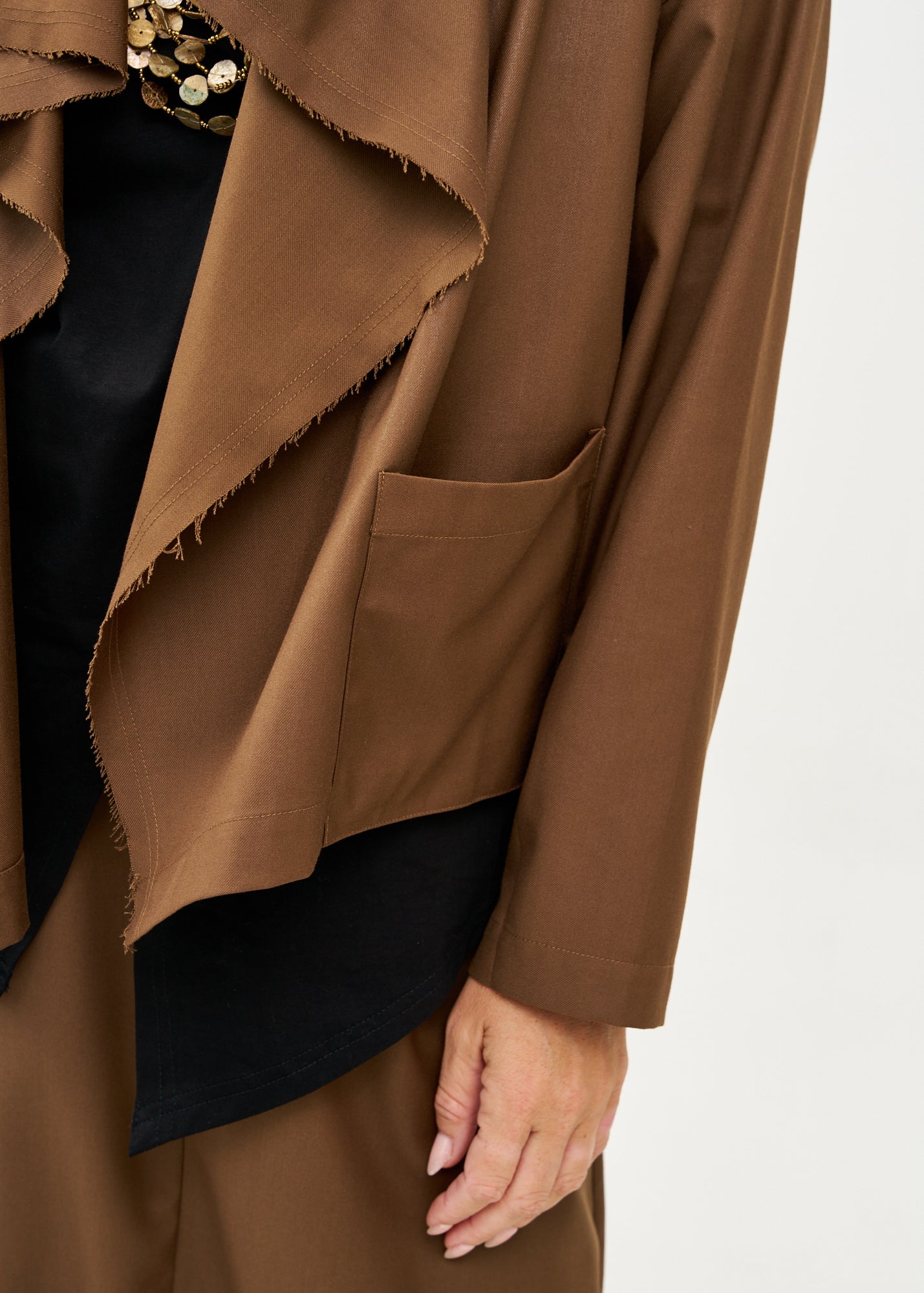 עליונית אלגנטית ומתוחכמת בגזרה קלאסית ונקייה המחמיאה לכל מבנה גוף עם שרוולים ארוכים וכיסים צדדיים המעניקים נוחות ופרקטיות. הפריט בעל גימור של שוליים פרומים לאורך הדשים והכיסים המעניקים מראה עשיר ומעוטר.