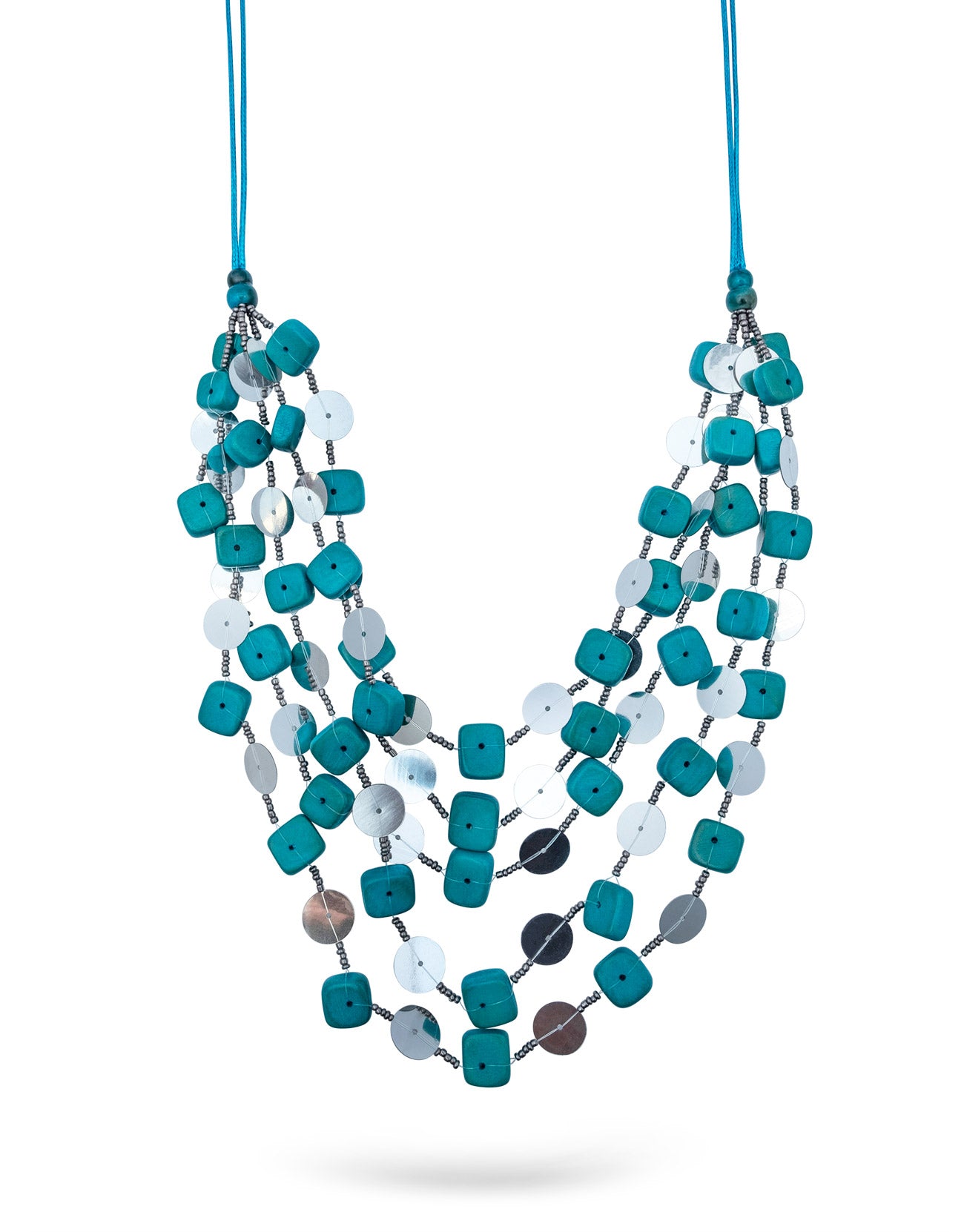 and square beads between which small balls are interwoven and all combine in colorful harmony.