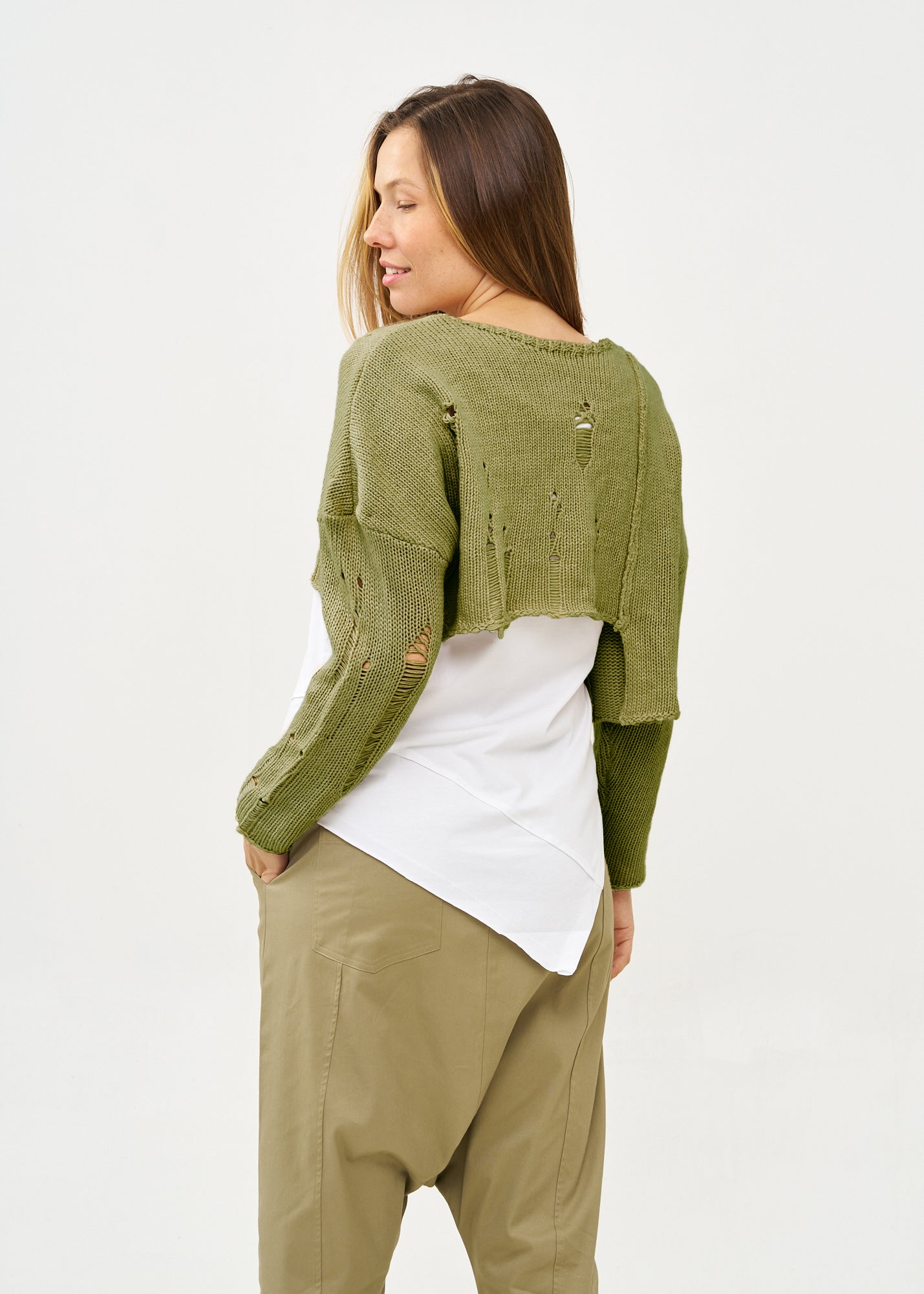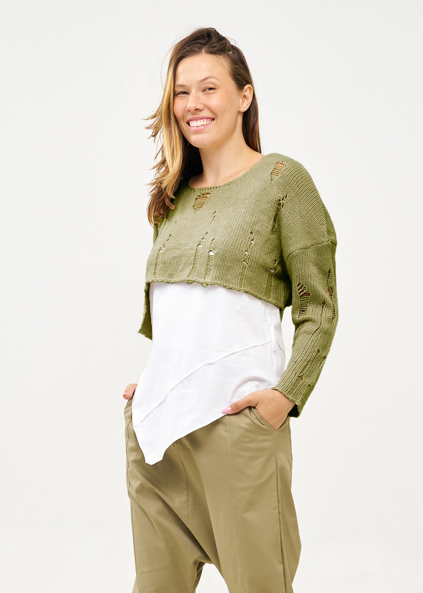 סריג מעוצב בגימור פרום ועדין בגזרה קצרה ורחבה המחמיאה לקו המותניים ויוצרת פרופורציות מושלמות עם צווארון עגול, שרוולים ארוכים וסיומת אסימטרית.