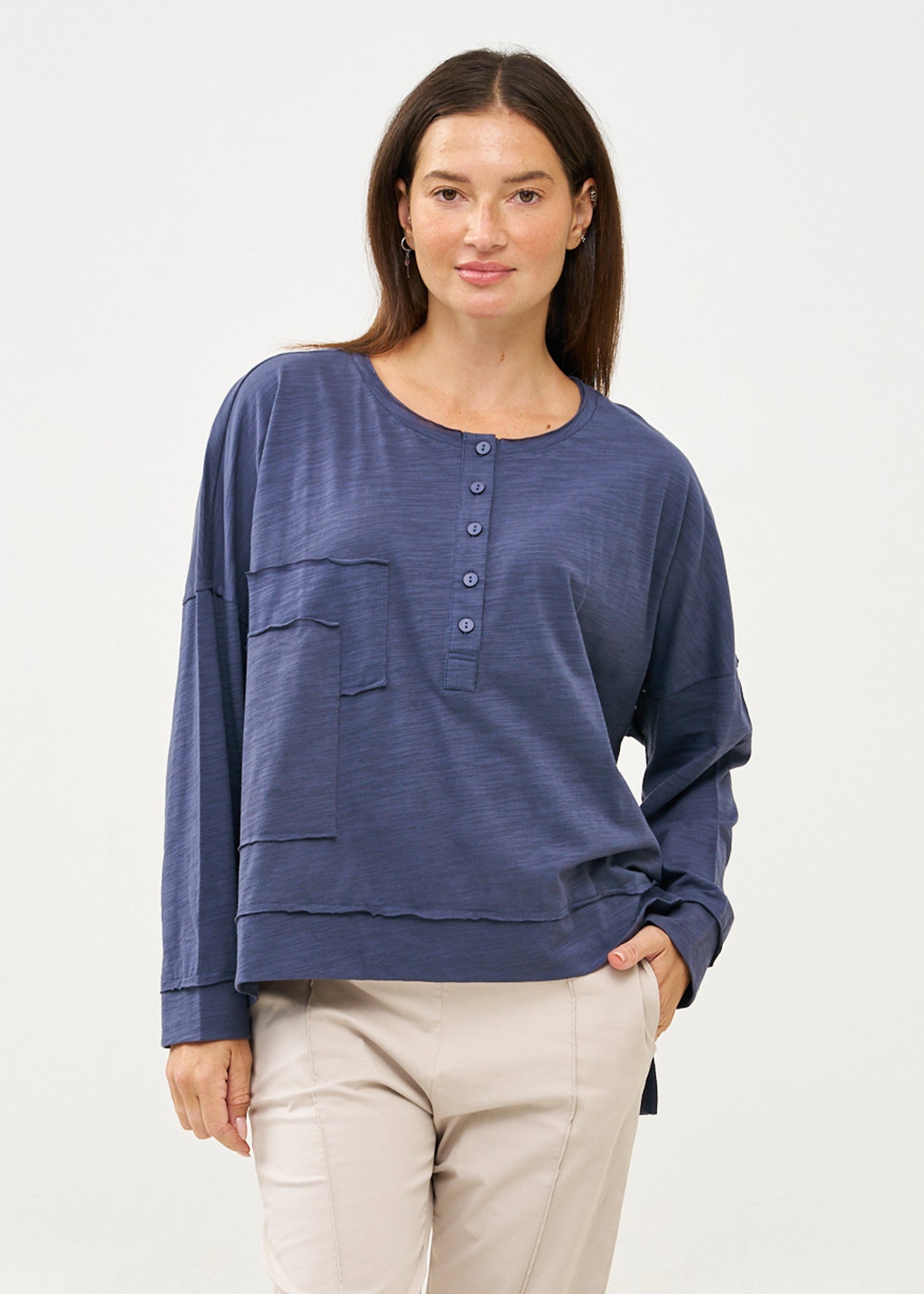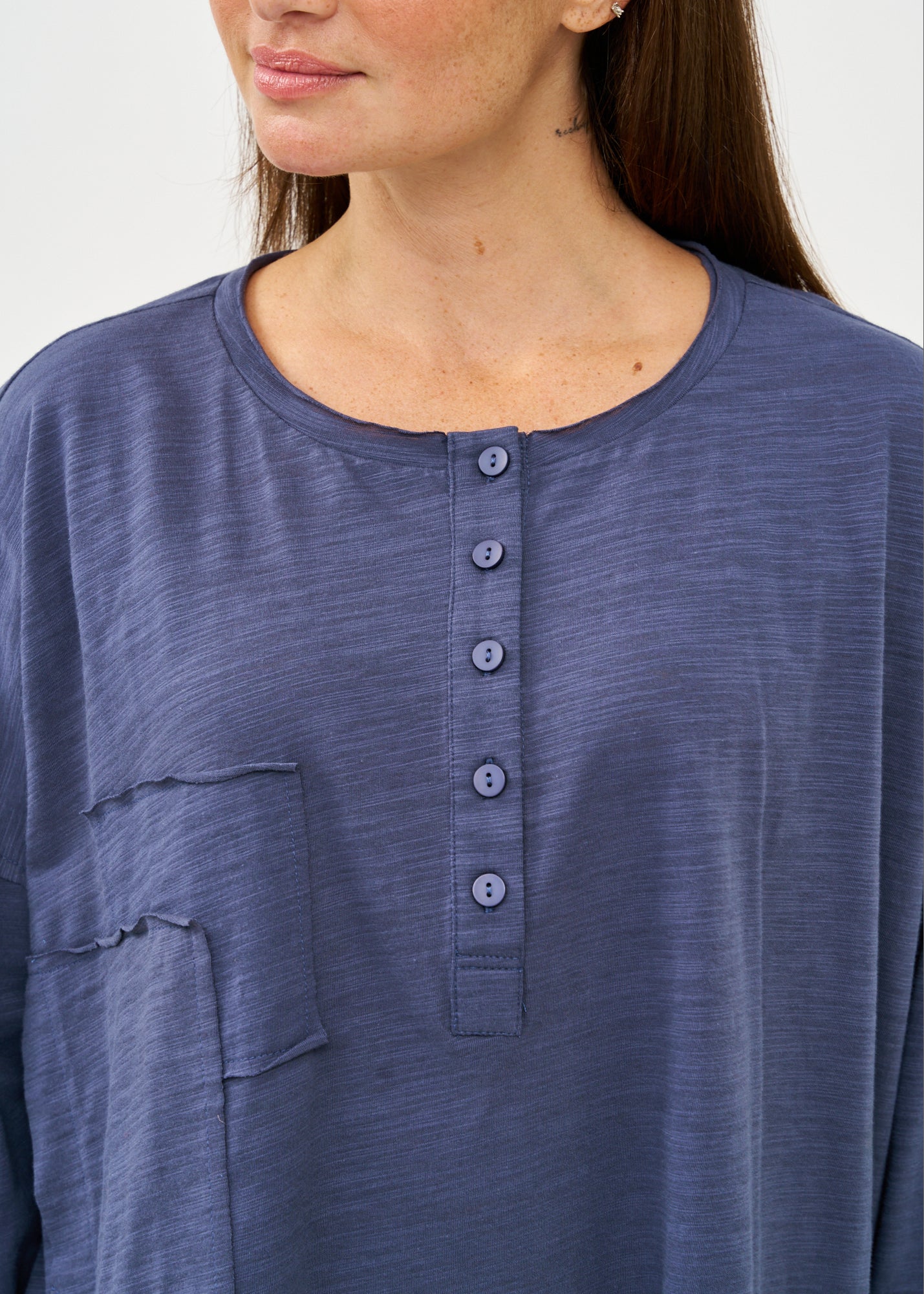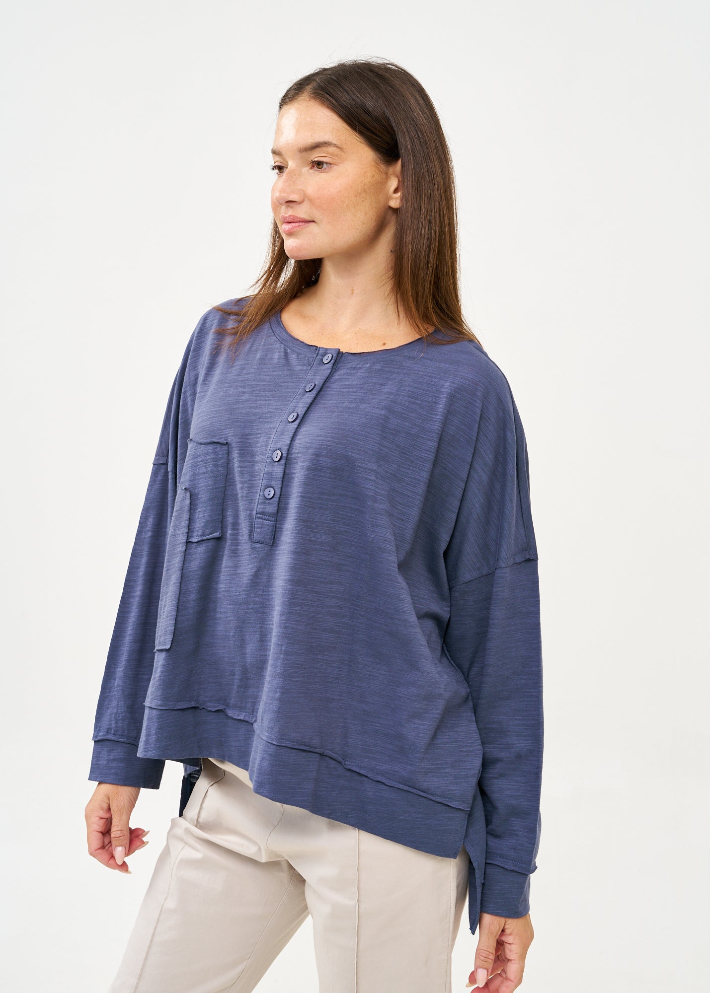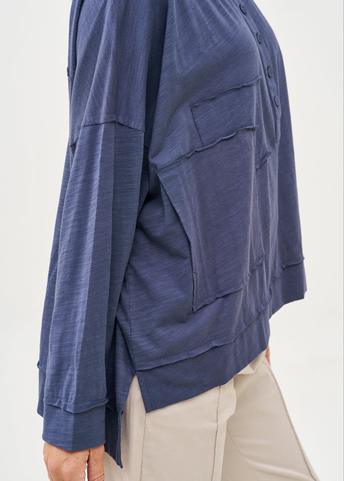 חולצה נינוחה בגזרה משוחררת בעיצוב מיוחד המתבטא בשני ריבועים בגדלים שונים המוצמדים בחזית באופן אסימטרי ובצווארון עגול רחב ונוח, עם חצי כפתרה אלגנטית הכוללת חמישה כפתורים, המאפשרת לך לבחור עד כמה לפתוח את הצווארון ולהתאים את החולצה לסגנון האישי שלך.
