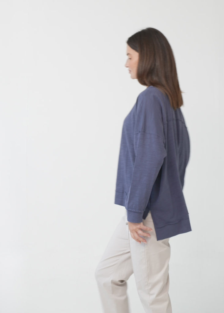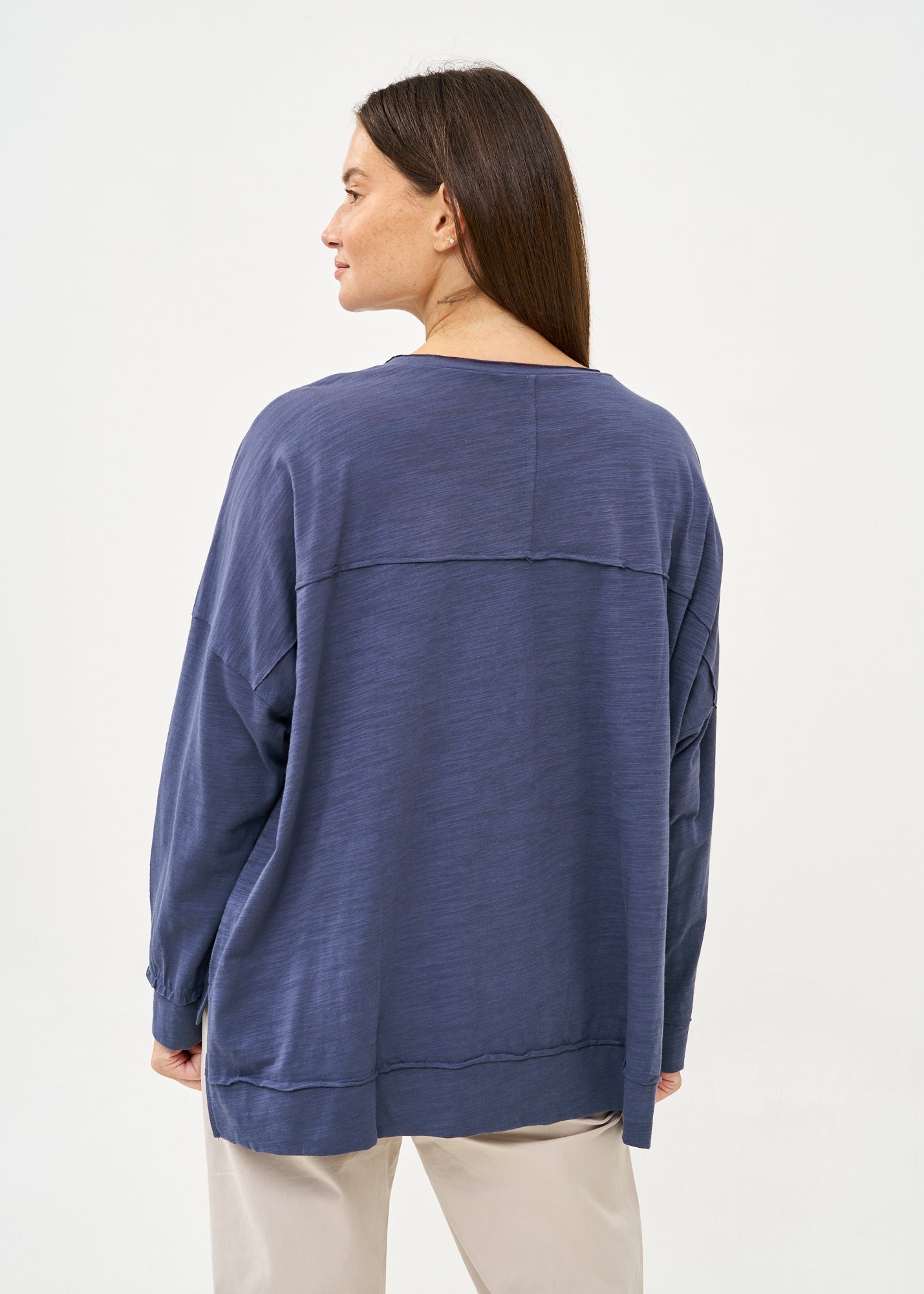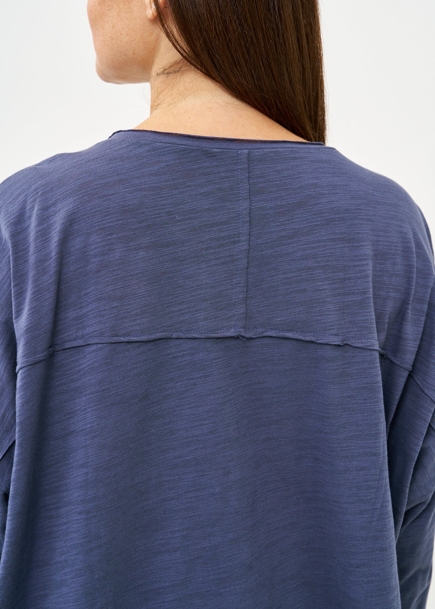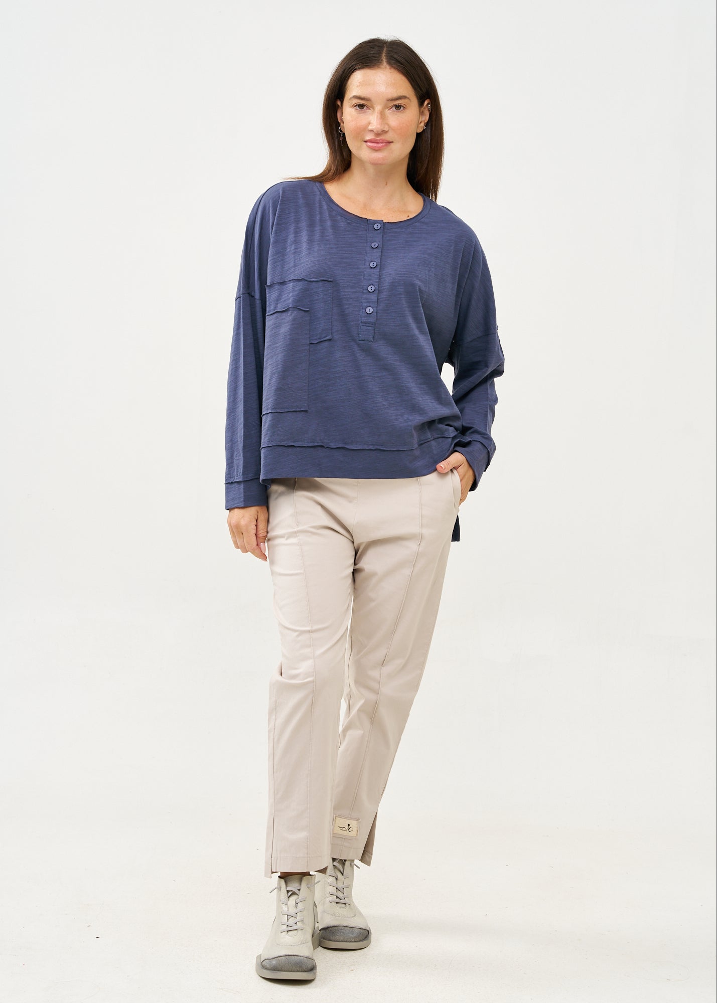 חולצה נינוחה בגזרה משוחררת בעיצוב מיוחד המתבטא בשני ריבועים בגדלים שונים המוצמדים בחזית באופן אסימטרי ובצווארון עגול רחב ונוח, עם חצי כפתרה אלגנטית הכוללת חמישה כפתורים, המאפשרת לך לבחור עד כמה לפתוח את הצווארון ולהתאים את החולצה לסגנון האישי שלך.