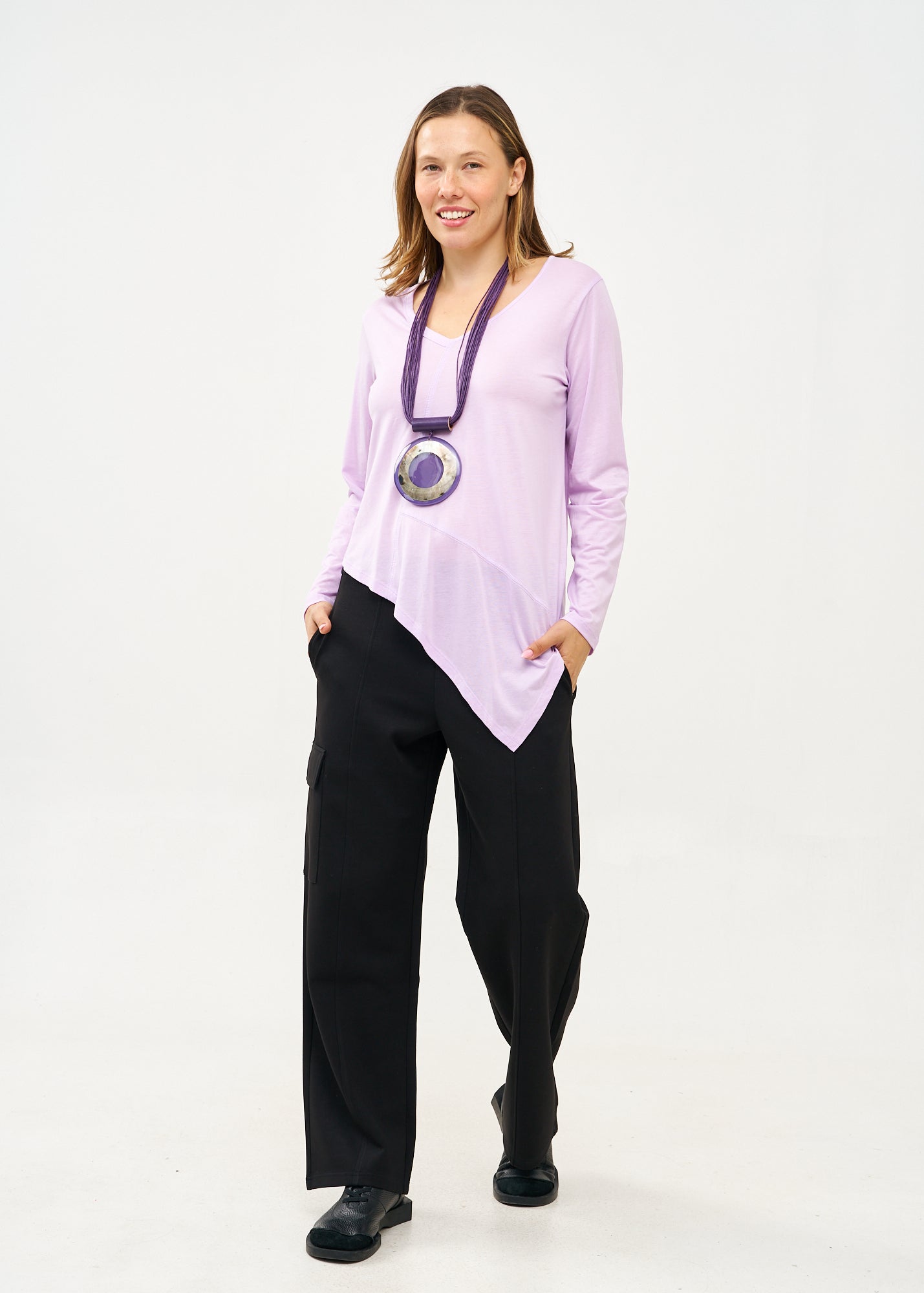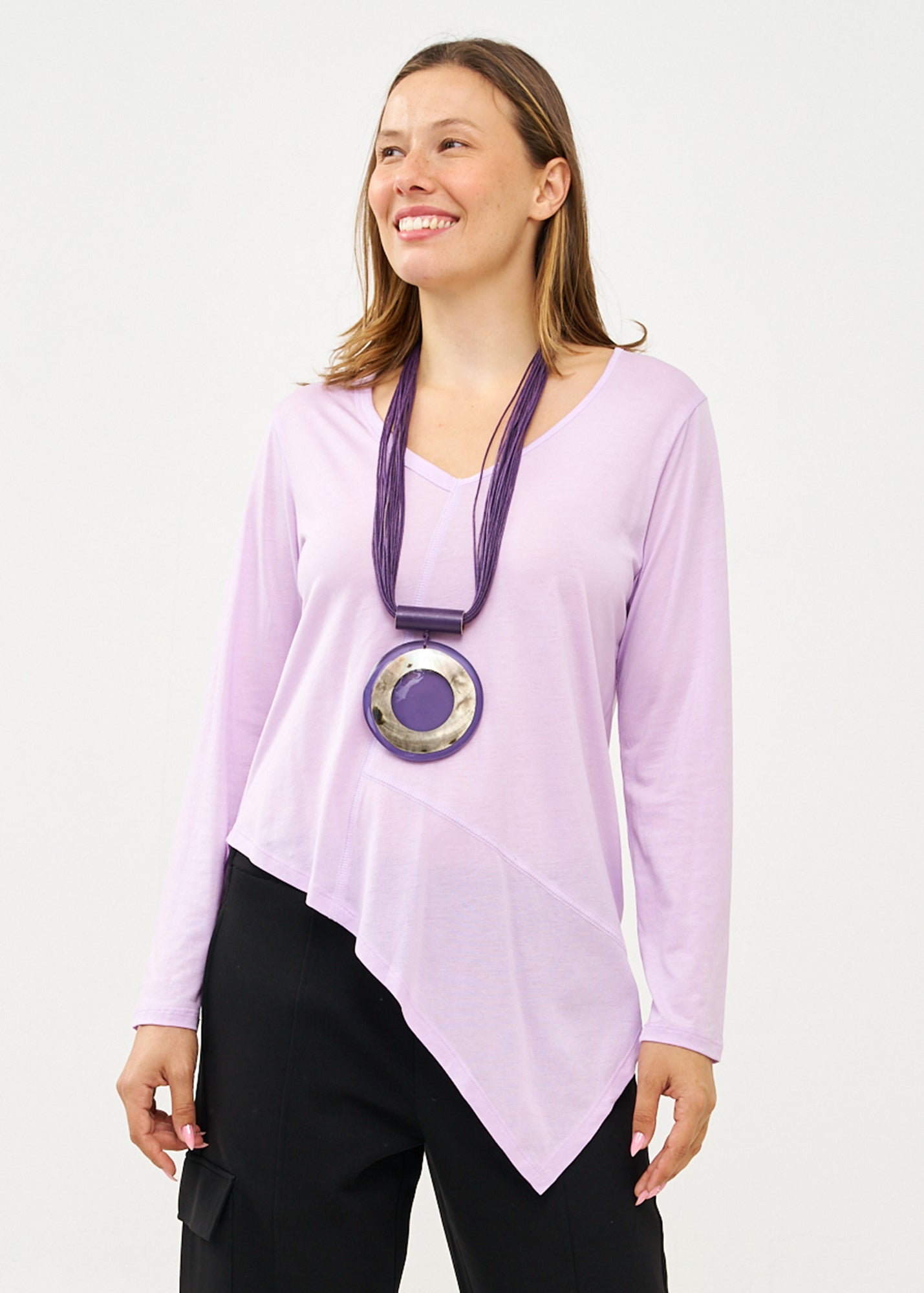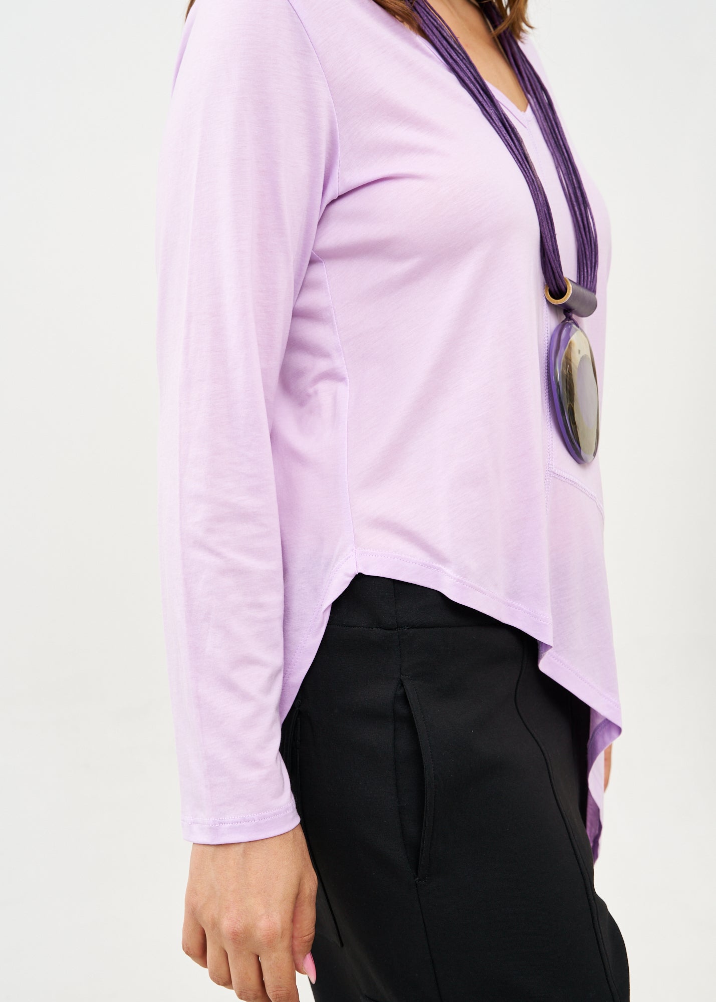 חולצת טישרט בגזרה מעט משוחררת המתאימה בנוחות לכל סוגי הגוף, בעלת סיומת אסימטרית אלכסונית, בעיצוב ייחודי המתבטא במפתח וי מחמיא שמאריך את הצוואר ויוצר קו נשי ואלגנטי, בעוד התפר הדקורטיבי האלכסוני והבולט עובר לאורך הגוף מדגיש ומחטב.