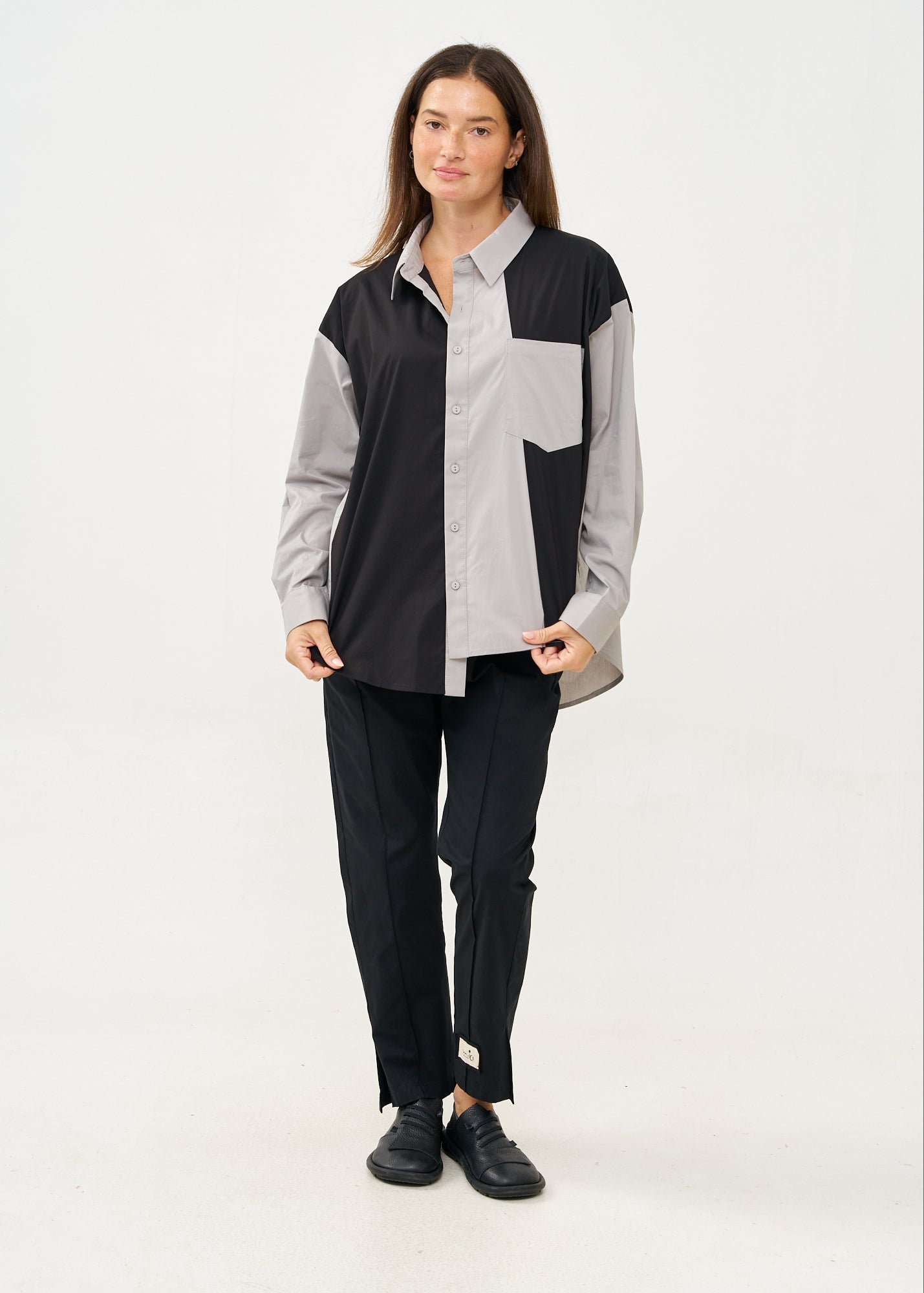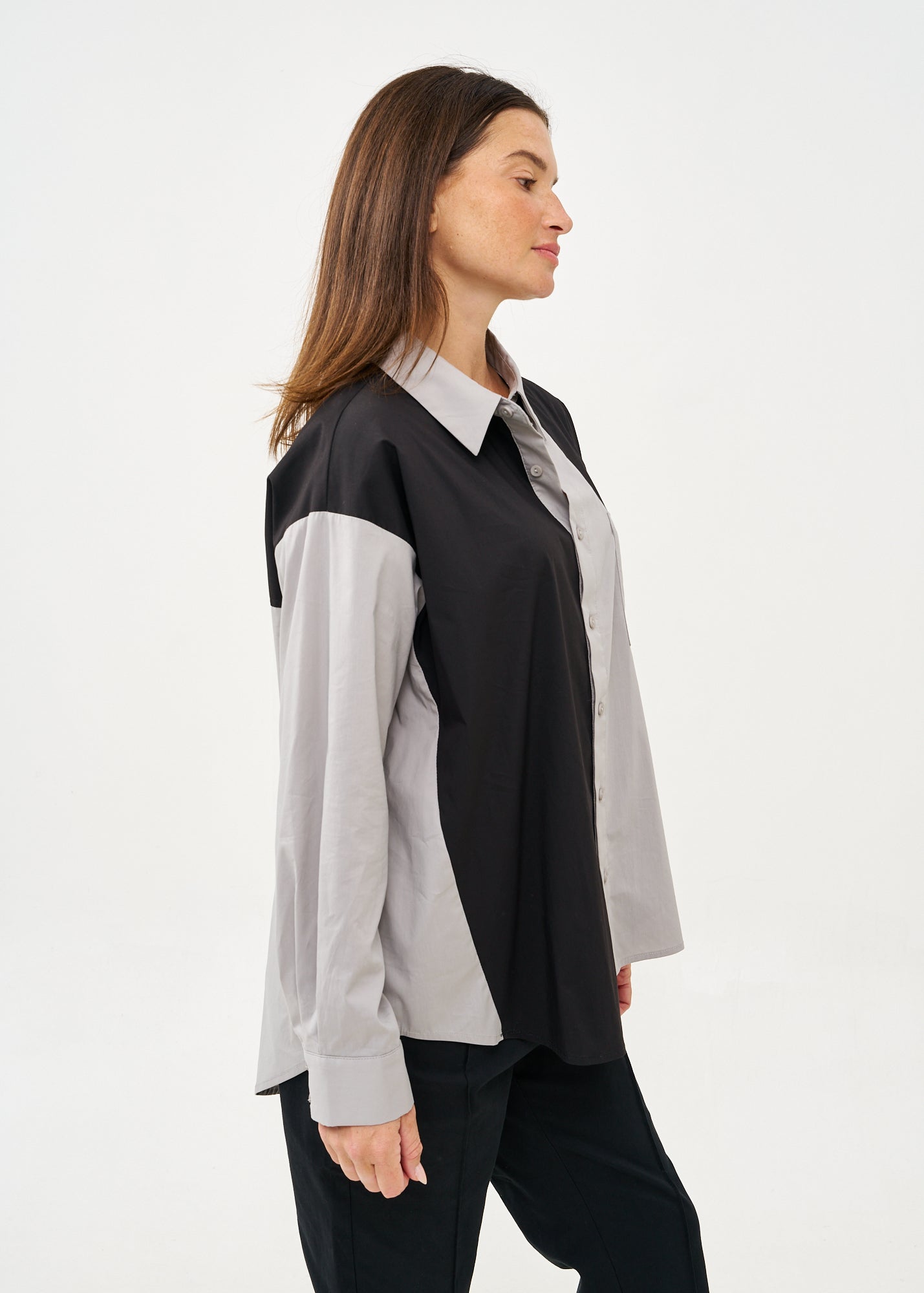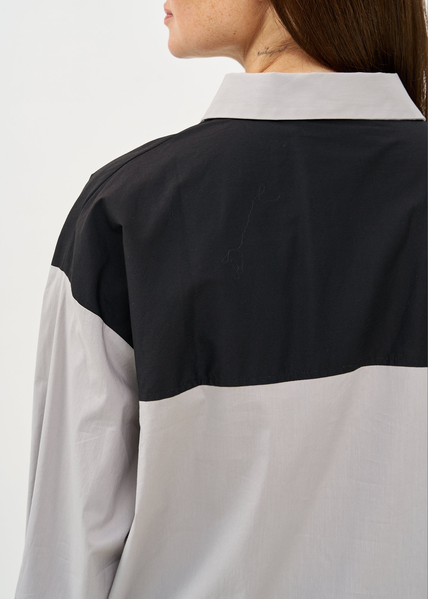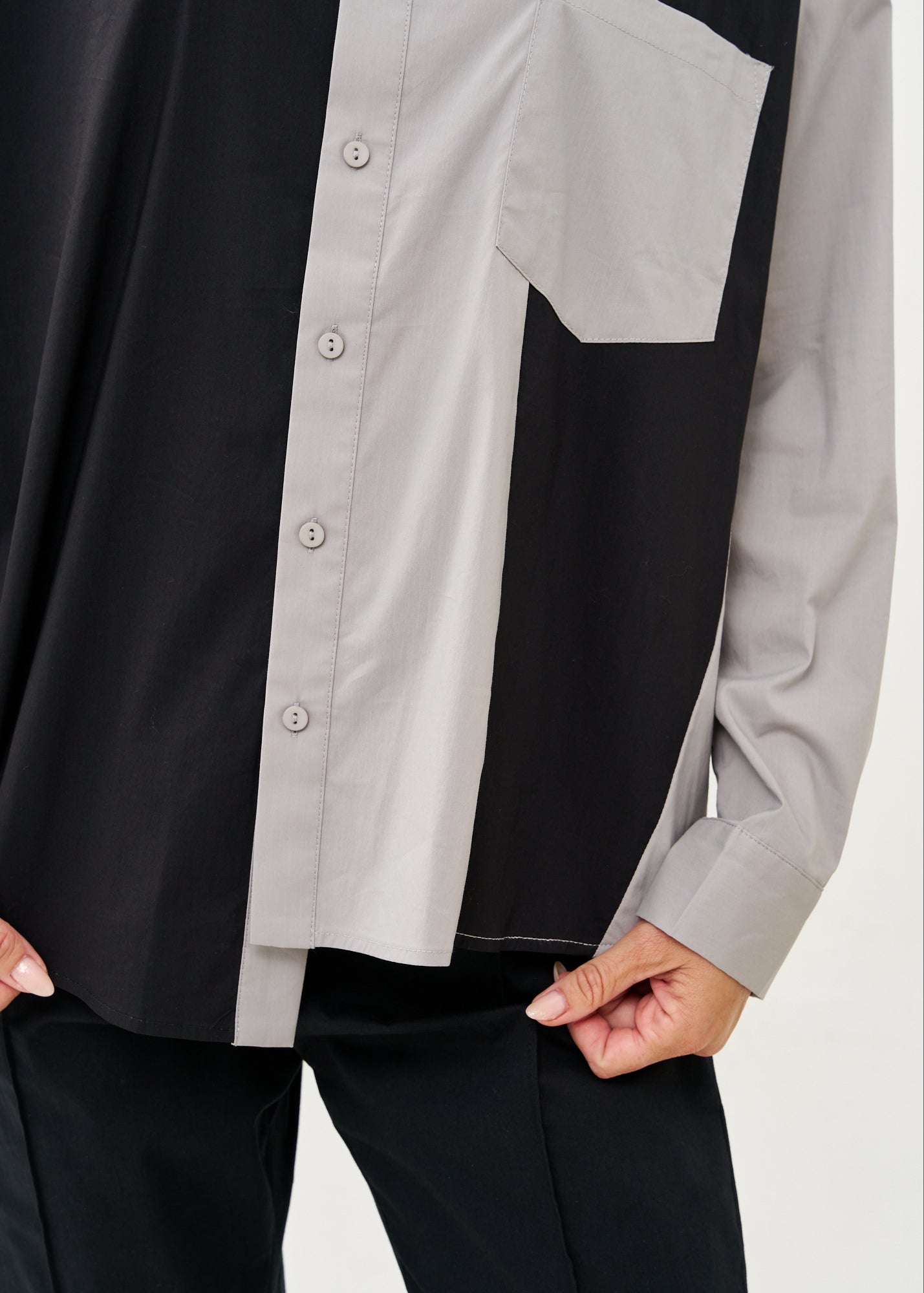 חולצה אלגנטית ומרשימה בגזרה משוחררת ובעיצוב אסימטרי מיוחד המתבטא בחלוקה דינמית של שני הצבעים לאורך החזית, השרוולים והגב, כאשר כל חלק מקבל את הגוון המתאים לו בצורה אמנותית המושכת את העין. בעלת צווארון קלאסי, סיומת ארוכה יותר מאחור ושרוולים ארוכים מעוצבים עם שני כפתורים, המאפשרים התאמה אישית.