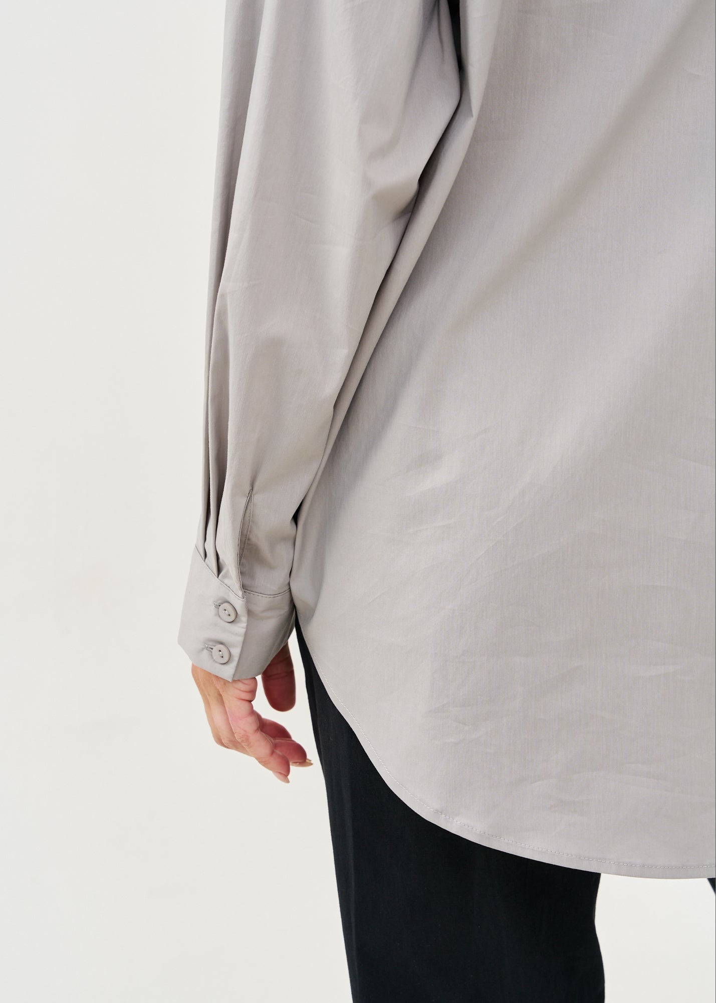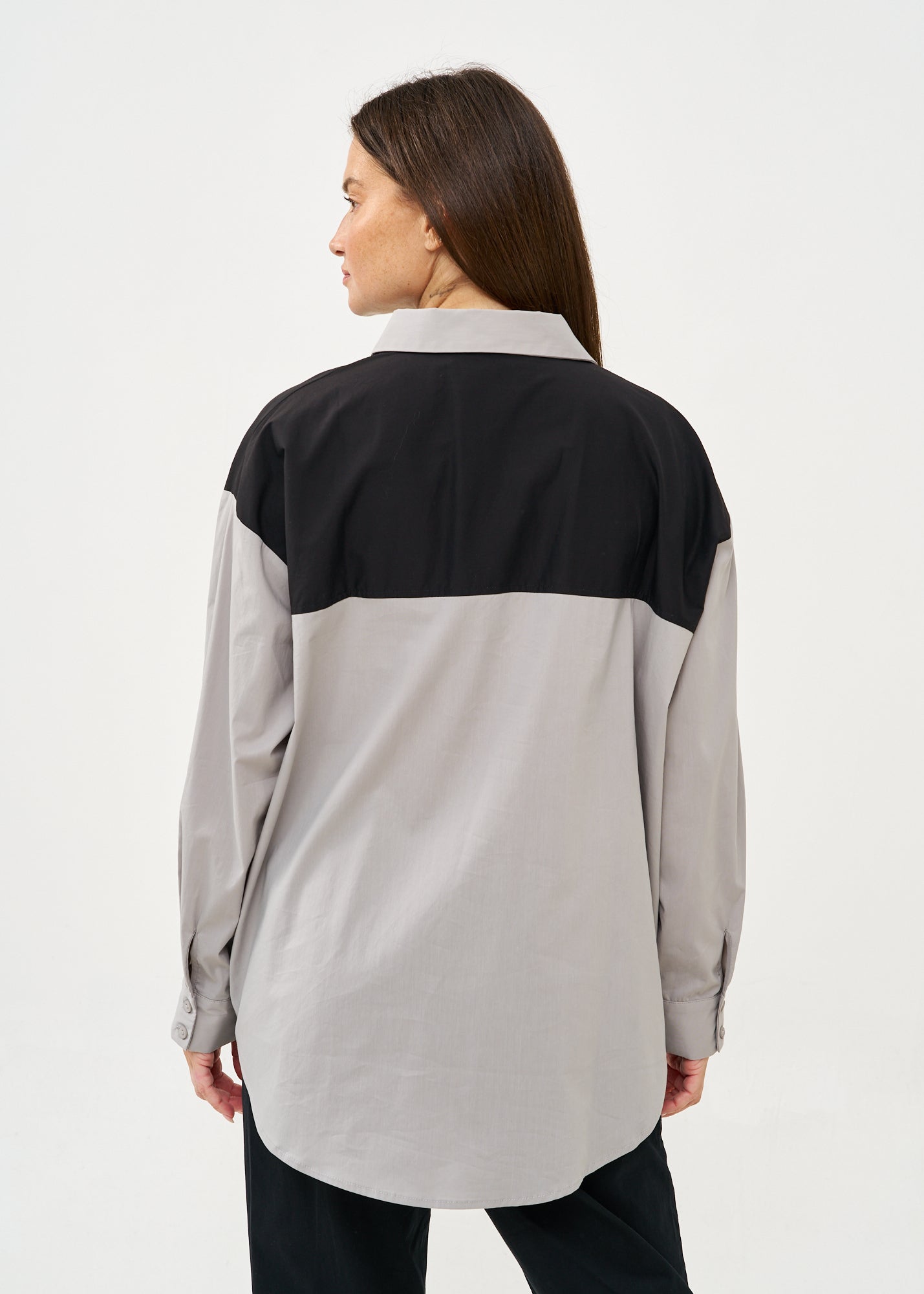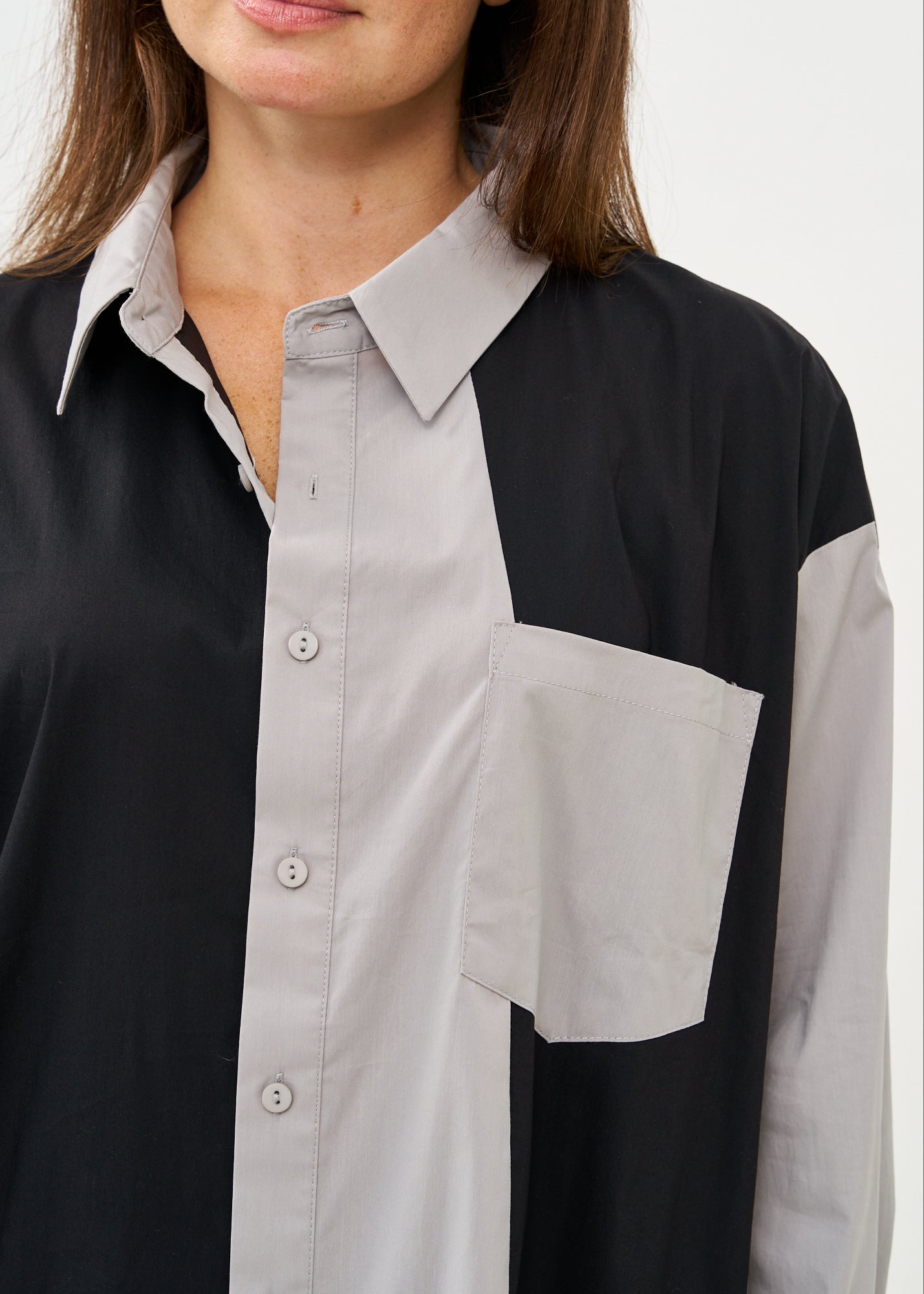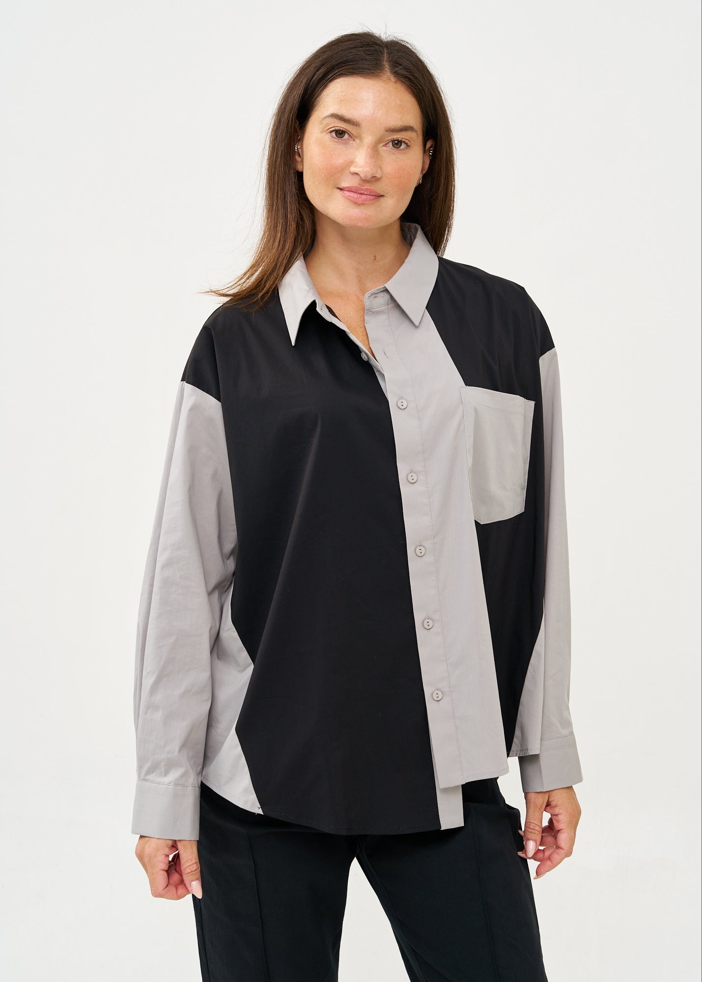 חולצה אלגנטית ומרשימה בגזרה משוחררת ובעיצוב אסימטרי מיוחד המתבטא בחלוקה דינמית של שני הצבעים לאורך החזית, השרוולים והגב, כאשר כל חלק מקבל את הגוון המתאים לו בצורה אמנותית המושכת את העין. בעלת צווארון קלאסי, סיומת ארוכה יותר מאחור ושרוולים ארוכים מעוצבים עם שני כפתורים, המאפשרים התאמה אישית.