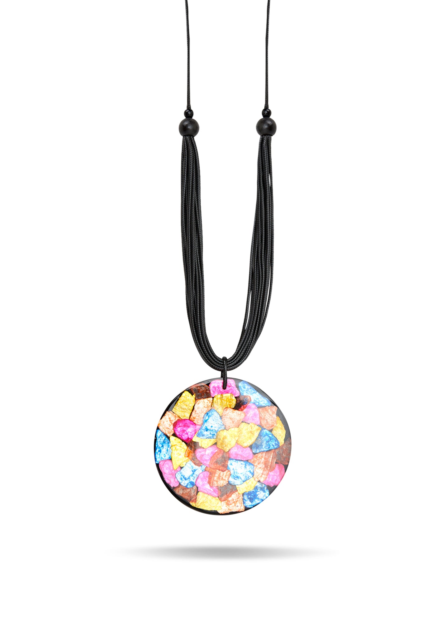 שרשרת מרשימה בעבודת יד המשלבת חוטים מרובים עדינים עם תליון רזין עגול גדול בעיצוב ייחודי עם שילובים פנימיים של טקסטורות וצבעים המשתנים מתליון לתליון. השילוב הייחודי של חומרים שקופים ואטומים, ביחד עם נגיעות מנצנצות, יוצר עומק.