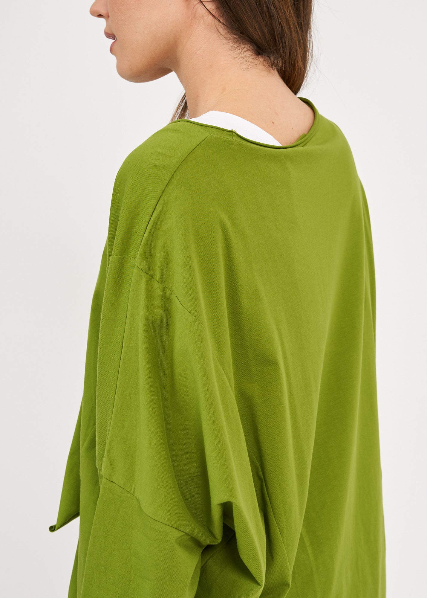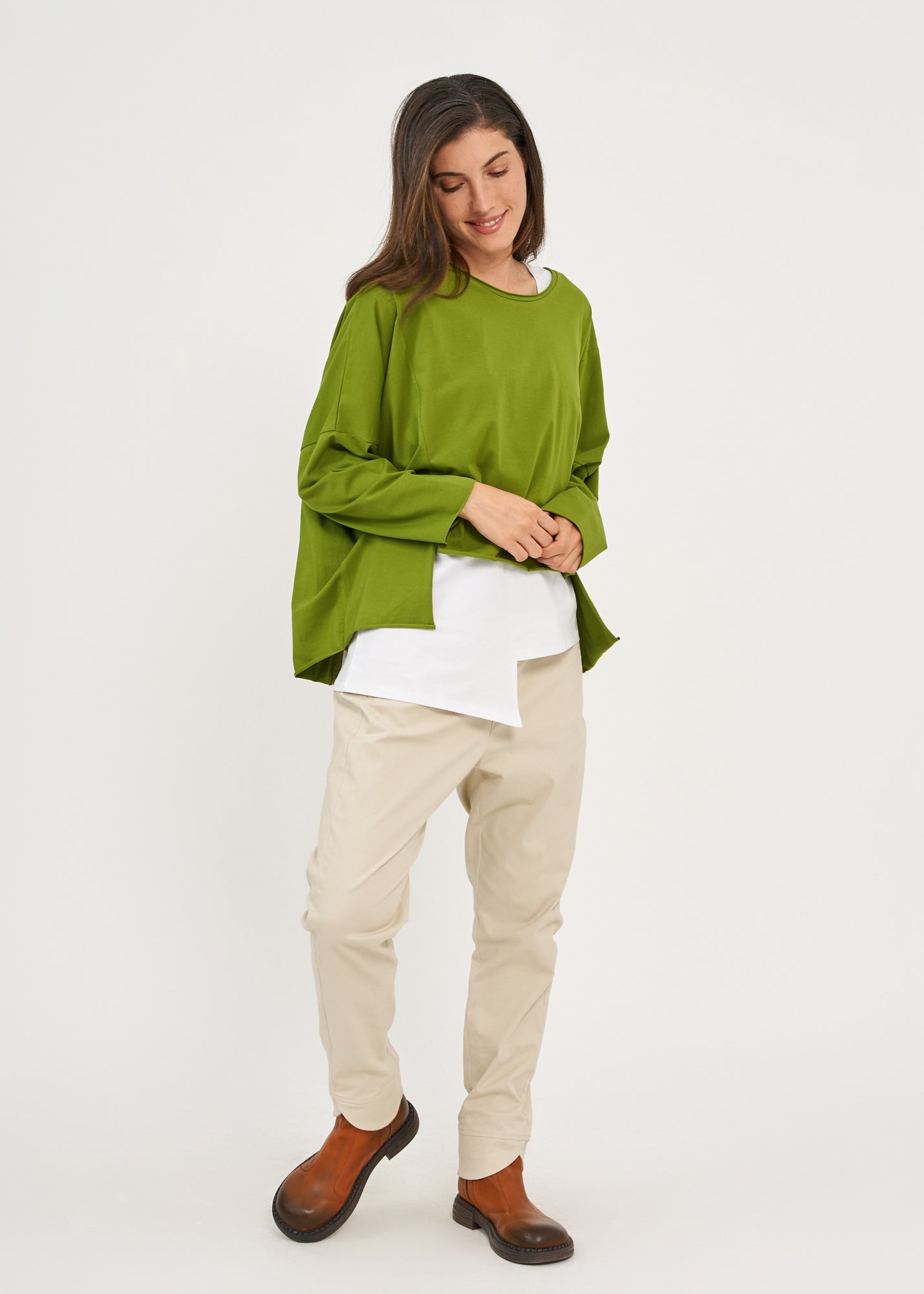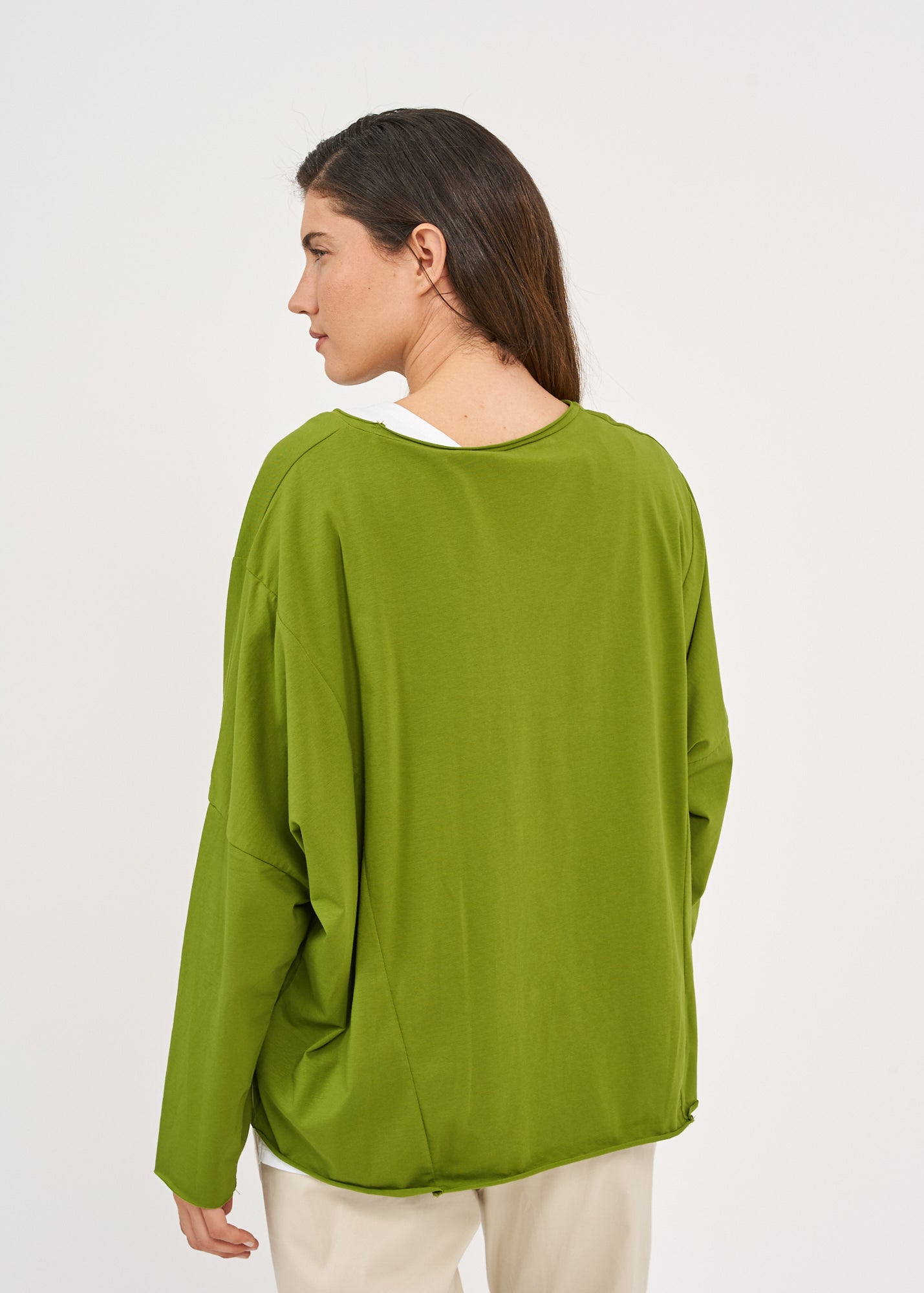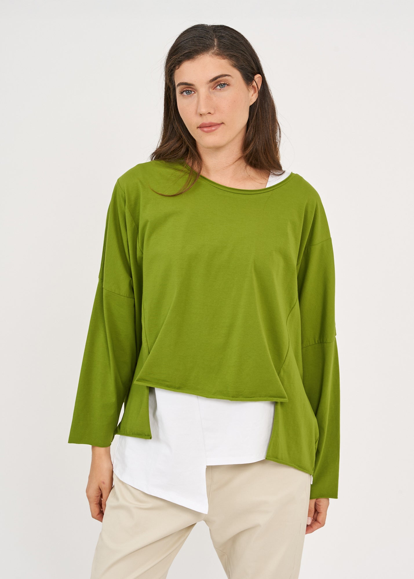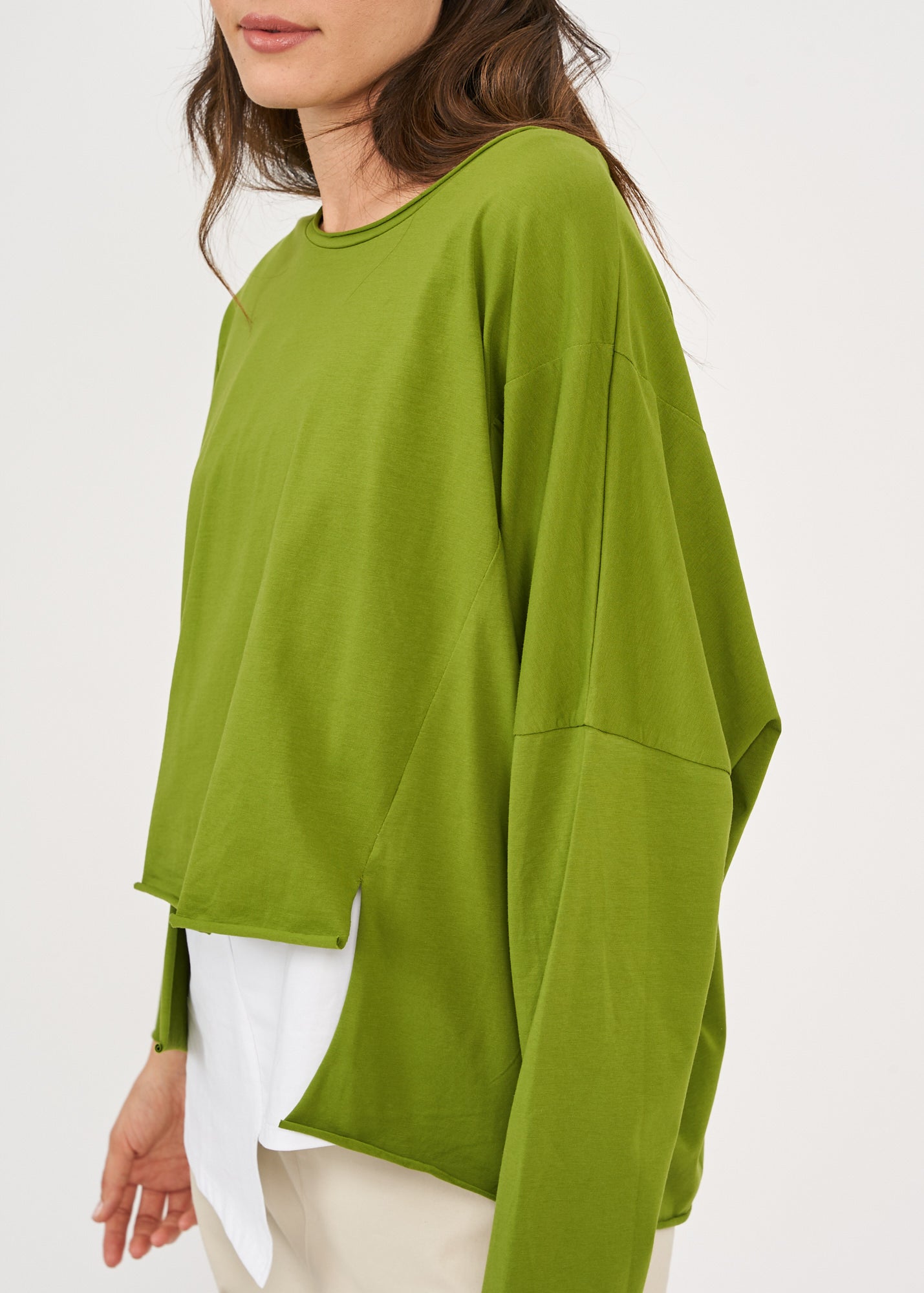 חולצת אוברסייז משוחררת עם צווארון עגול ומחמיא ושרוולים ארוכים עם חיתוך דקורטיבי, בעלת גימור אסימטרי מתוחכם וייחודי.