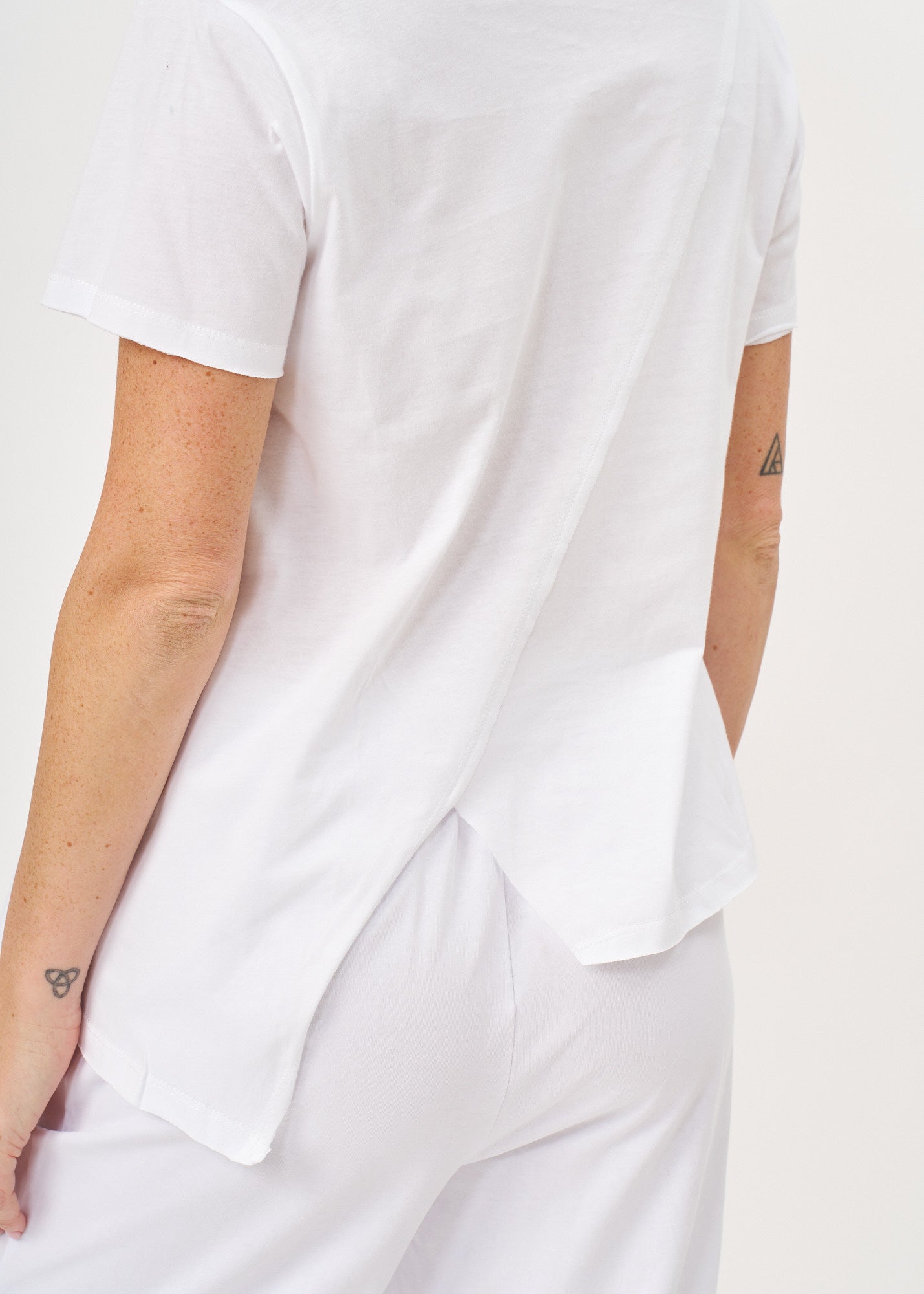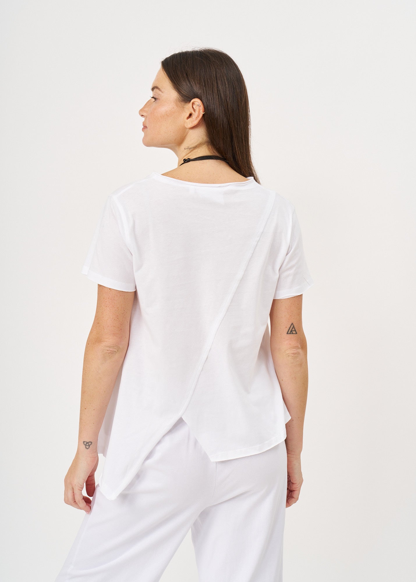 חולצת טישרט מעוצבת בגזרה אסימטרית עם פתח עדין בחלקה האחורי והקדמי. בעלת צווארון וי מחמיא ושרוולים קצרים עם קיפול דקורטיבי מוקפד, לצד תפר אלכסוני בולט הנמתח בחן מהחזית אל עבר הגב.