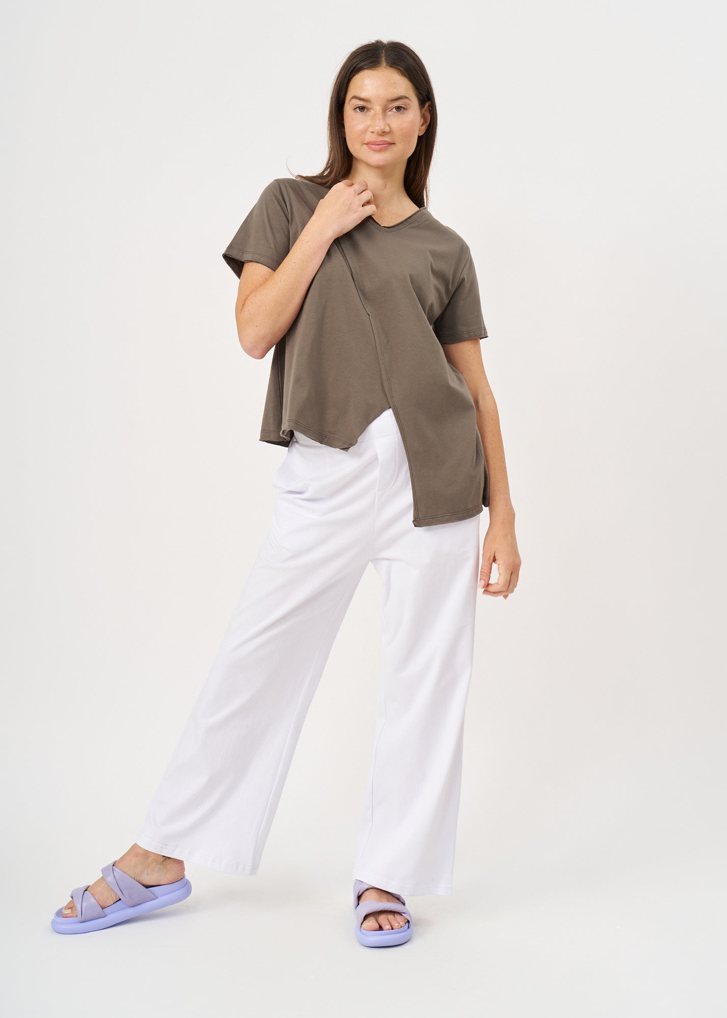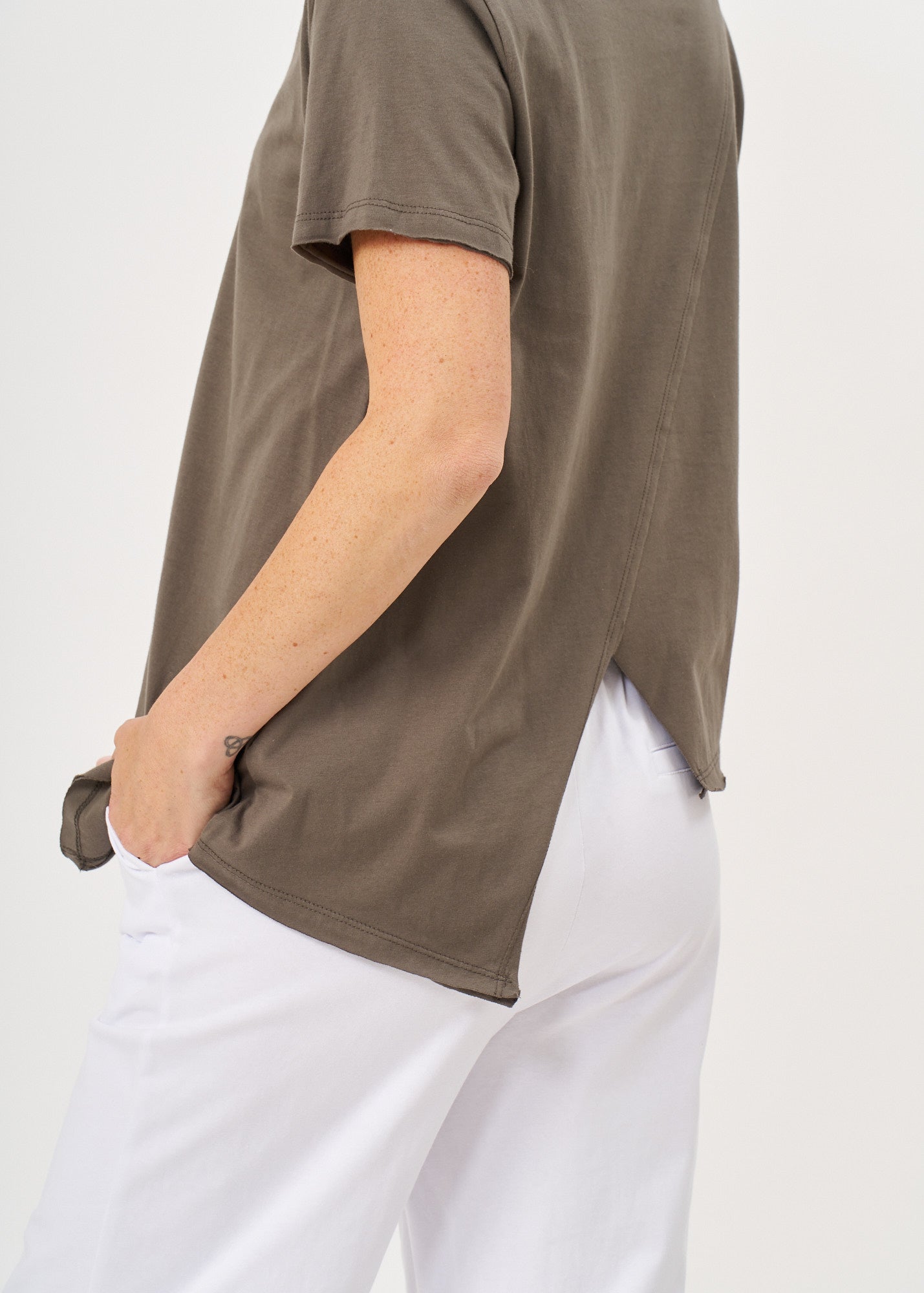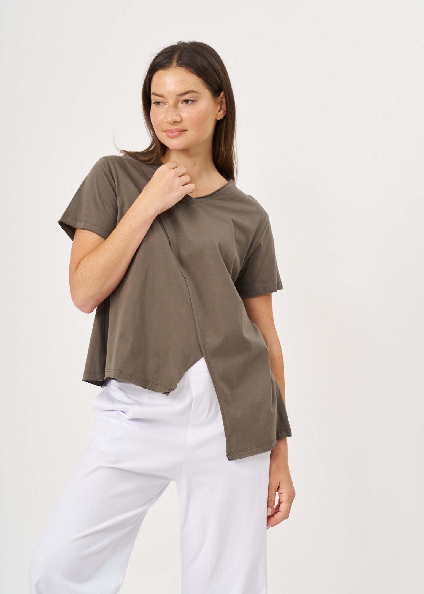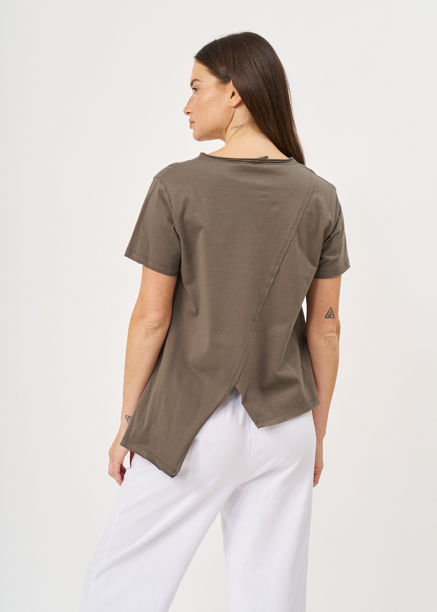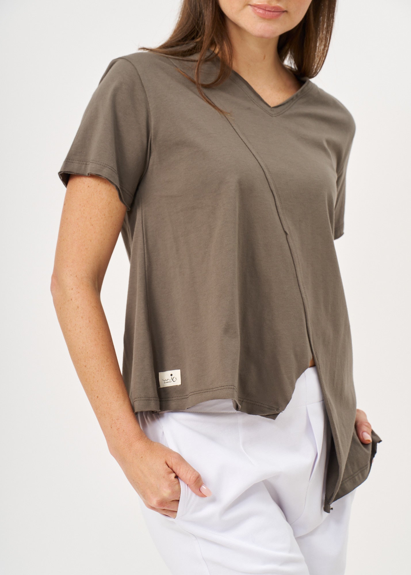 חולצת טישרט מעוצבת בגזרה אסימטרית עם פתח עדין בחלקה האחורי והקדמי. בעלת צווארון וי מחמיא ושרוולים קצרים עם קיפול דקורטיבי מוקפד, לצד תפר אלכסוני בולט הנמתח בחן מהחזית אל עבר הגב.