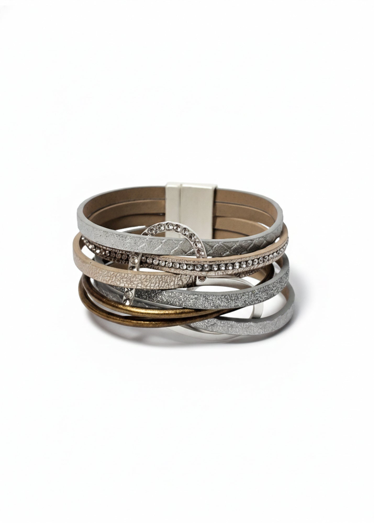 צמיד רצועות עור דקות במספר טקסטורות בצבעים תואמים.