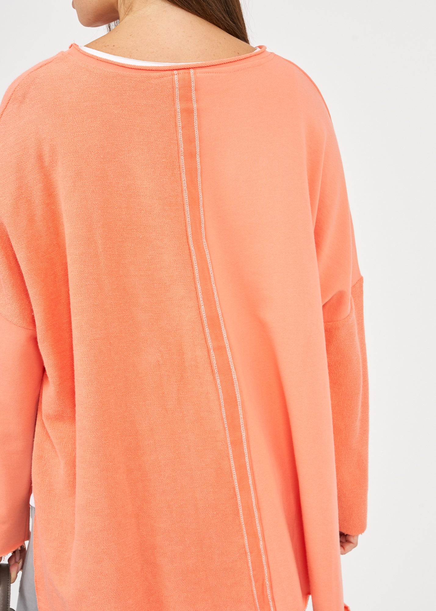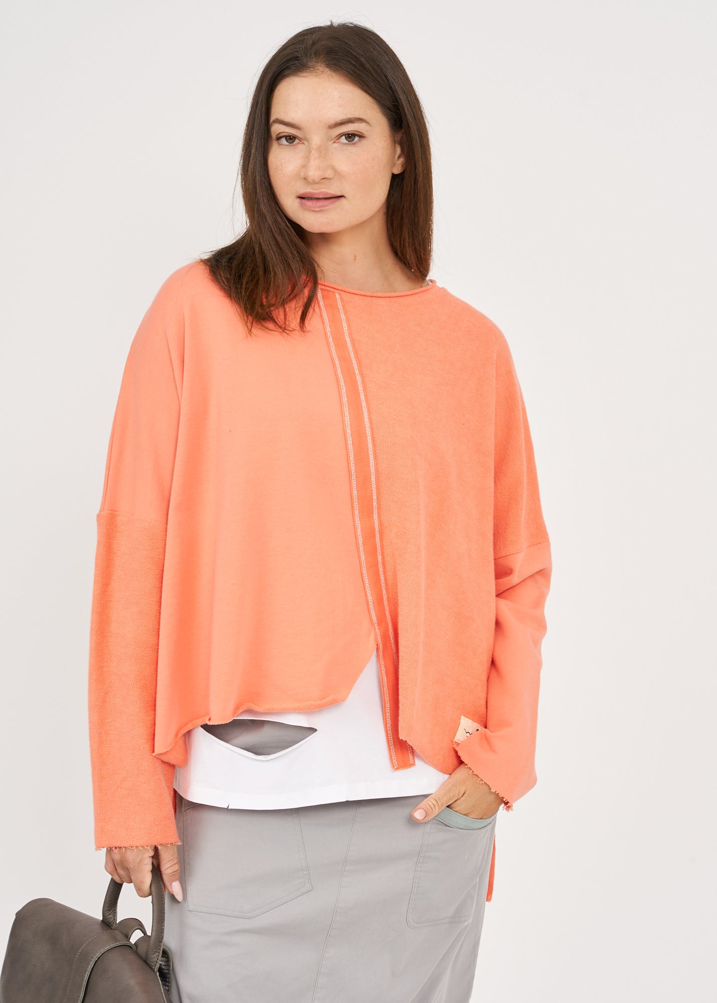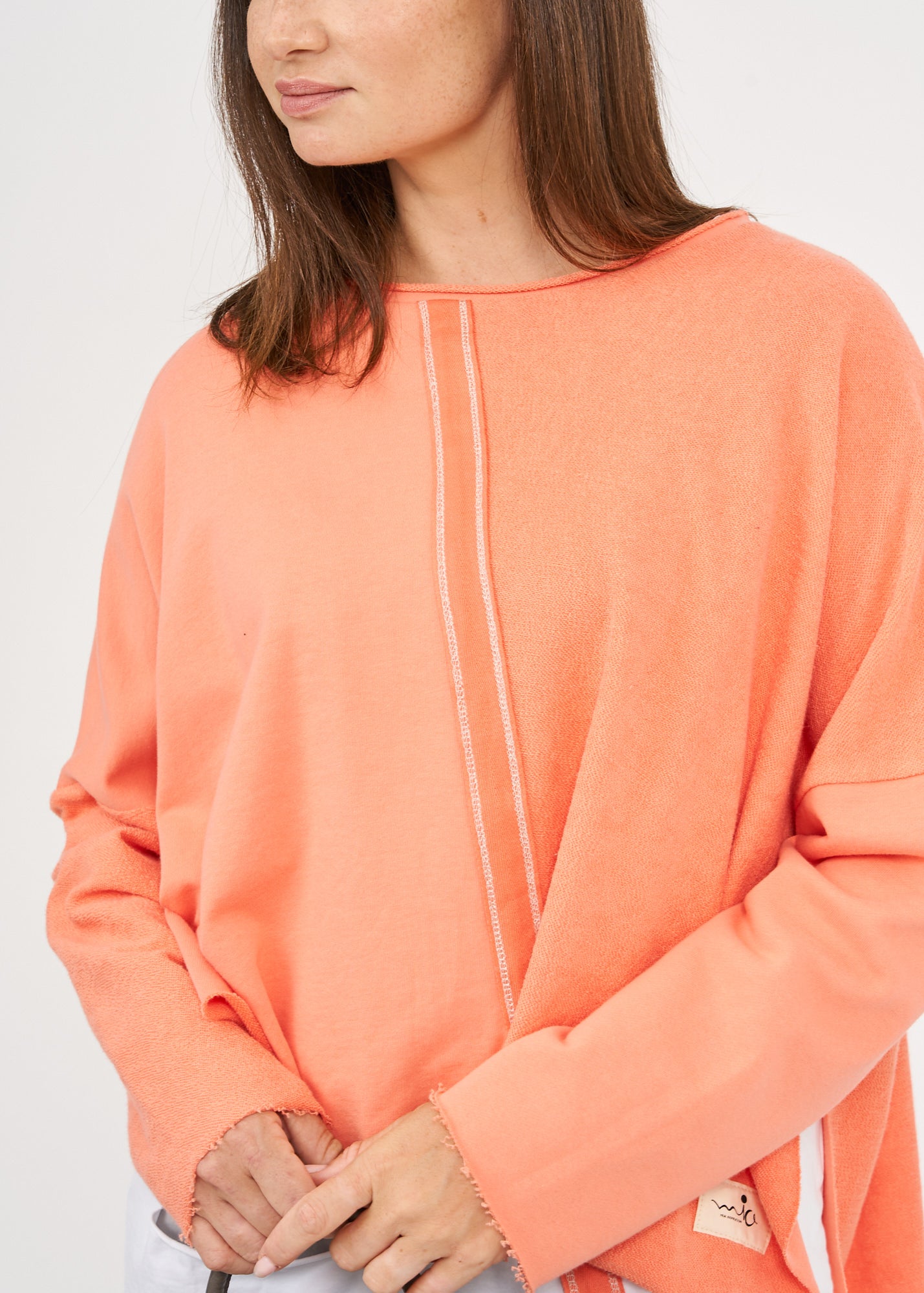 סווטשירט בגזרת אוברסייז משוחררת ונוחה, בעיצוב אסימטרי מיוחד עם שילוב של שני סוגי בדים שונים היוצרים יחד קונטרסט מרקמים מעניין ומראה אופנתי, בנוסף לסרט דקורטיבי העובר לאורך החזית והגב, היוצר קו מעניין שמדגיש את המבנה הייחודי של הפריט ומוסיף מימד עיצובי מתוחכם.