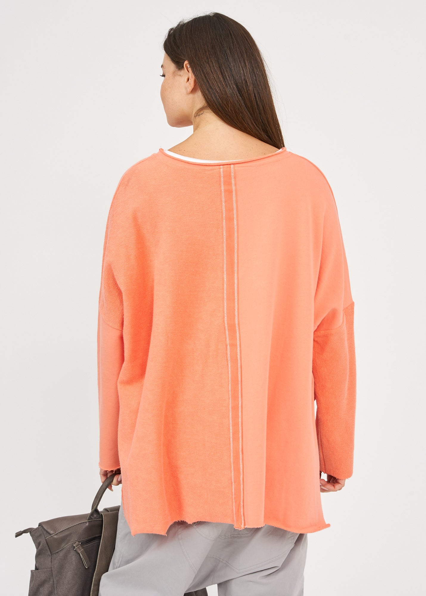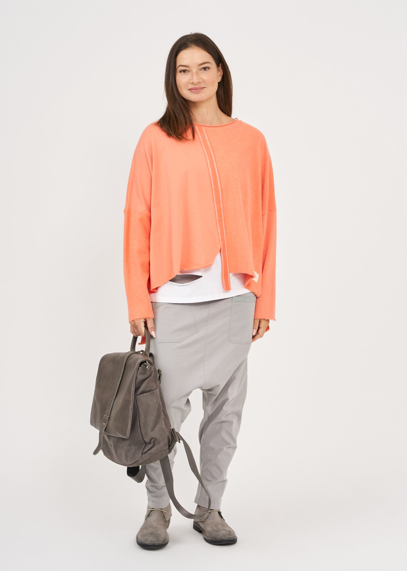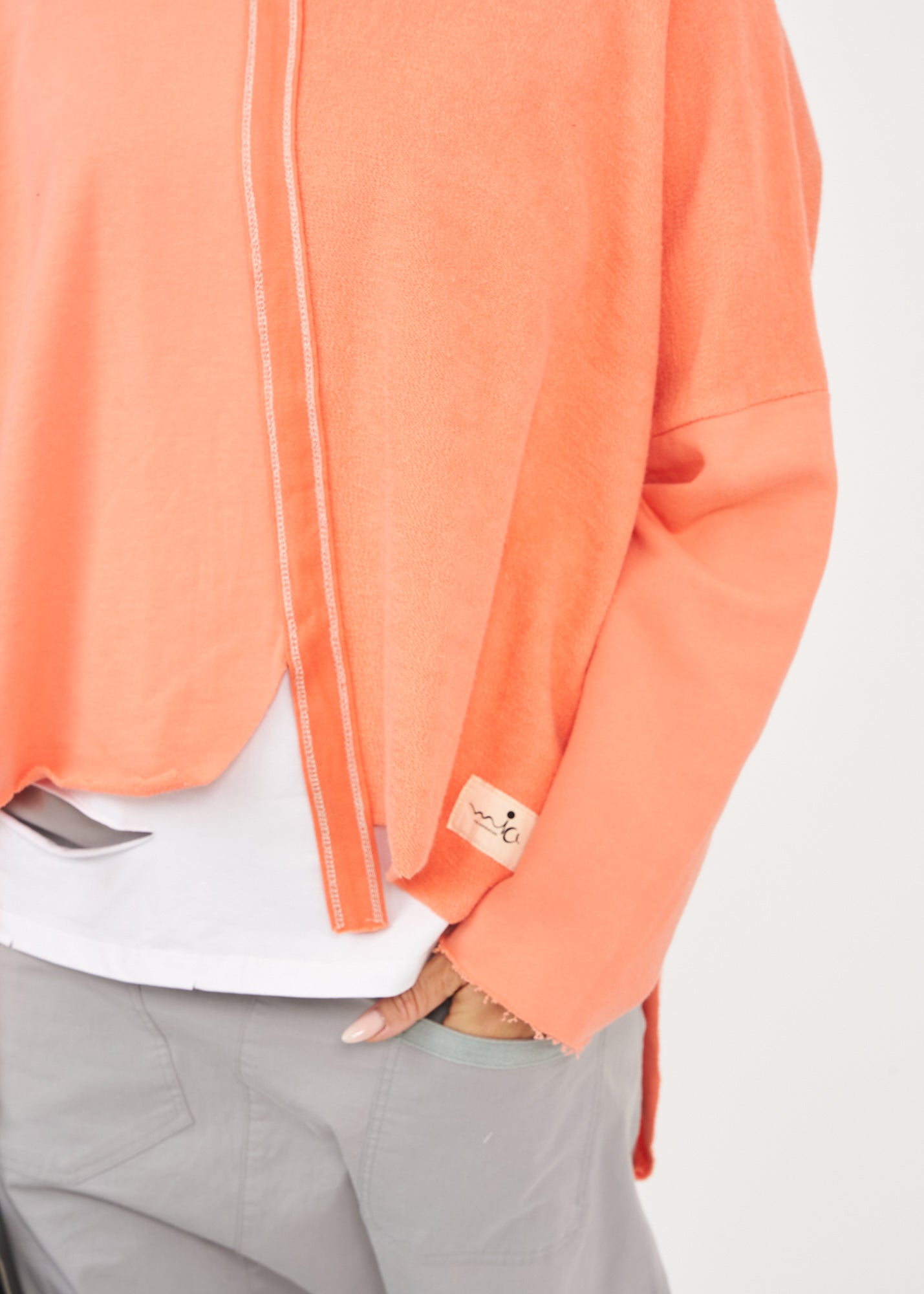 סווטשירט בגזרת אוברסייז משוחררת ונוחה, בעיצוב אסימטרי מיוחד עם שילוב של שני סוגי בדים שונים היוצרים יחד קונטרסט מרקמים מעניין ומראה אופנתי, בנוסף לסרט דקורטיבי העובר לאורך החזית והגב, היוצר קו מעניין שמדגיש את המבנה הייחודי של הפריט ומוסיף מימד עיצובי מתוחכם.
