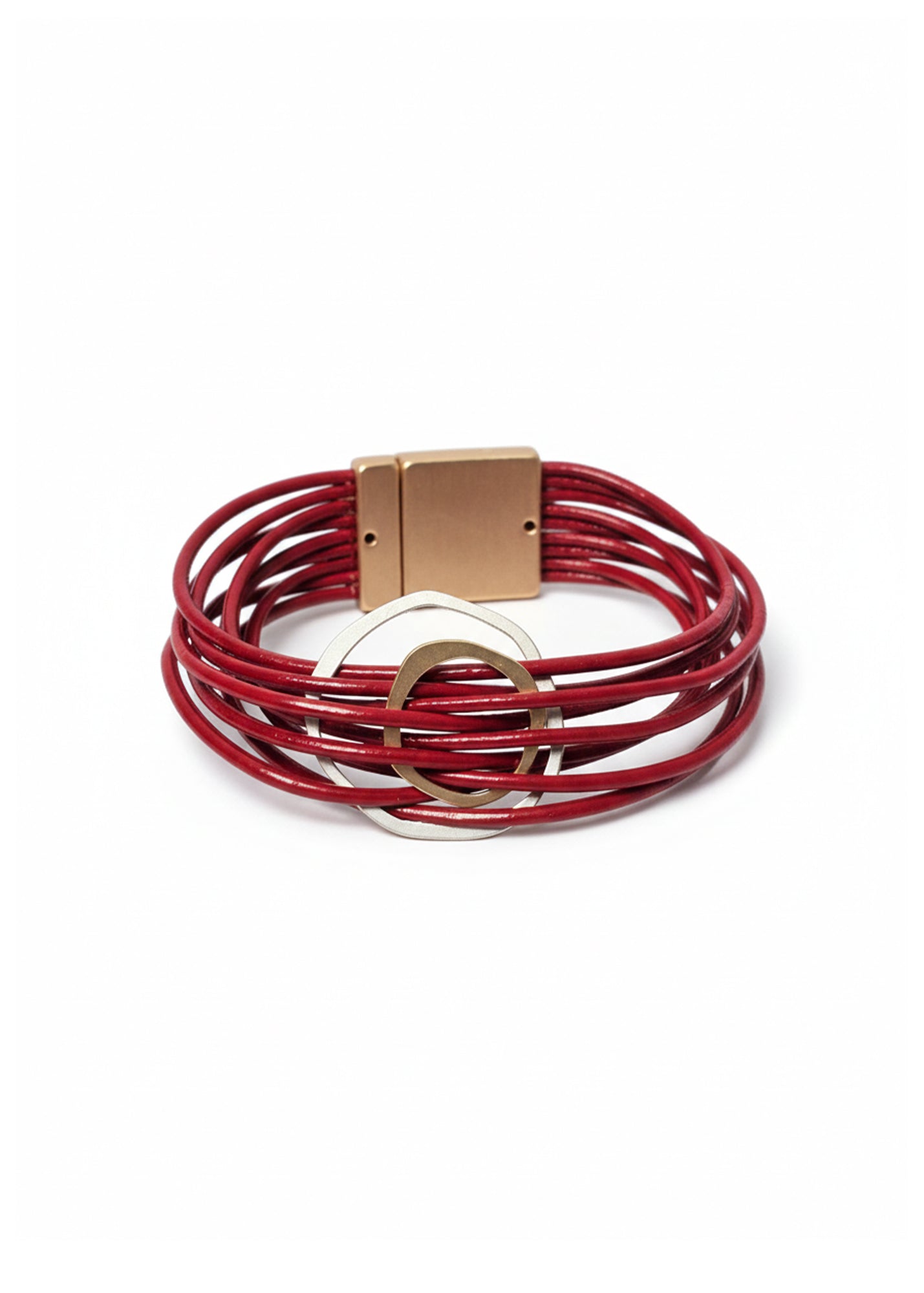 צמיד חוטי עור דקים ושני עיגולים אסימטריים אדום