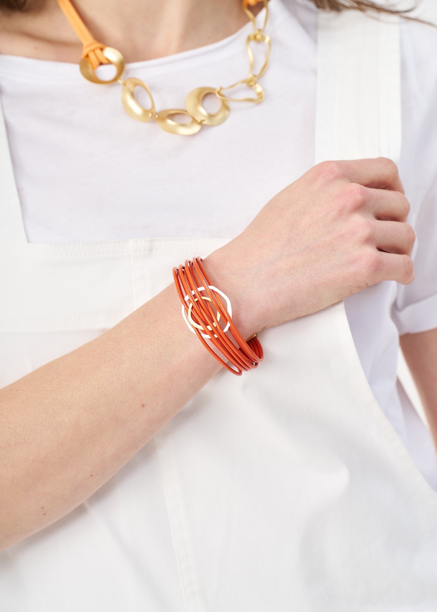 צמיד חוטי עור דקים ושני עיגולים אסימטריים כתום