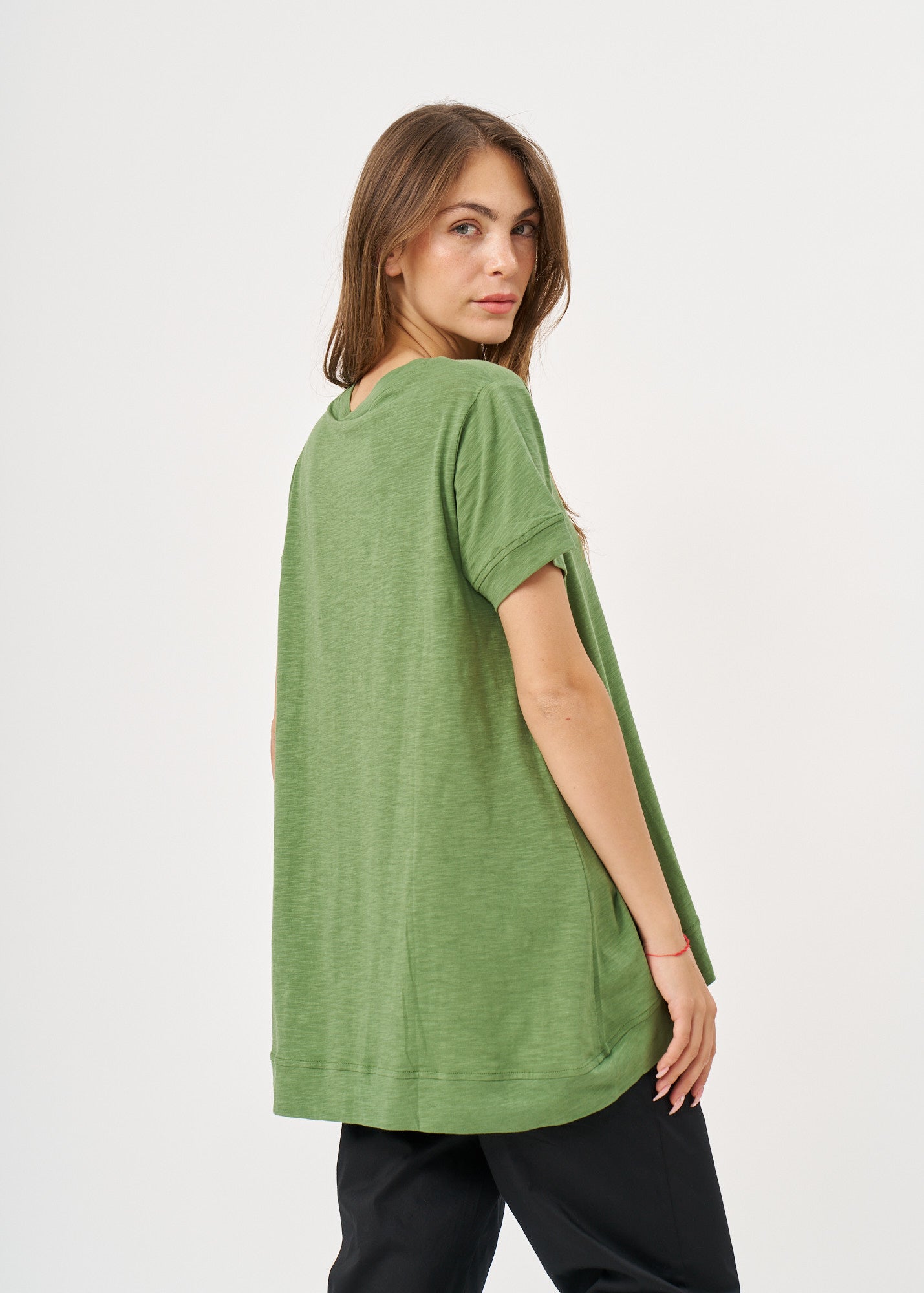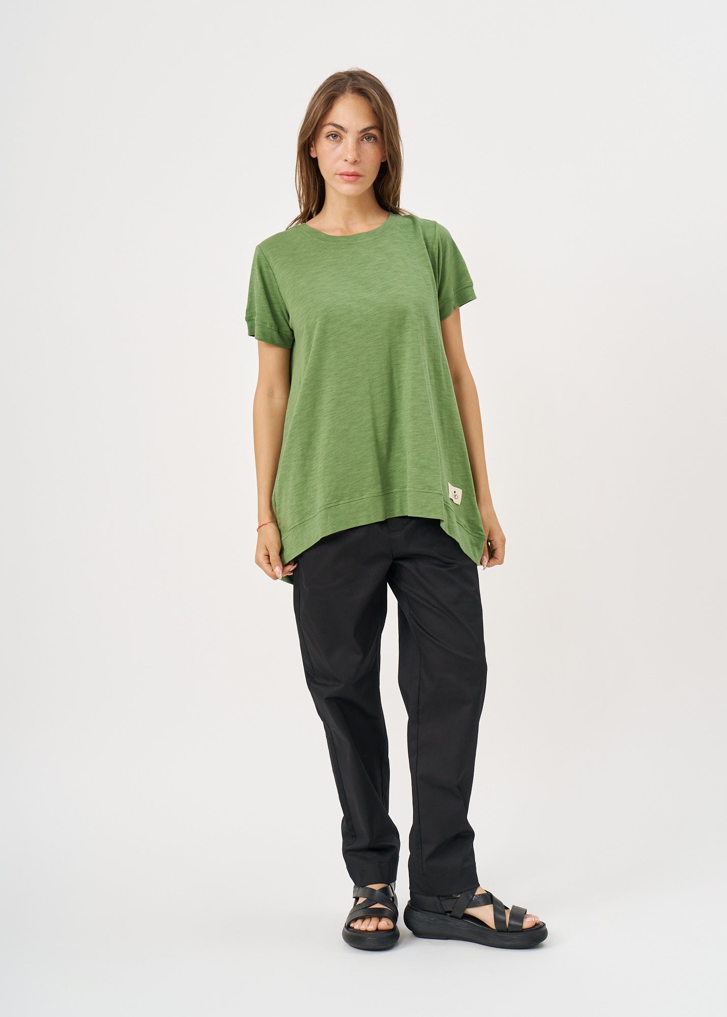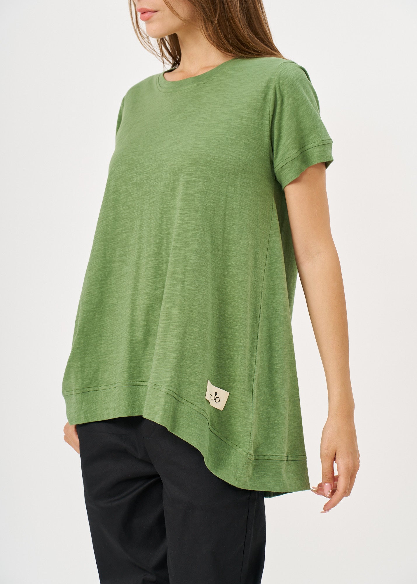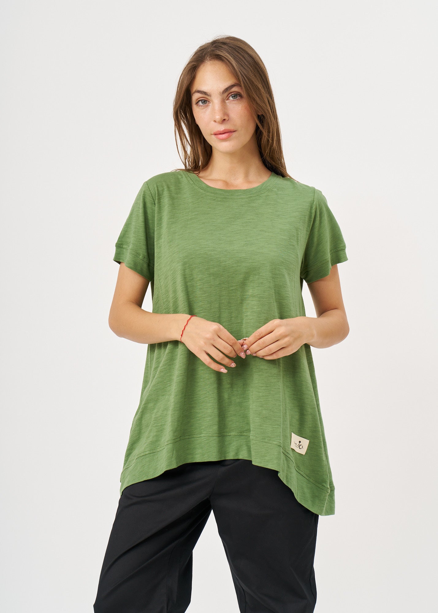 Зеленая рубашка с короткими рукавами и расклешенным низом