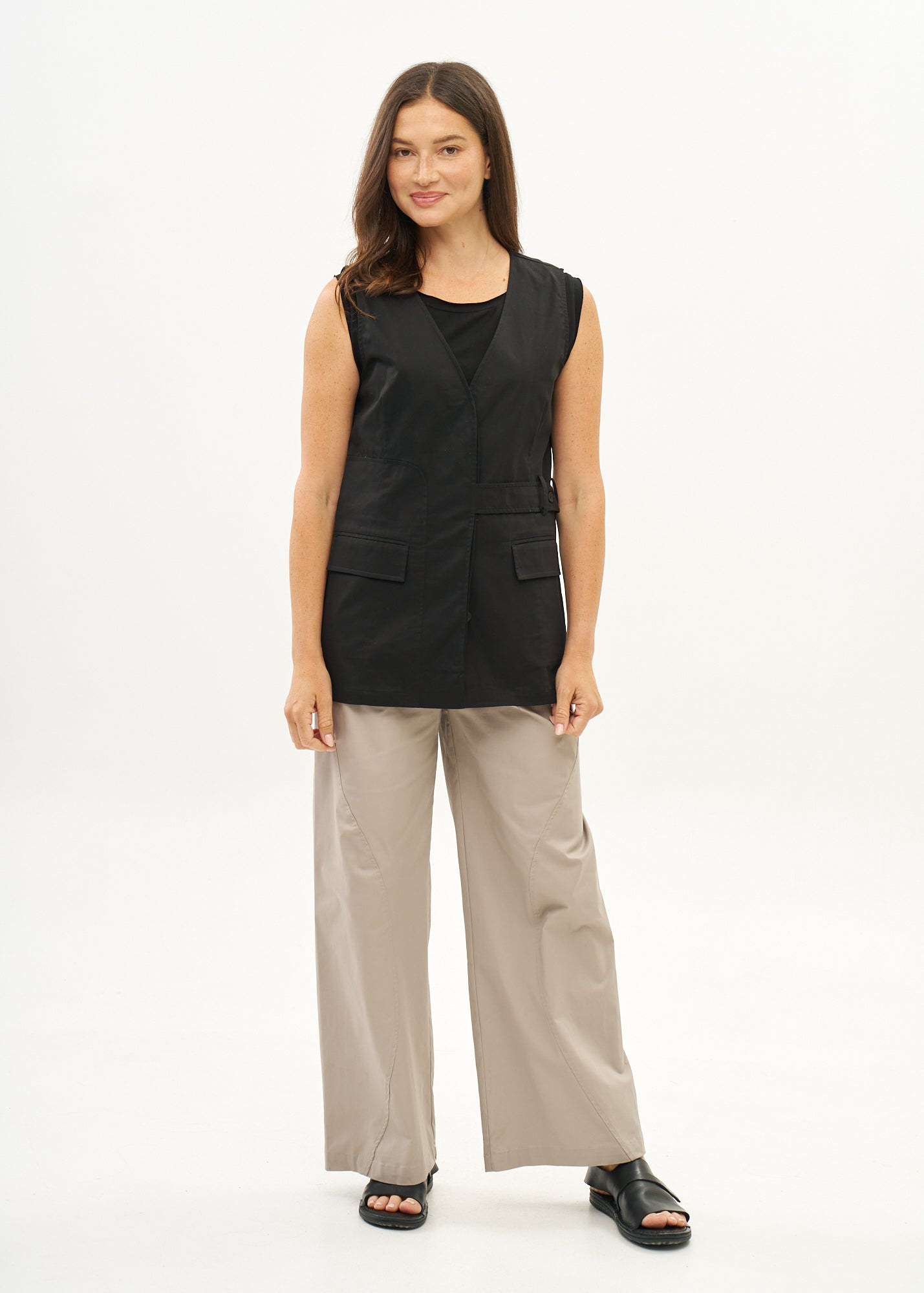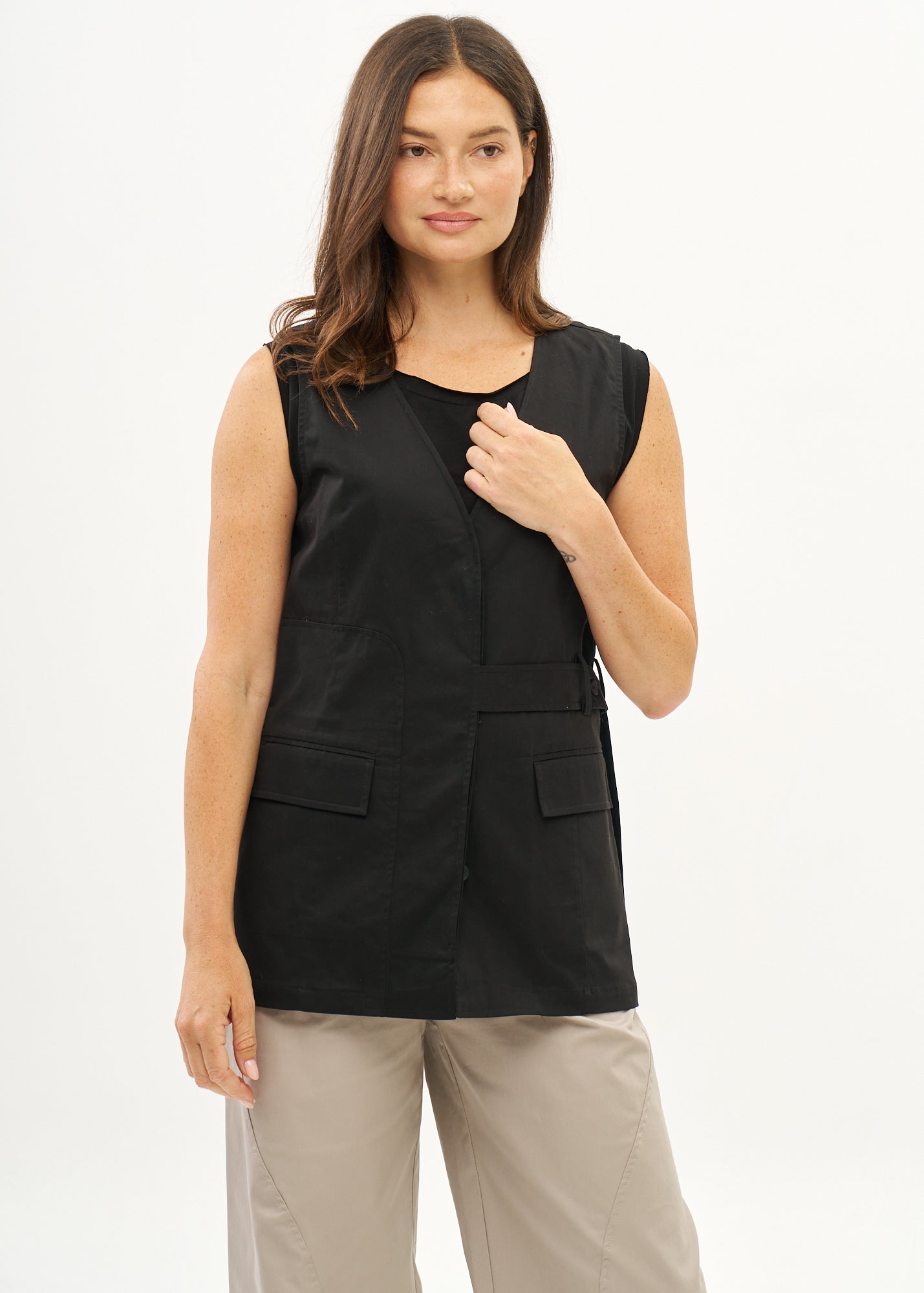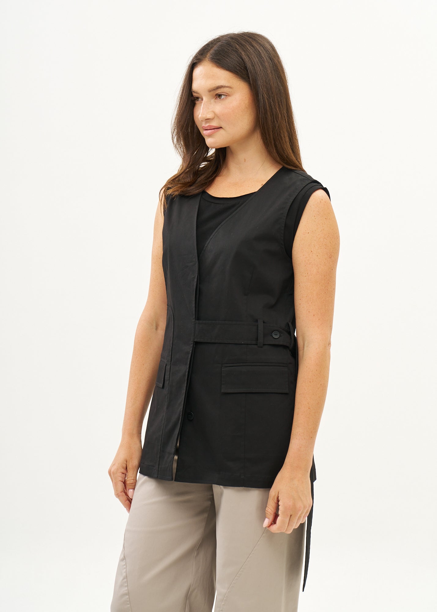 וסט ארוך מעוצב בעל צווארון וי רחב ופתוח, שני כיסי קרגו, סגירת כפתורים בחזית וחצי חגורה ייחודית עם כפתור בצד.